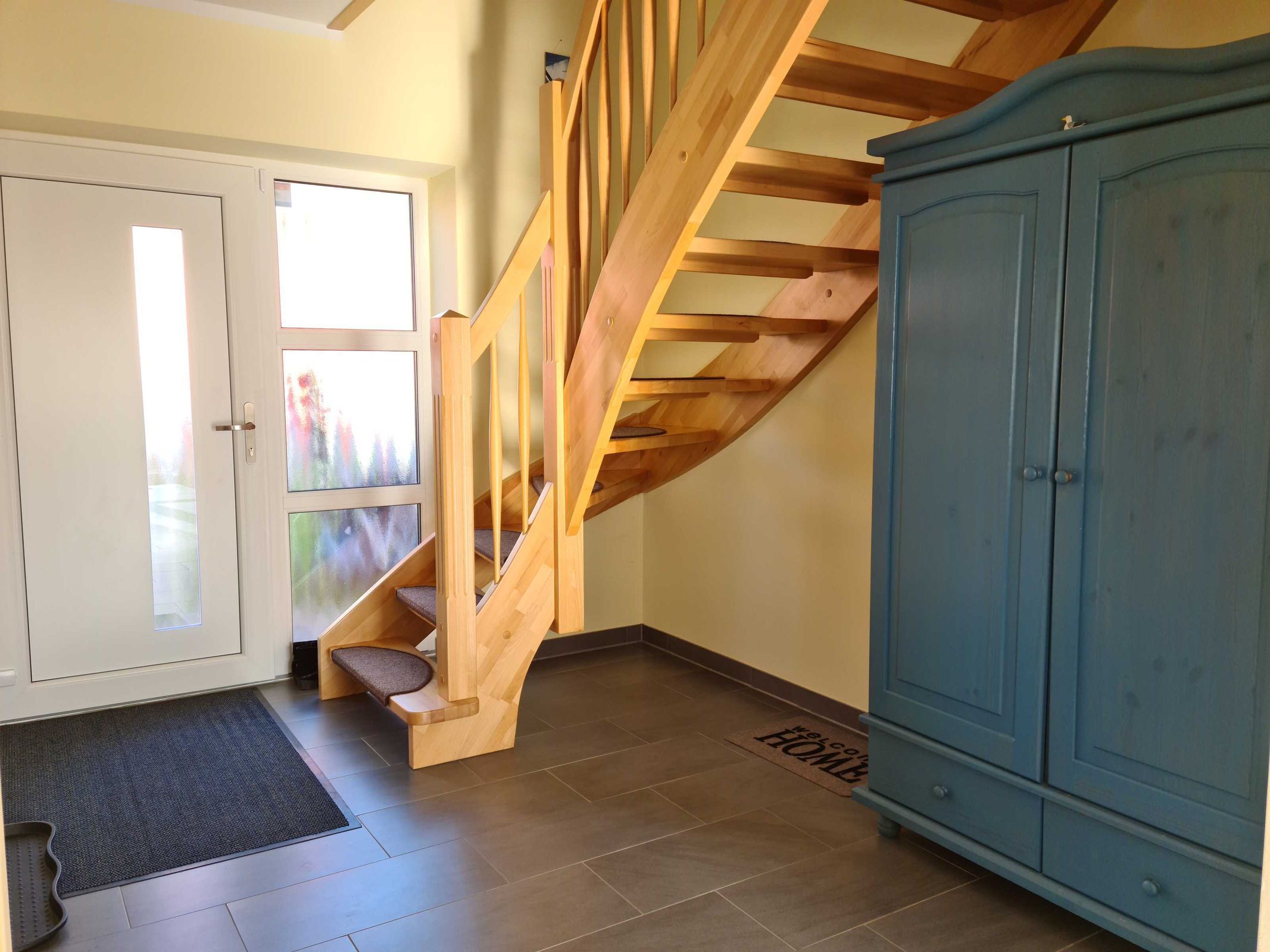 Im Erdgeschoß befindet sich der gemütlich eingerichtete Wohn-/ Küchenbereich mit Kamin, Esstisch für alle Gäste + 1 kostenlosen Kinder-Hochstuhl sowie einem Ausgang zur Terrasse. Ein kleines Bad mit ebenerdiger Dusche und WC befindet sich ebenfalls im Erdgeschoss.