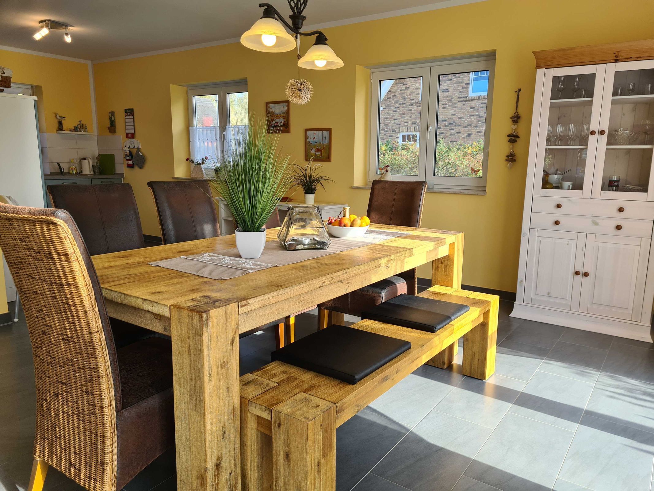 Küchenzeile mit Geschirrspüler, Backofen, Ceran-Kochfeld, Mikrowelle, Kaffeemaschine, Wasserkocher sowie Koch-und Essgeschirr ausgestattet.