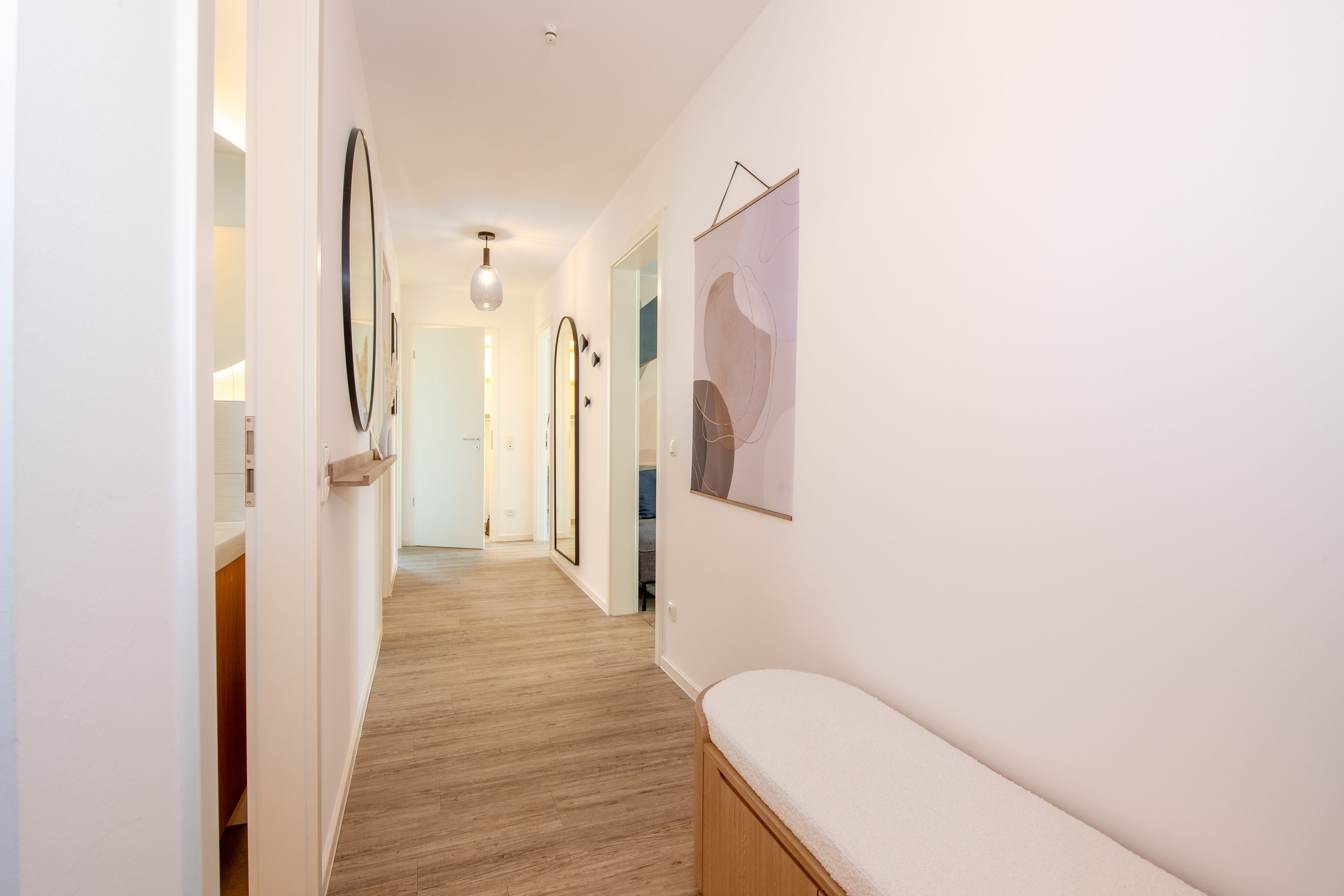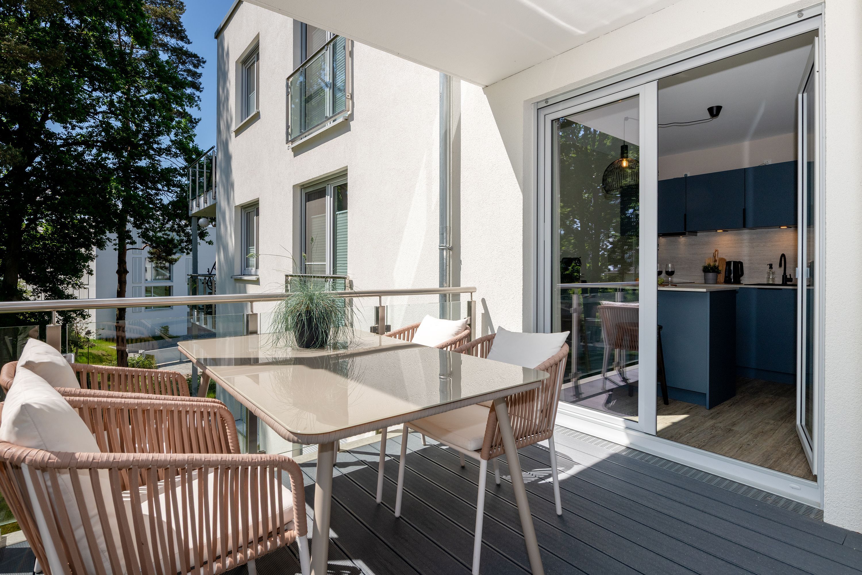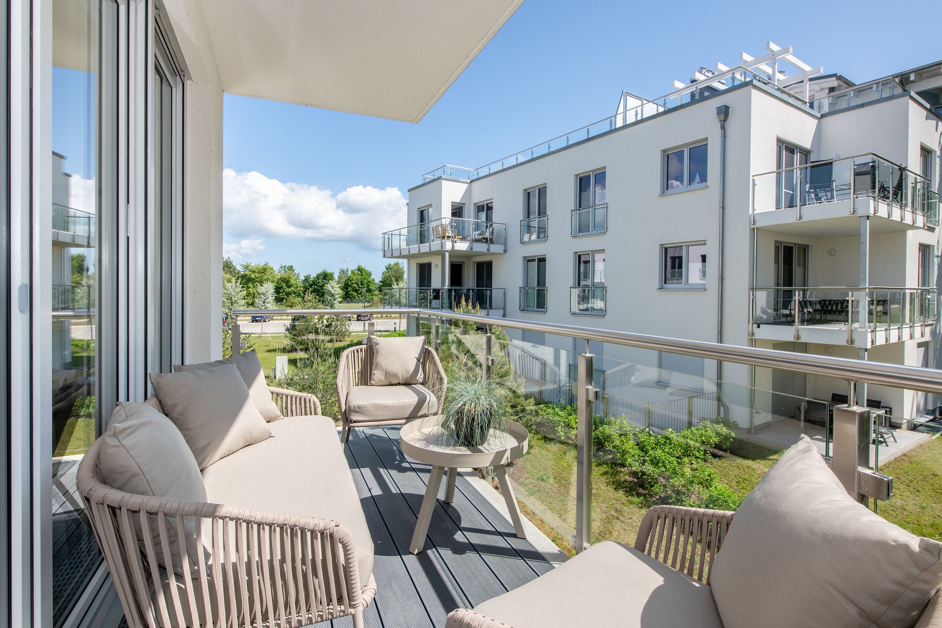 Der sonnige Balkon ist mit gemütlichen Sitzmöbeln und einer Loungeecke ausgestattet ideal für ein Frühstück im Freien oder einen entspannten Tagesausklang mit Blick ins Grüne. Dank des durchdachten Grundrisses genießen bis zu vier Personen höchsten Wohnkomfort perfekt für Paare oder kleine Familien.