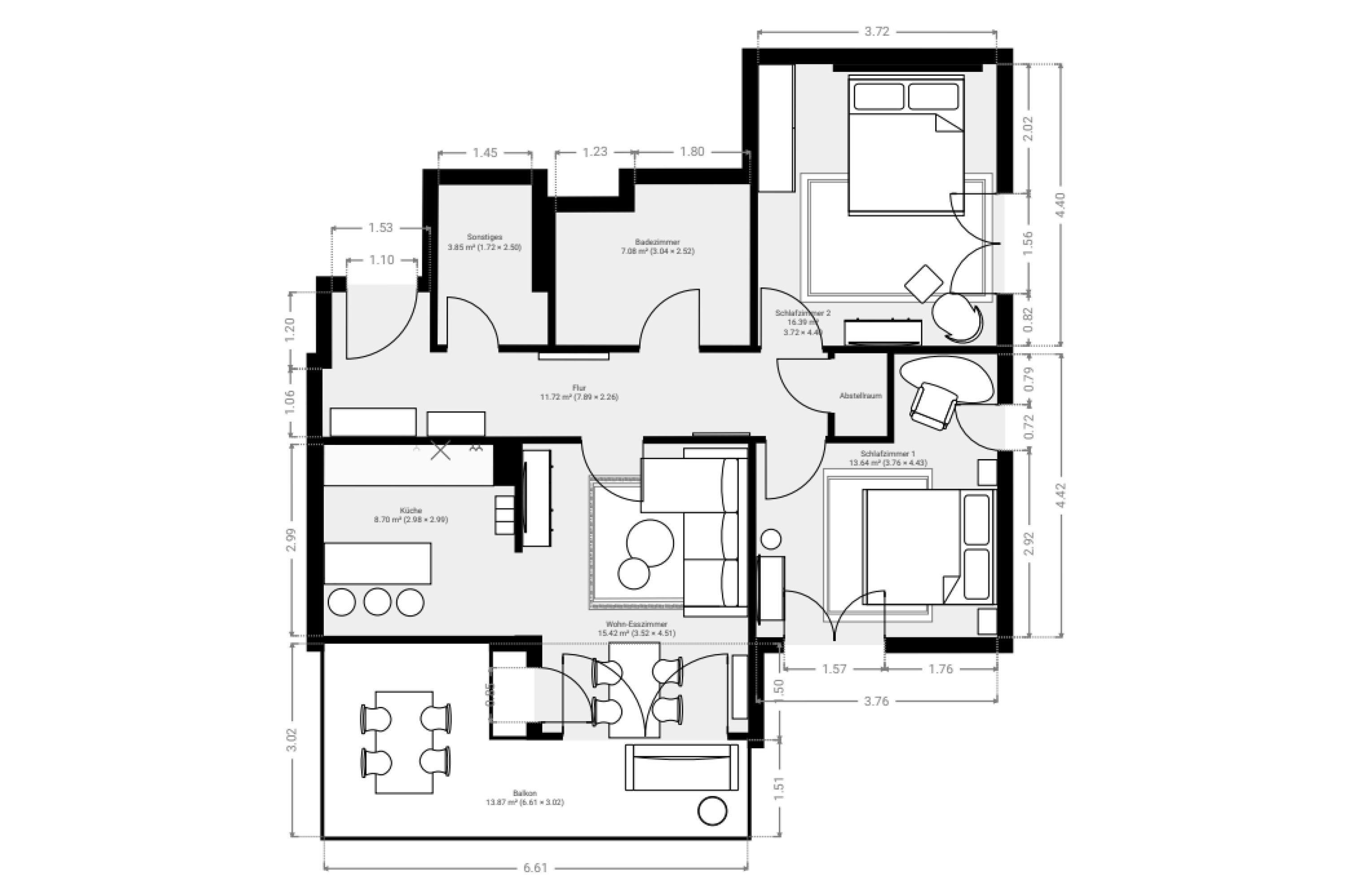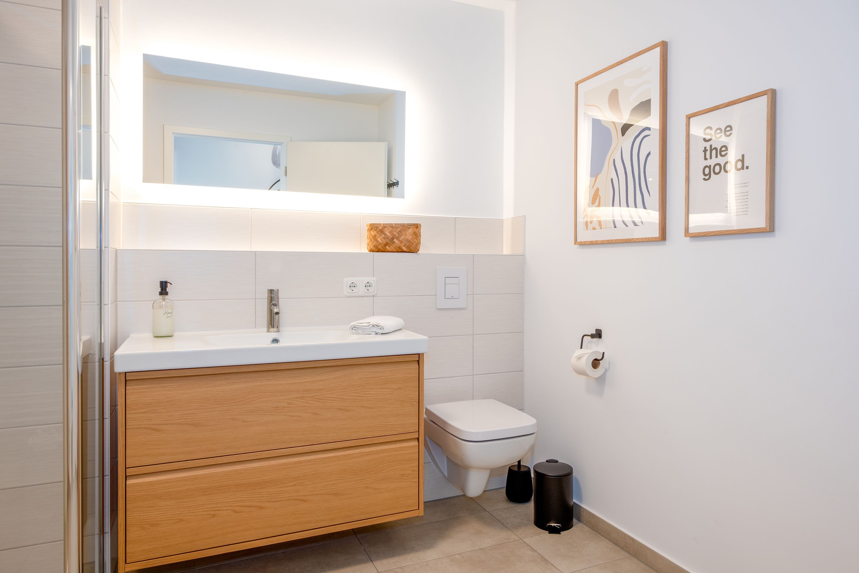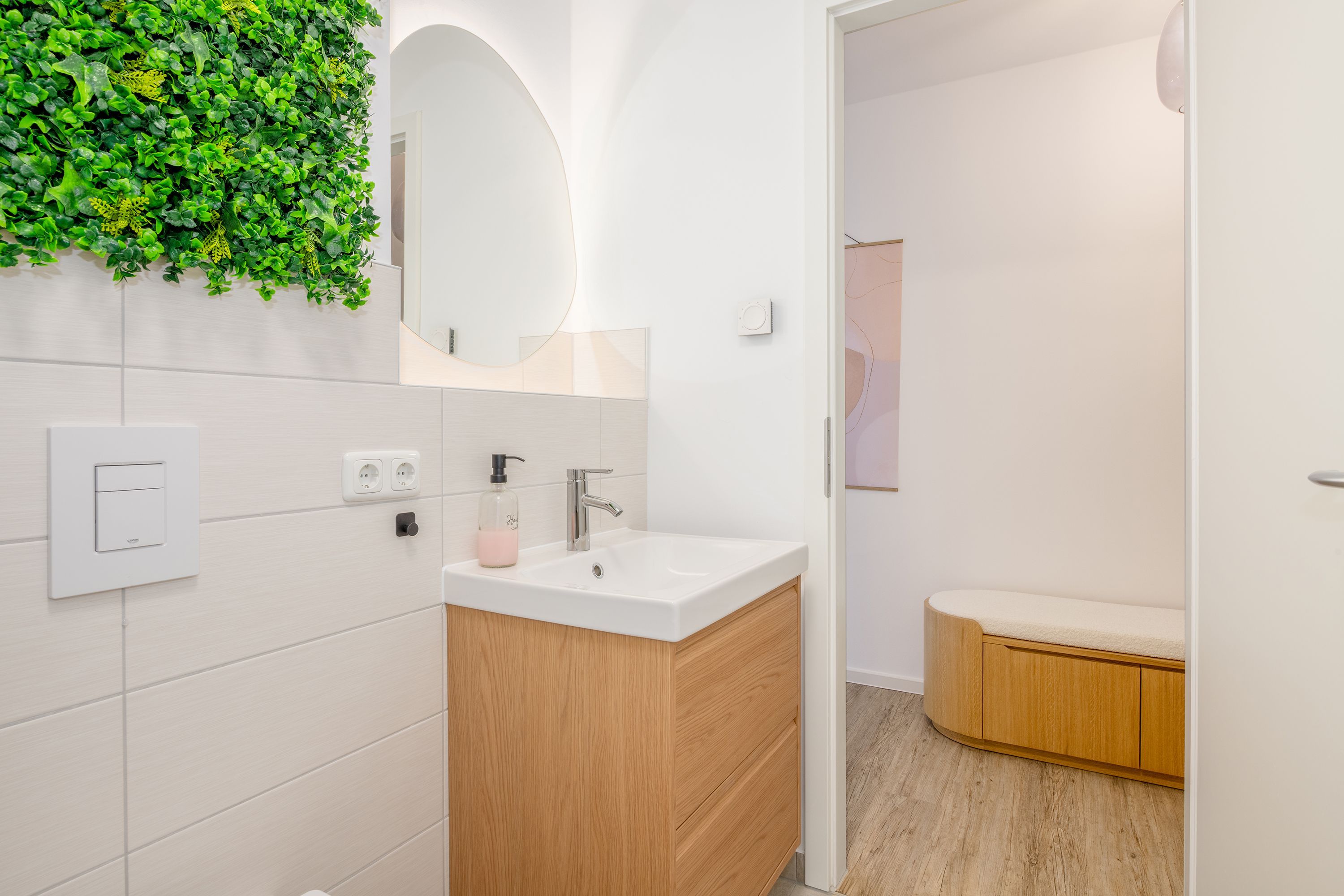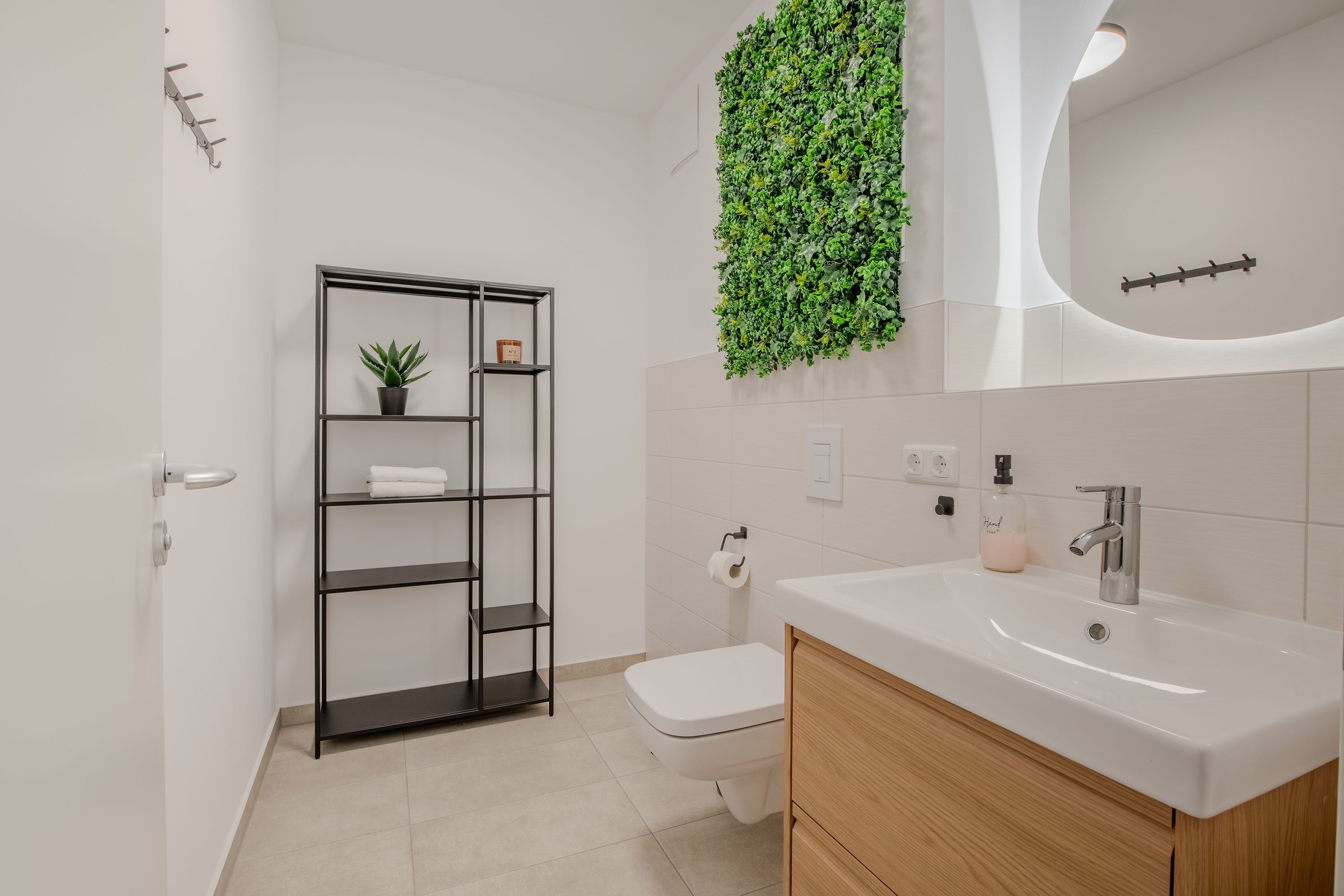 Der sonnige Balkon ist mit gemütlichen Sitzmöbeln und einer Loungeecke ausgestattet ideal für ein Frühstück im Freien oder einen entspannten Tagesausklang mit Blick ins Grüne. Dank des durchdachten Grundrisses genießen bis zu vier Personen höchsten Wohnkomfort perfekt für Paare oder kleine Familien.