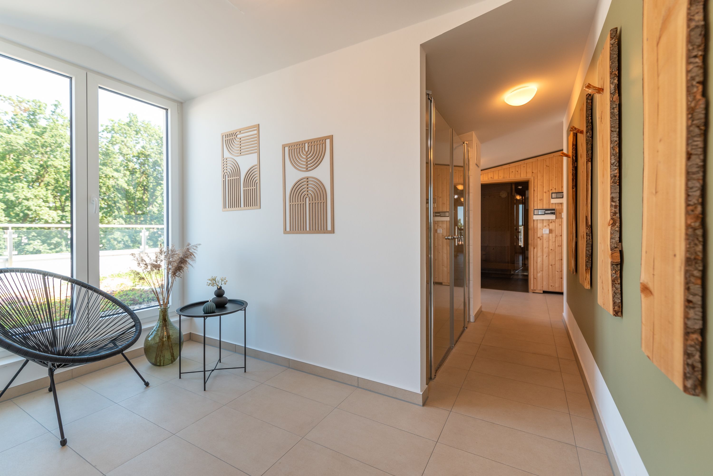 Ein echtes Highlight ist der hauseigene Wellnessbereich im Dachgeschoss: Drei Saunen, ein stilvoller Ruheraum und eine Dachterrasse mit Weitblick über das Stetiger Haff laden zum Entspannen ein und das ganz ohne Aufpreis.