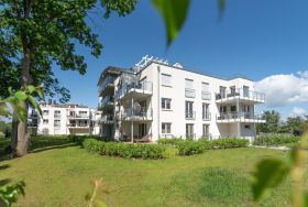 Der offene Wohnbereich mit gemütlichem Sofa, Smart-TV und kleiner Kinderspielecke bietet viel Raum zum Entspannen. Die angrenzende Küche ist komplett ausgestattet und ideal für gemeinsames Kochen. Vom Wohnbereich aus gelangen Sie auf den sonnigen Balkon, der mit bequemen Sitzmöbeln mit Blick auf das Stettiner Haff zum Frühstücken, Lesen oder Verweilen im Freien einlädt.
