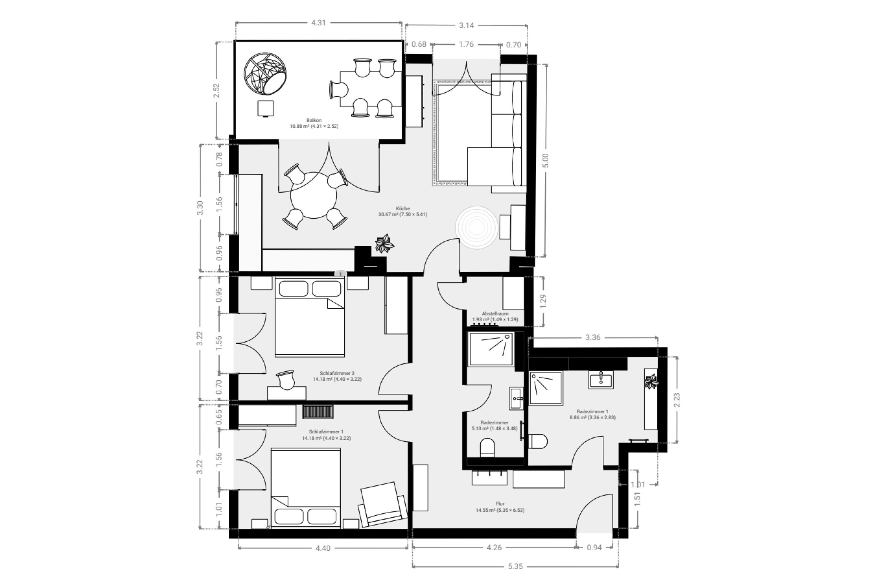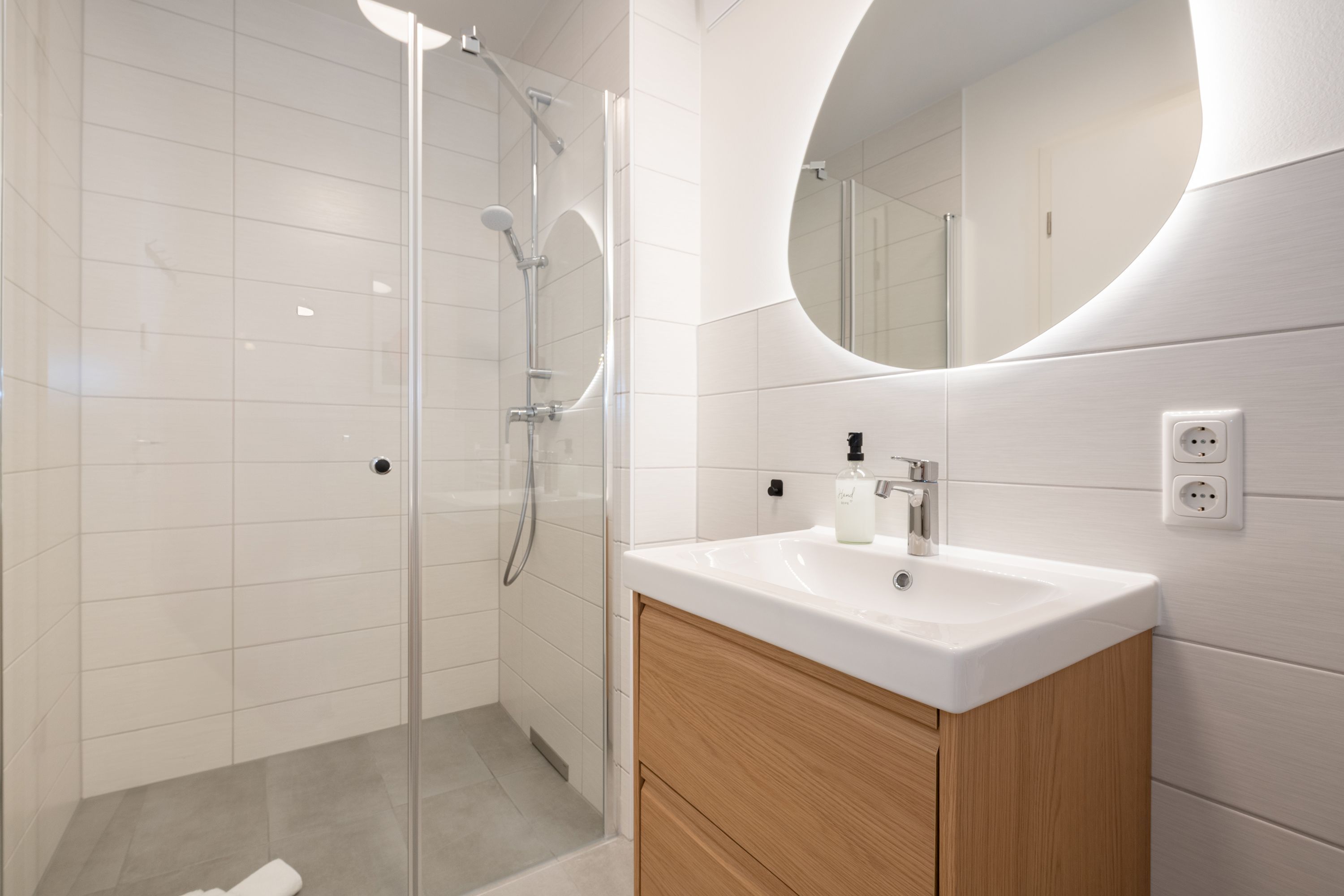 Zwei Schlafzimmer mit hochwertigen Doppelbetten (1,80m x 2,00m) sorgen für erholsame Nächte. Beide Schlafzimmer haben einen Smart-TV. In einem der Zimmer steht zusätzlich ein ausklappbarer Schlafsessel ( 0,8m x 2,00m) für eine fünfte Person bereit. Zwei moderne Bäder ergänzen das Wohnkonzept.
