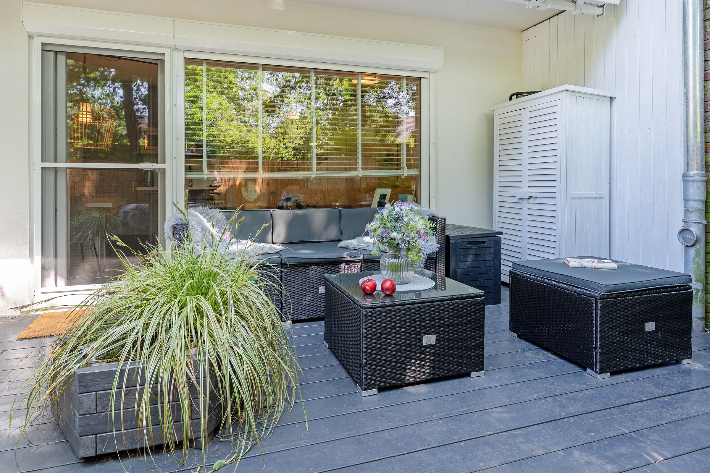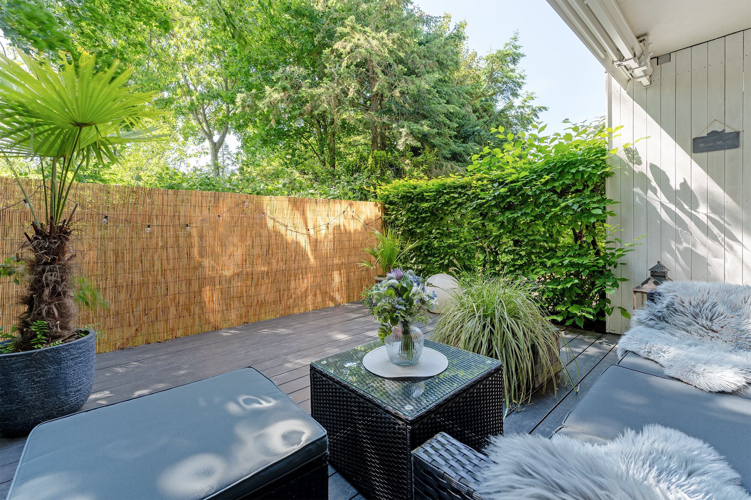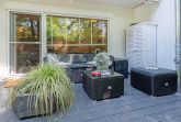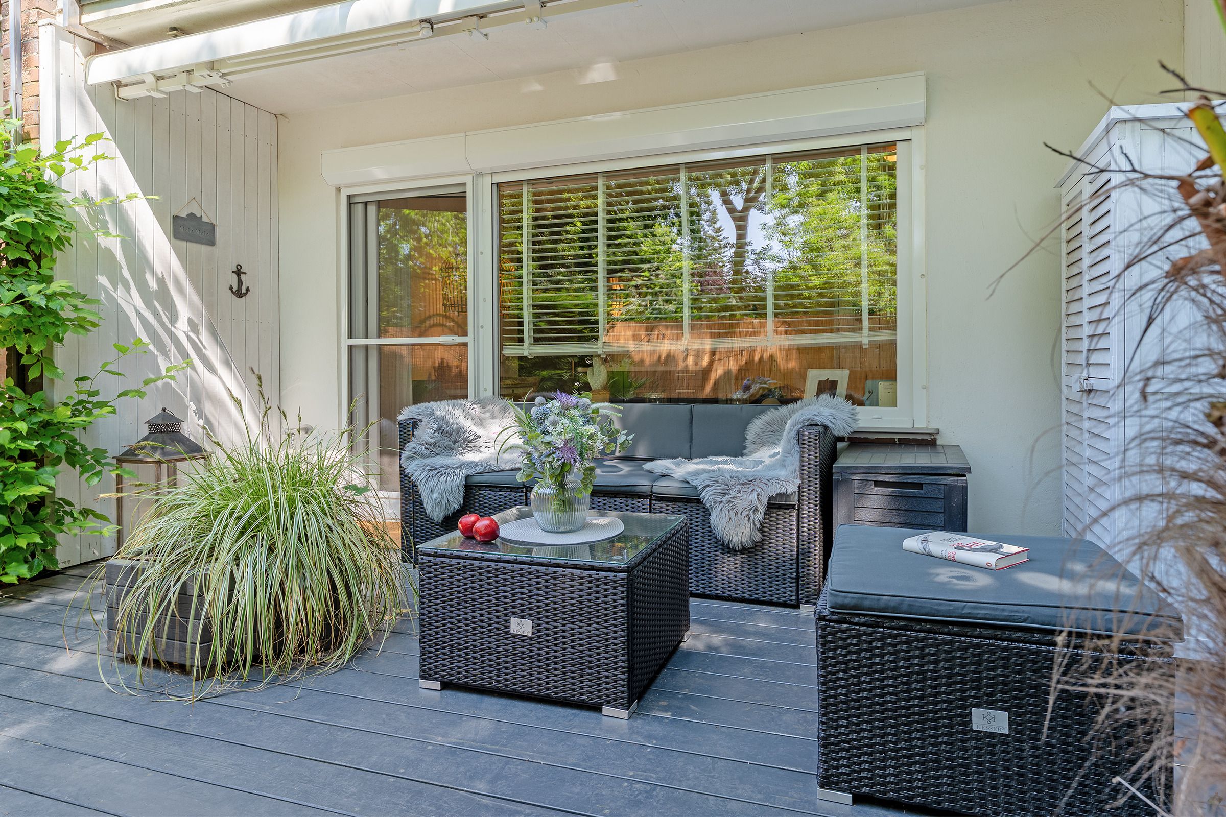 Der kombinierte Wohn- und Schlafbereich ist stilvoll und funktional eingerichtet. Ein komfortables Boxspringbett (2x 70x200 cm) sowie eine ausziehbare Schlafcouch (180x200 cm) bieten flexible Schlafmöglichkeiten. Die integrierte Küchenzeile ist bestens ausgestattet. Die frisch zubereiteten Mahlzeiten genießen Sie am angrenzenden Esstisch – oder auf der überdachten, möblierten Terrasse, die zum Verweilen an der frischen Ostseeluft einlädt. Kaffee-Liebhaber aufgepasst: Sie können sich auf eine Senseo-Kaffeemaschine (Pads) und eine Nespresso De'Longhi Citiz (Kapseln) freuen. Zur technischen Ausstattung gehören ein Flachbildfernseher, Bluetooth-Lautsprecher und WLAN-Zugang – für entspannte Stunden bei jedem Wetter.