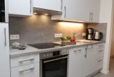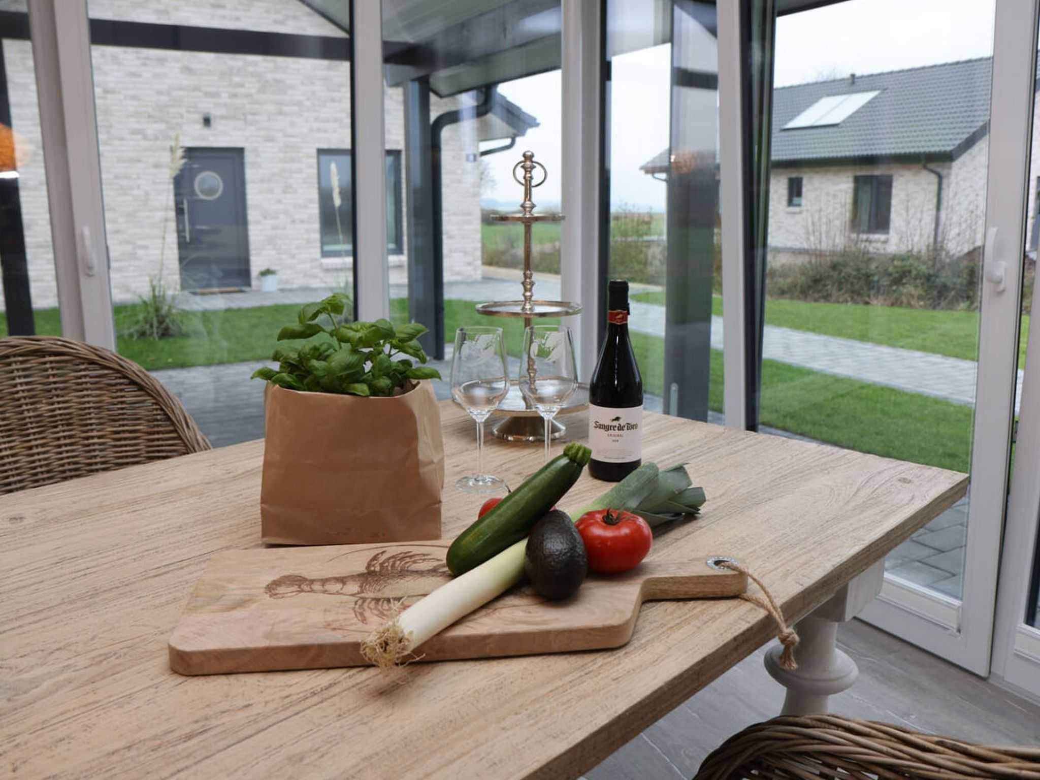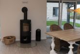 • Wohn- und Essbereich mit offener Küche, massivem Esstisch (2,50 m lang), Induktionskochfeld, Kaminofen und anliegender Terrasse
