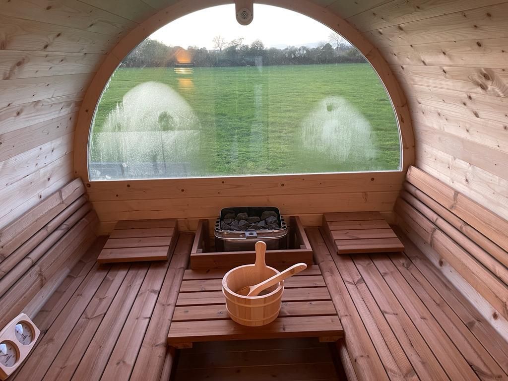 Die separate Fass Sauna mit Außendusche steht für 30,00 Euro pro Stunde allen Gästen zur Verfügung. Sie gestattet 2 Personen einen Saunagang im Liegen und 4 Personen im Sitzen.