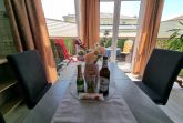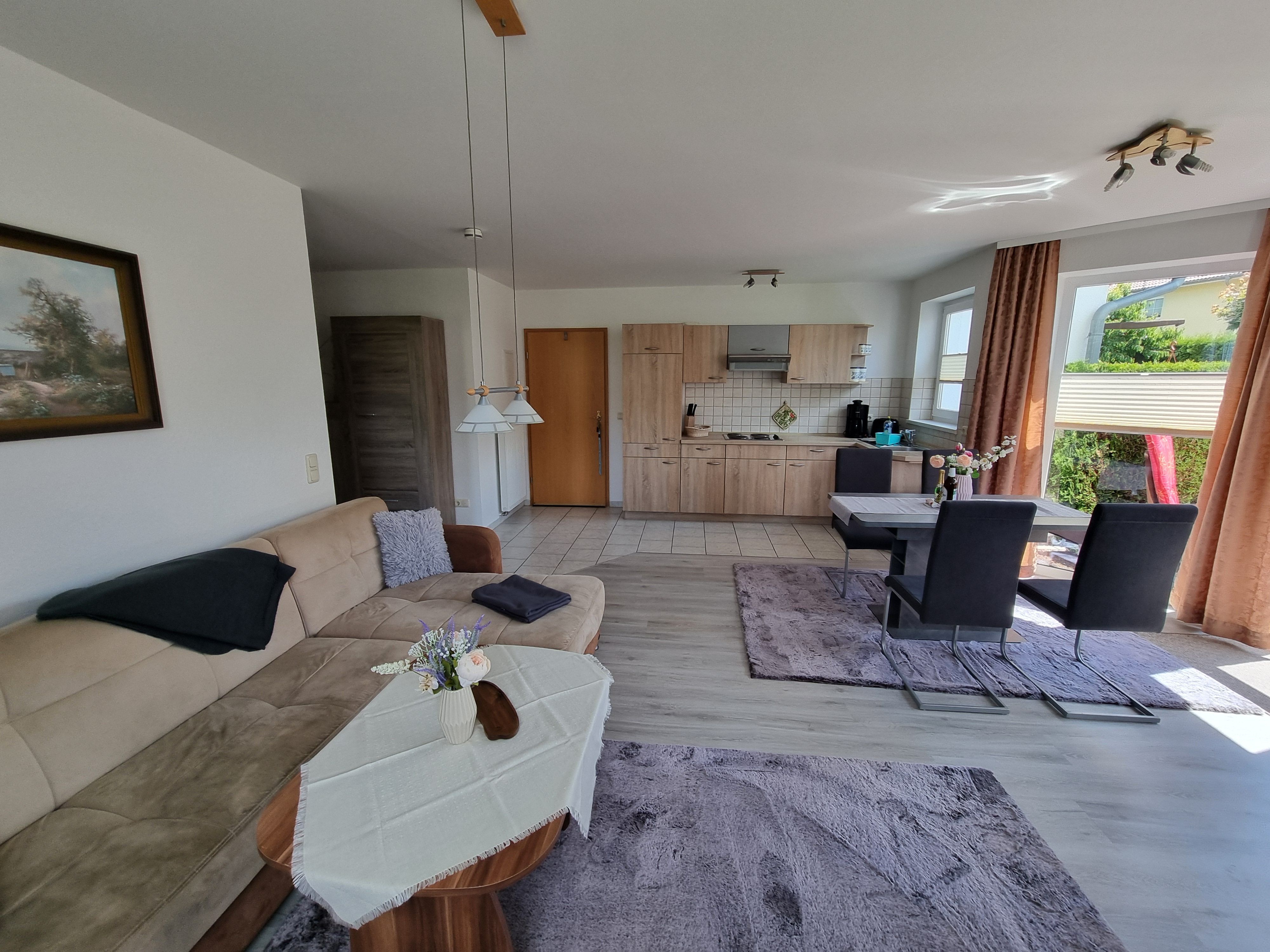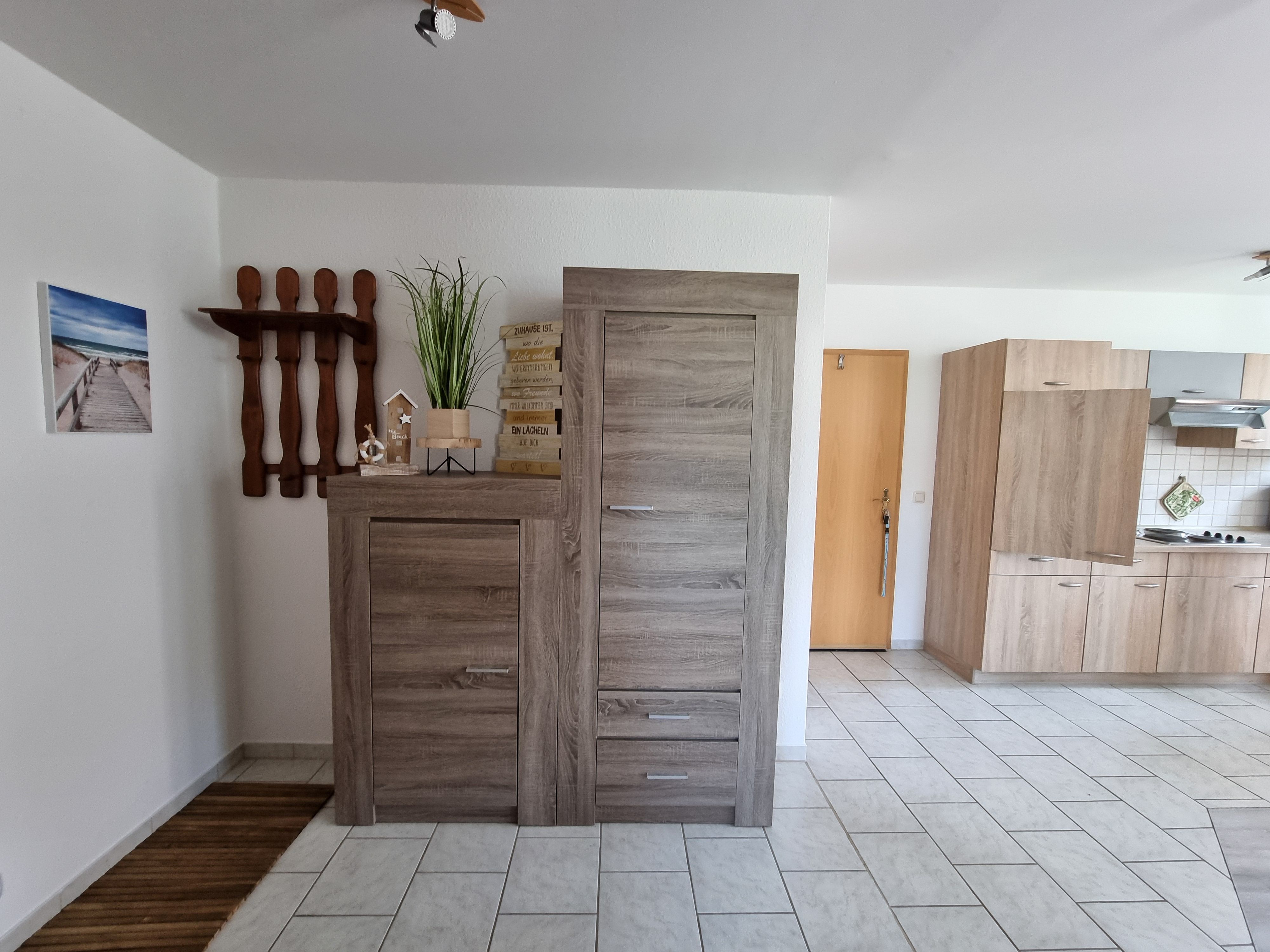 Die Ferienwohnung hat ein Schlafzimmer mit einem großen Doppelbett und ein Wohnbereich mit offener Küche. Es gibt eine gemütliche Couch, SAT-TV und eine gut ausgestattete Küche mit Essbereich.