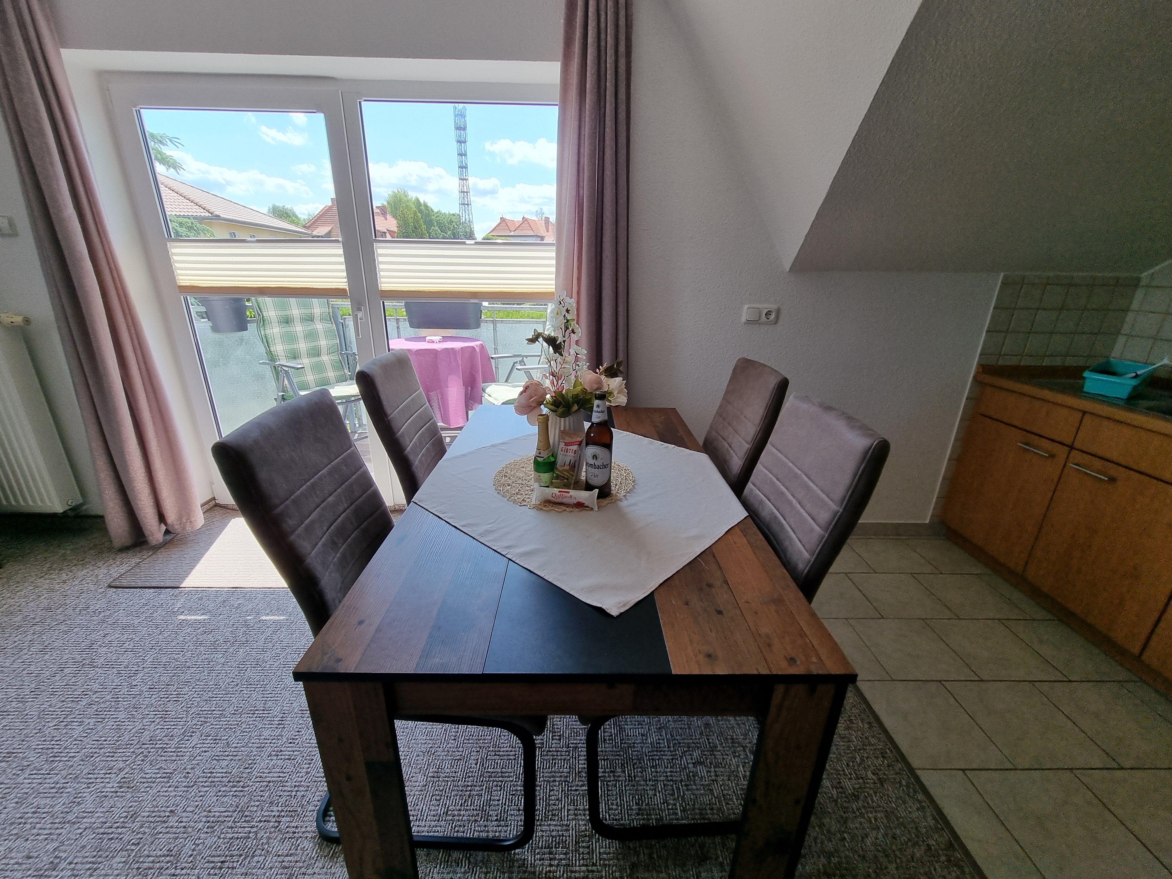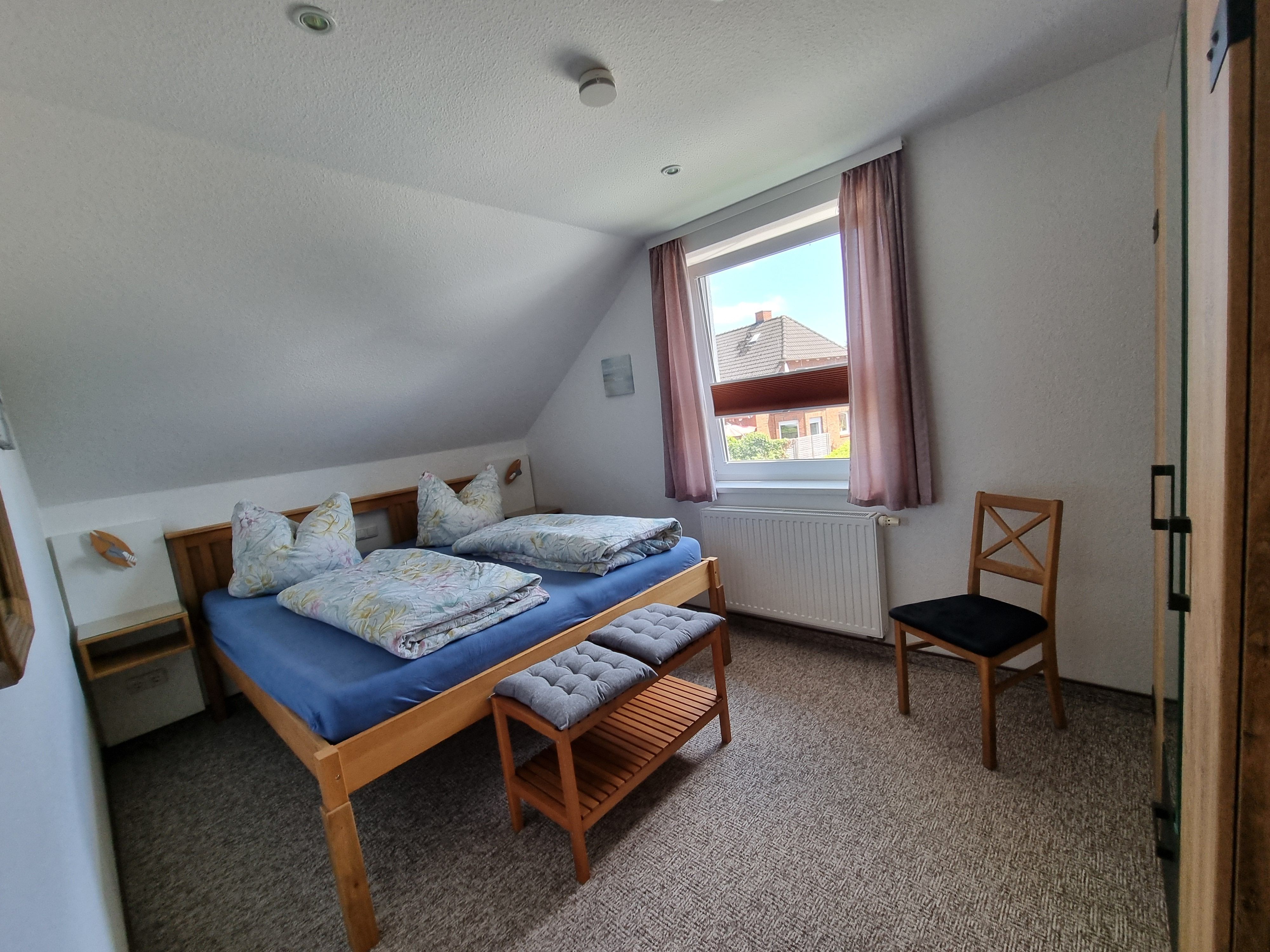 Die Ferienwohnung hat ein Schlafzimmer mit einem großen Doppelbett und ein Wohnbereich mit offener Küche. Es gibt eine gemütliche Couch, SAT-TV und eine gut ausgestattete Küche mit Essbereich.