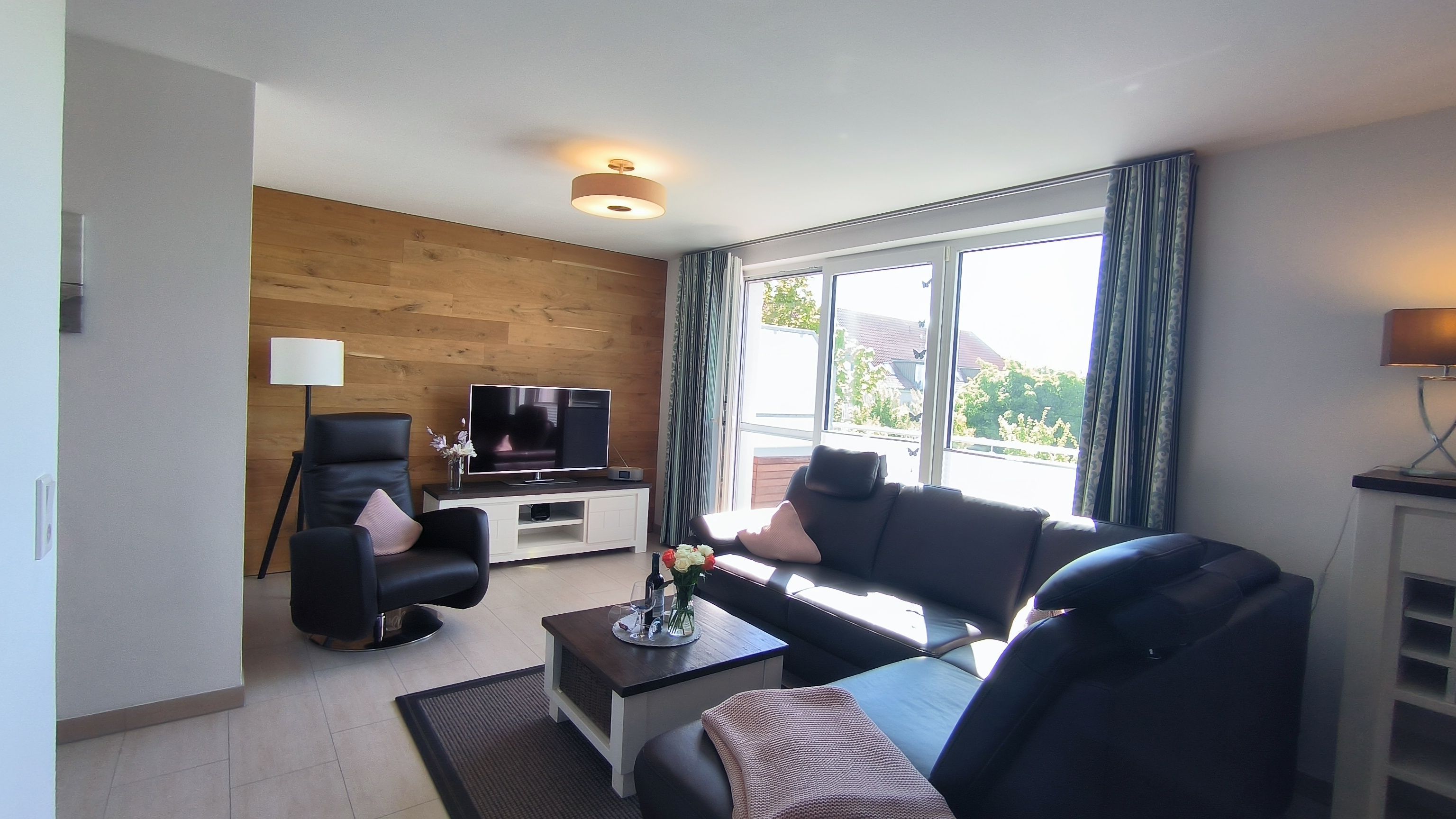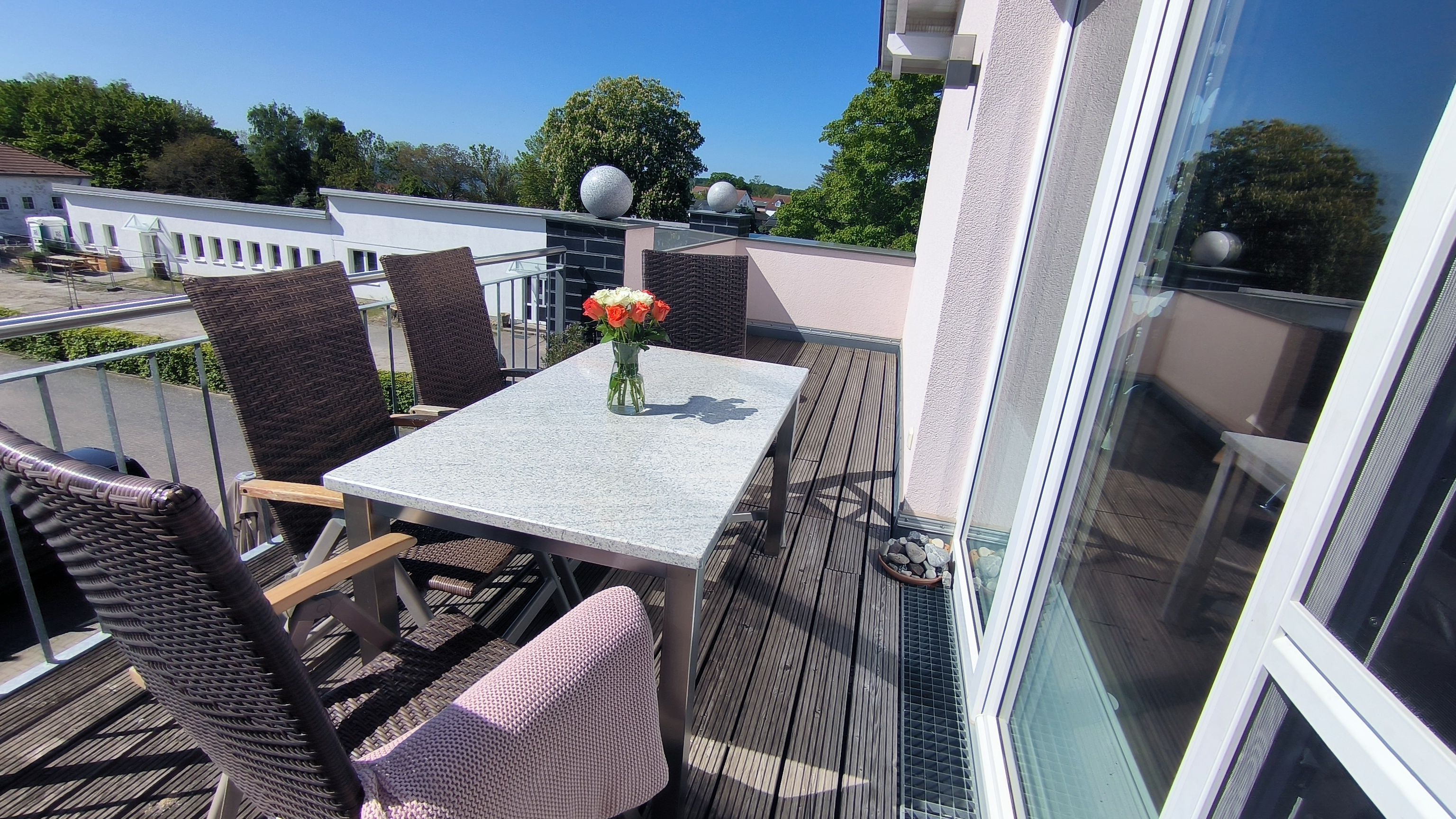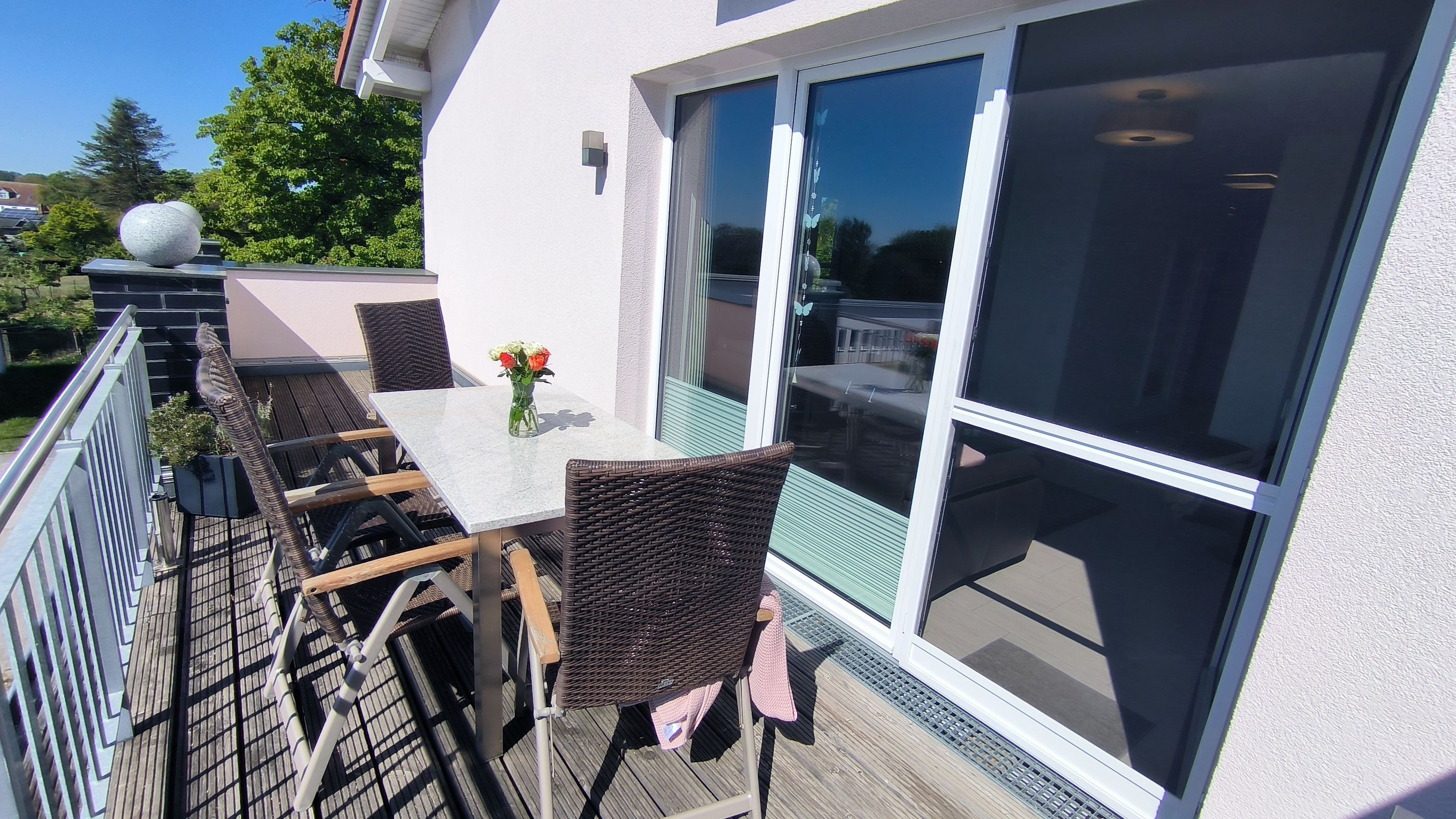Insgesamt 2 Balkone laden zum entspannen und frühstücken ein, wobei der Südbalkon mit kleinem Haffblick über eine Sitzgruppe verfügt.