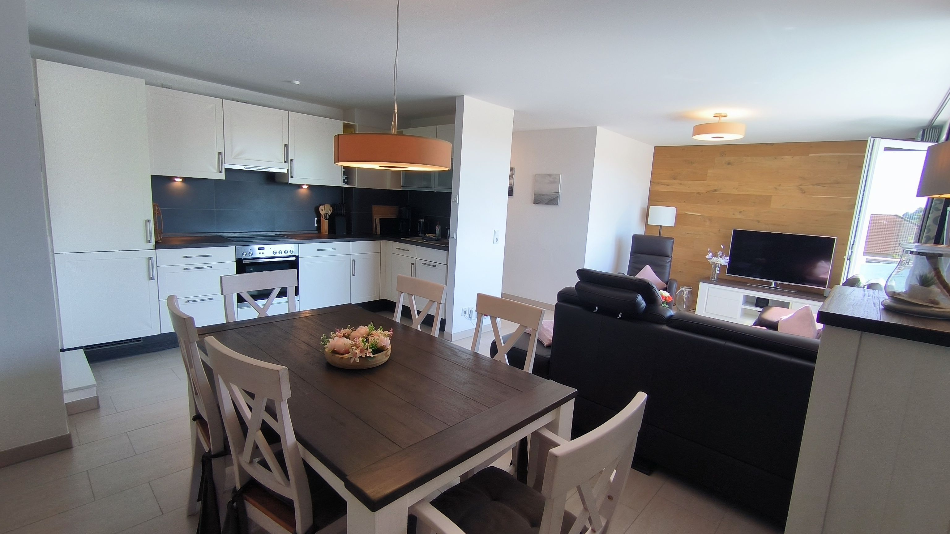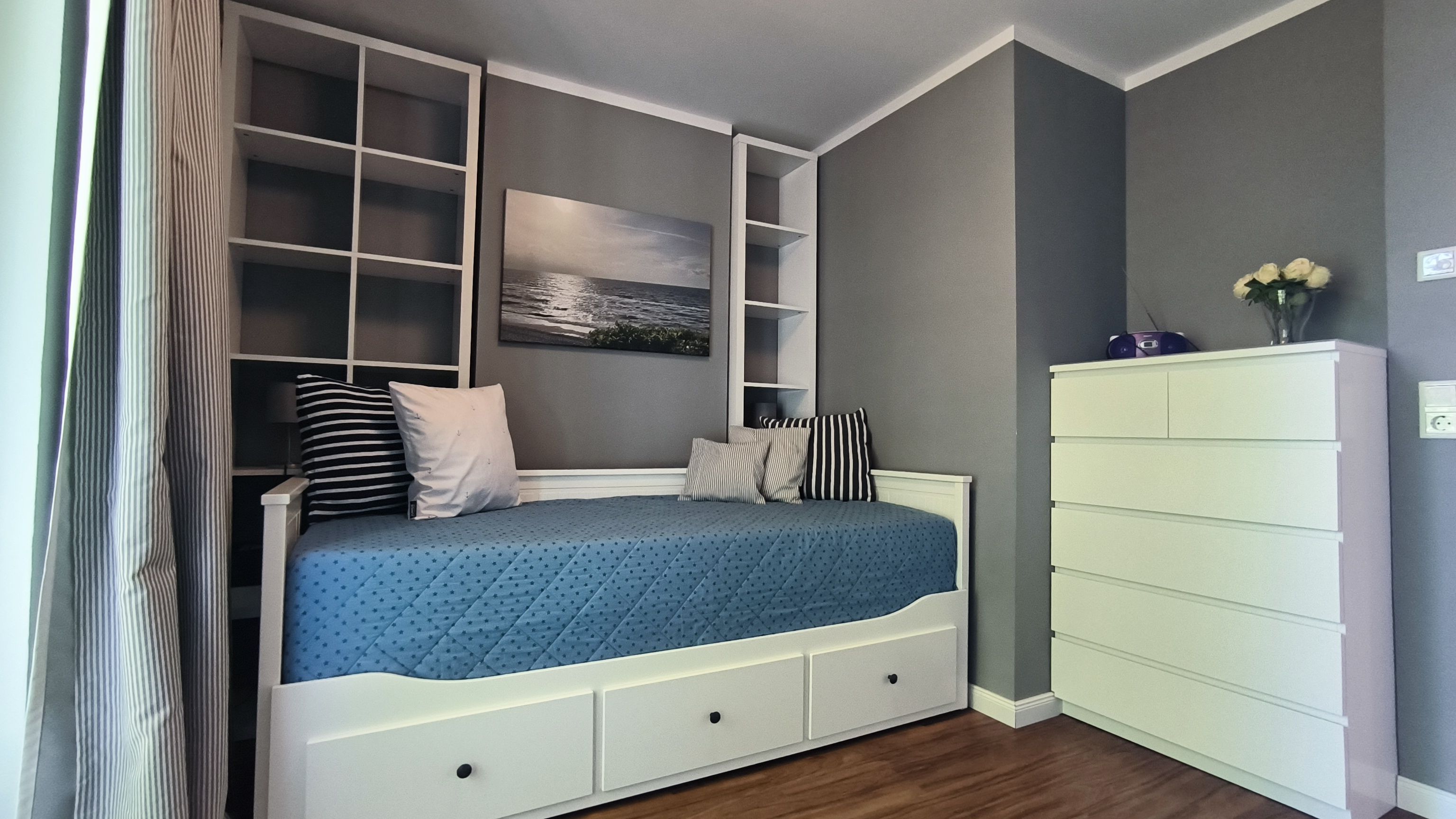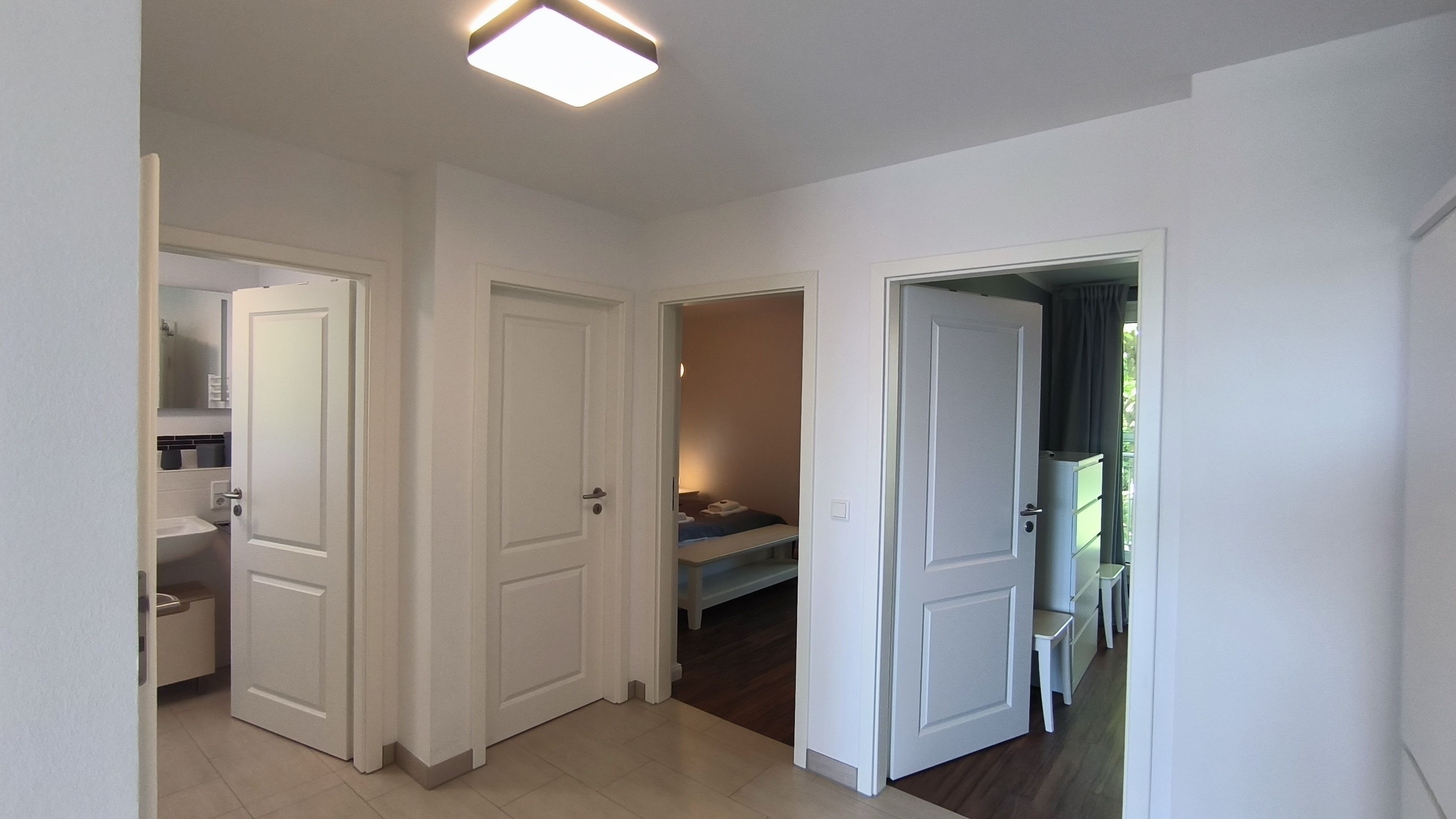 Die Wohnung verfügt über einen großzügigen Wohnbereich mit integrierter Küchenzeile sowie einem komfortablen Essbereich. Sie finden bei uns zwei helle, geräumige Schlafzimmer, die Platz für 2 bis maximal 4 Personen bieten. Ein Schlafzimmer verfügt über ein schönes, komfortables Doppelbett (160x200m). Das andere Schlafzimmer über ein Einzelbett (80x200m), mit einer Ausziehfunktion auf 160x200m.
