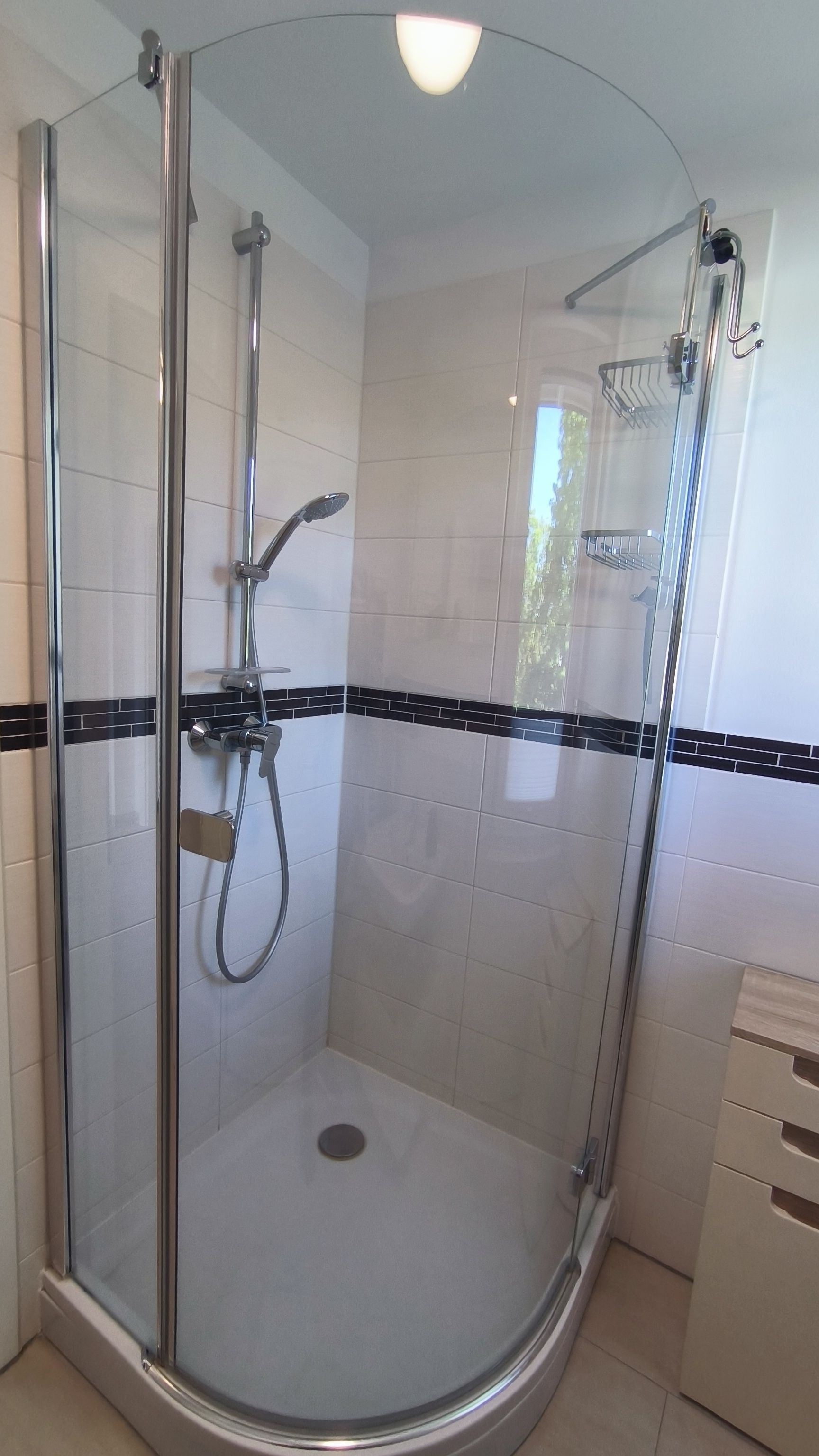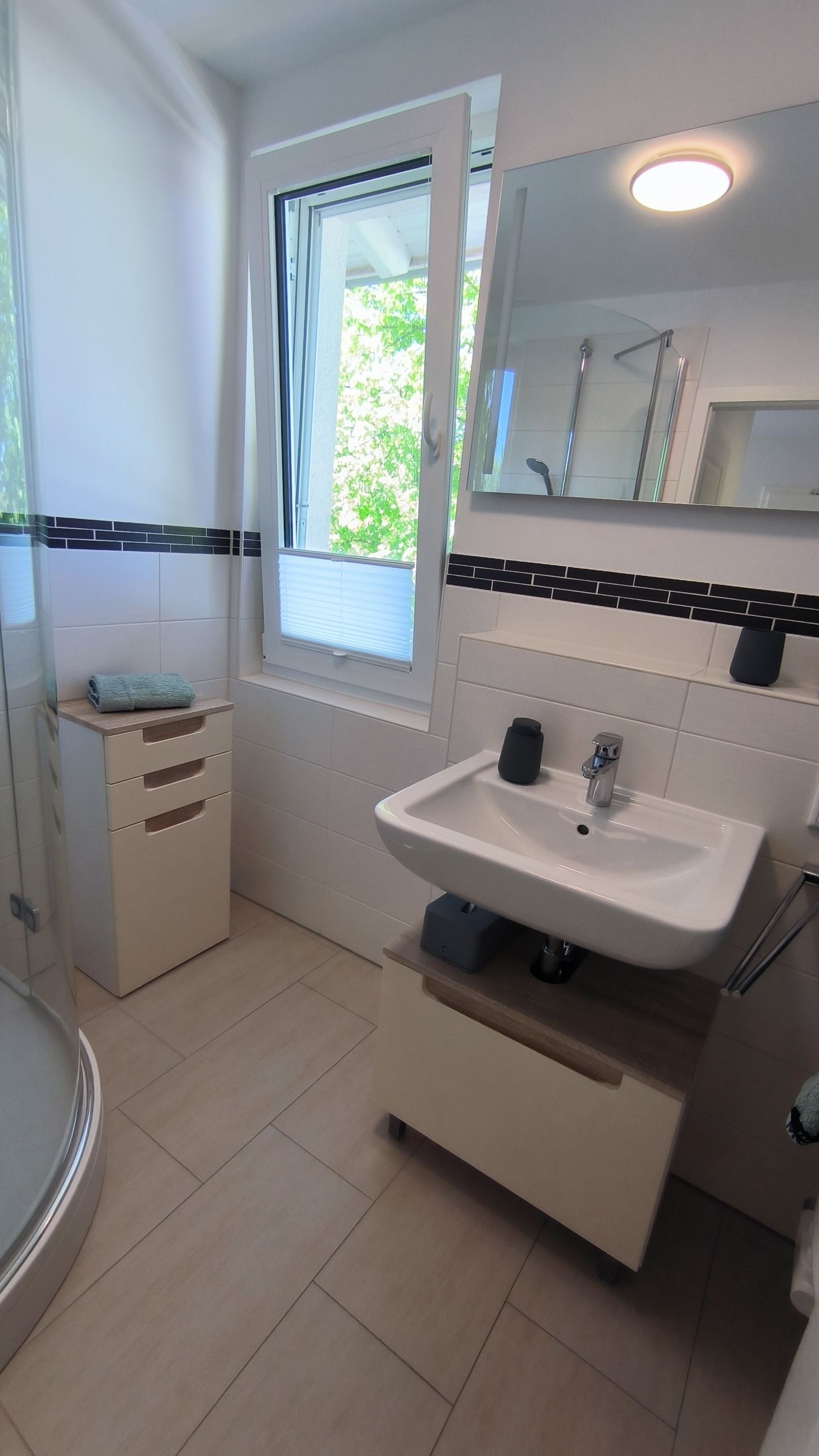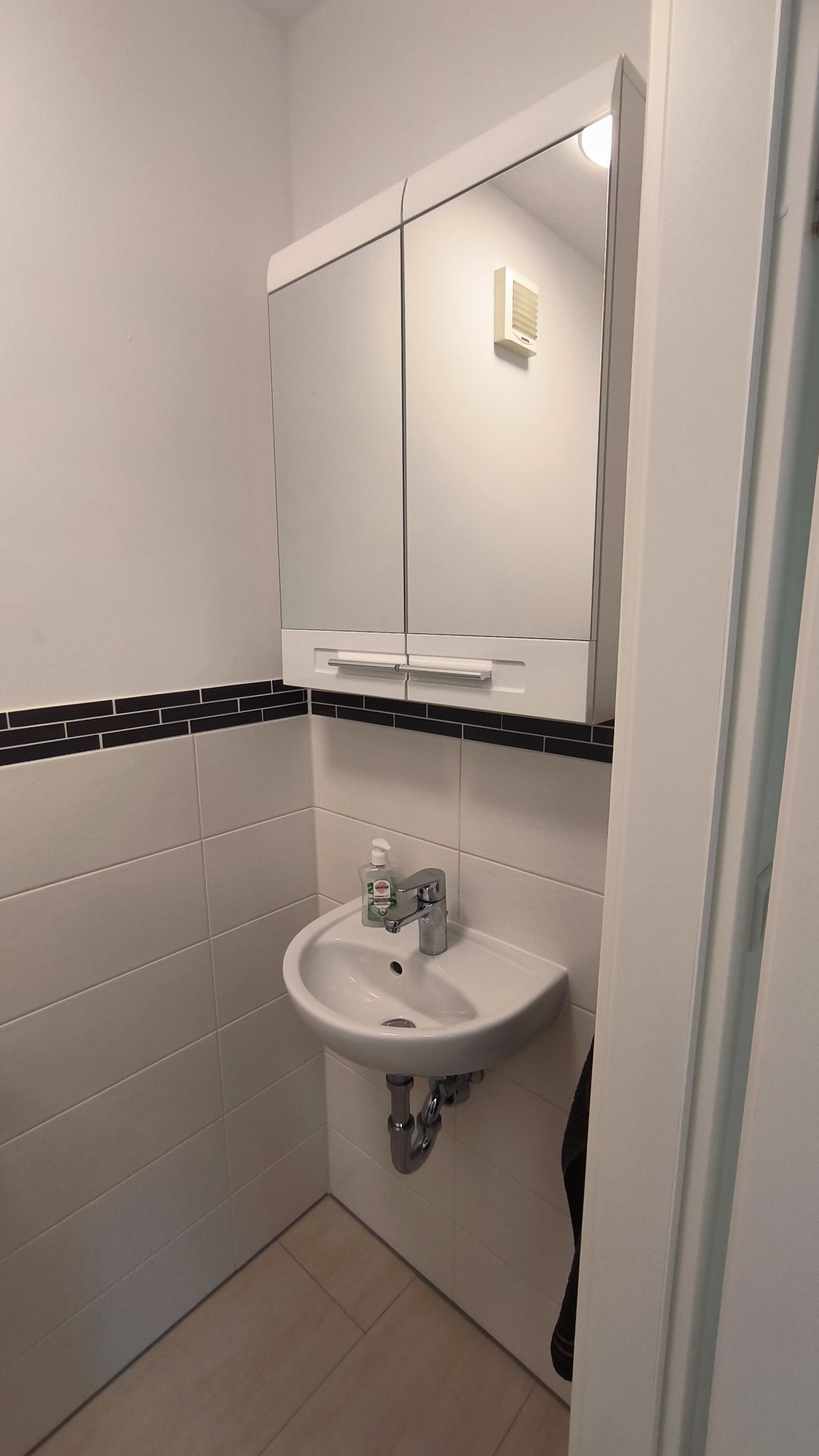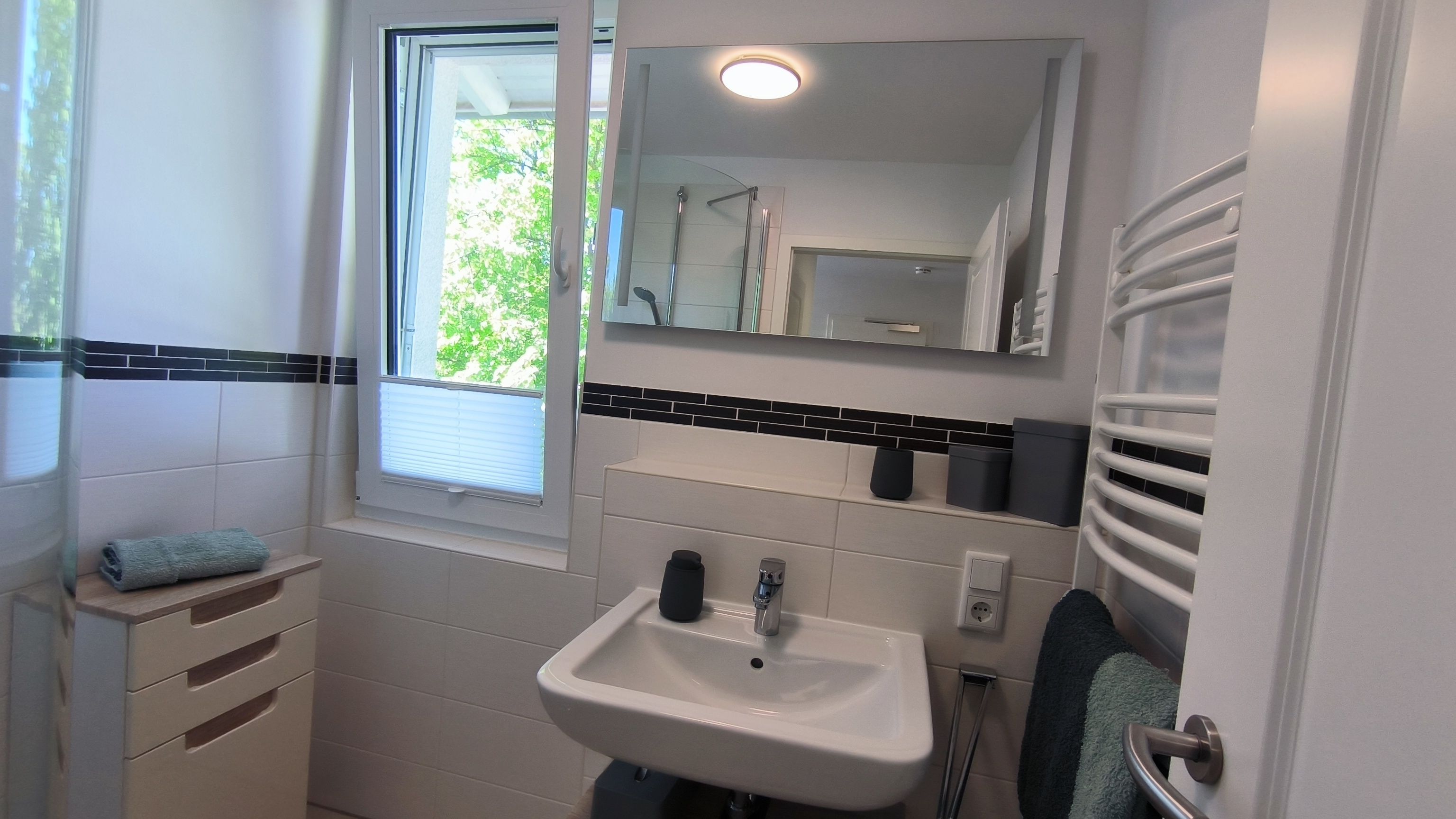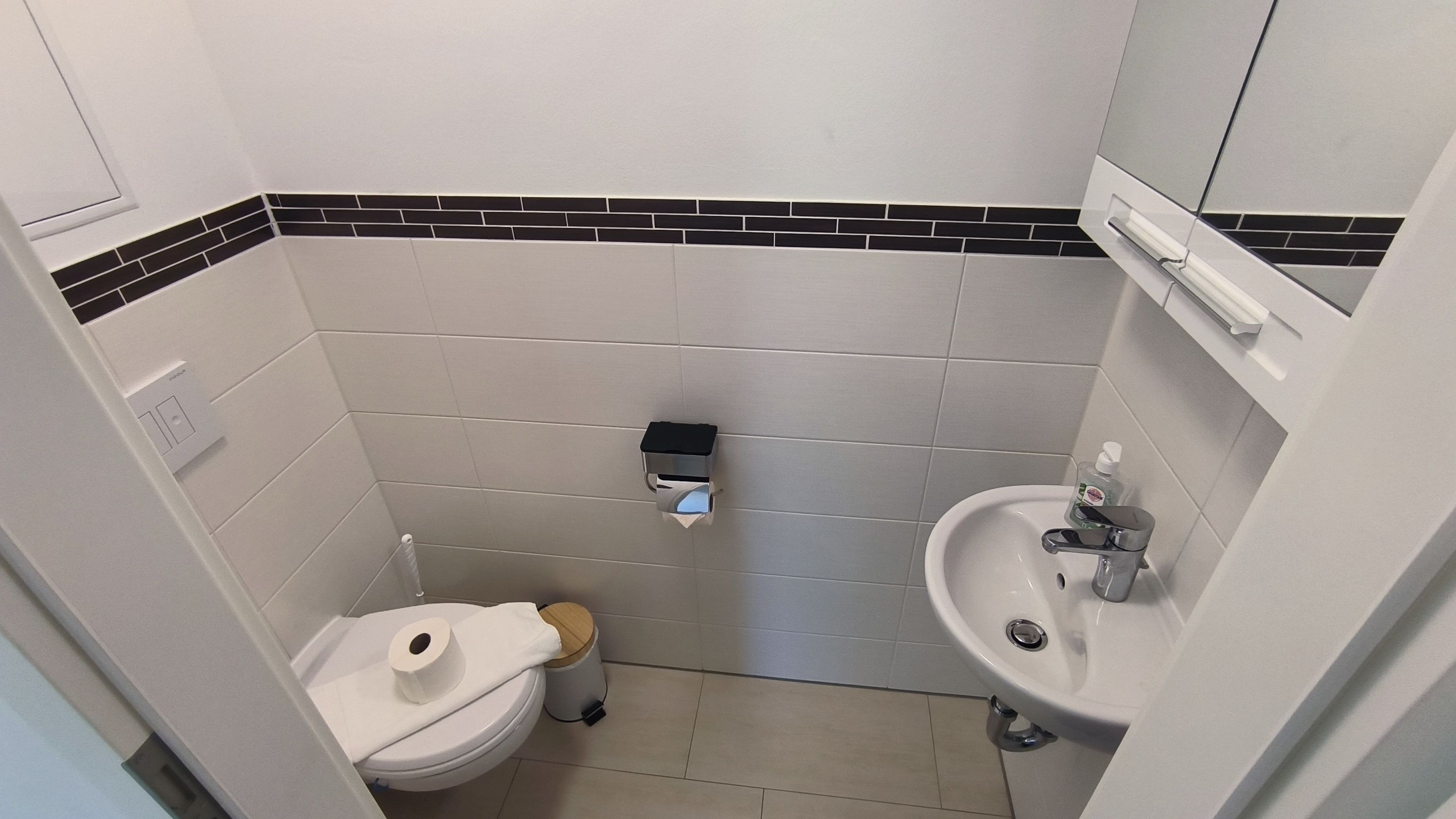 Das Badezimmer ist mit einer Dusche und einem WC ausgestattet. Im Abstellraum befindet sich eine Waschmaschine, die Ihnen kostenfrei zur Verfügung steht.