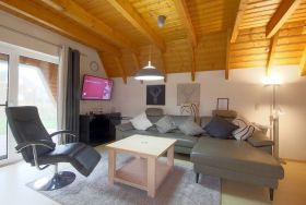 Der offene Wohn-, Küchen und Essbereich mit bequemer Couchgarnitur, Flachbild TV, Kaminofen, Laminatboden, und W-LAN mit Glasfaserkabel bietet ausreichen Platz für die Familie. von hier aus geht es auf die sonnige Terrasse.