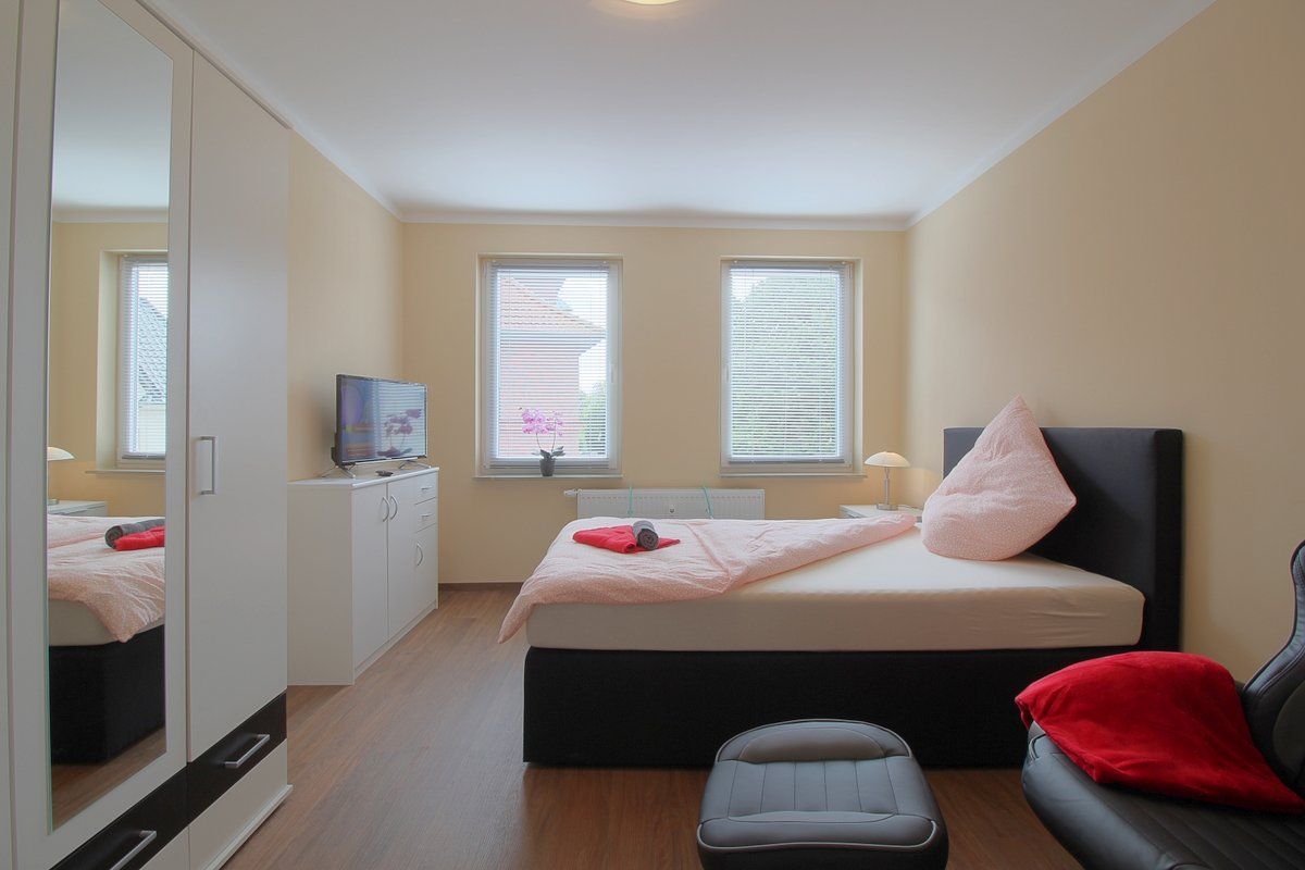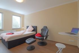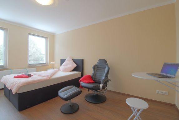 Modern eingerichtetes Einzelzimmer mit einem gemütlichen Boxspringbett, Fernsehsessel, großem Flachbild TV, gemeinsame Küchen- und Badezimmernutzung. Vinylbodenbeläge in allen Räume, daher für Allergiker geeignet. Es fehlt an nichts, hier können Sie nach einem anstrengendem Arbeitstasg Ihren Feierabend genießen.