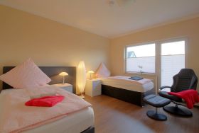 Modern eingerichtetes Doppelzimmer mit einem gemütlichen Boxspringbett welches auch als 2 Einzelbetten gestellt werden kann, 2 Fernsehsessel und großem Flachbild TV und ein kleiner Balkon.