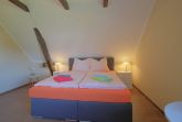 Modern eingerichtetes Doppelzimmer im 2. OG mit offener Decke bis in den Spitzboden mit Sichtbalken. Das gemütliche Boxspringbett welches auch als 2 Einzelbetten gestellt werden kann sorgt für erholsamen Schlaf, 2 Fernsehsessel, großer Flachbild TV, gemeinsame Küchen- und Badezimmernutzung. Vinylbodenbeläge in allen Räume, daher für Allergiker geeignet. Es fehlt an nichts, hier können Sie nach einem anstrengendem Arbeitstasg Ihren Feierabend genießen.