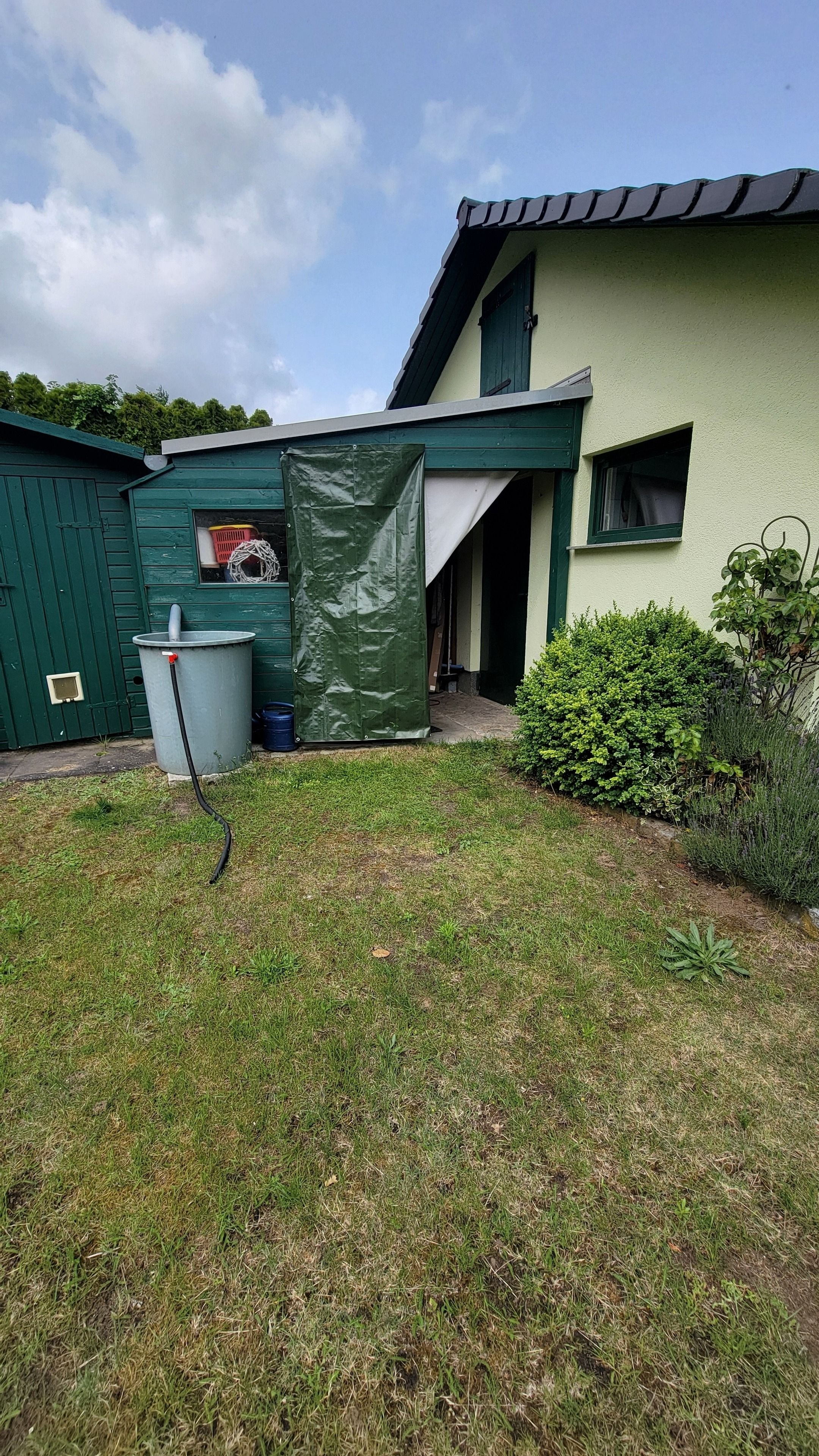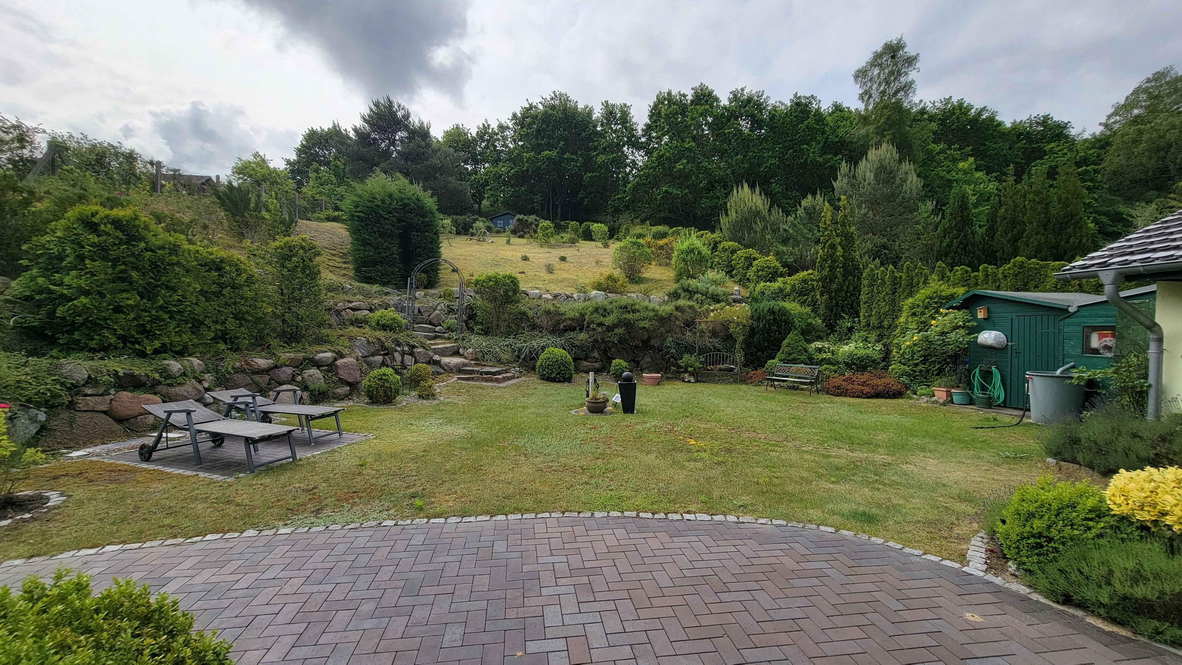 Privater, eingezäunter Garten mit gemütlicher Sitzecke, 2 Sonnenliegen, Markise und viel Platz zum Entspannen