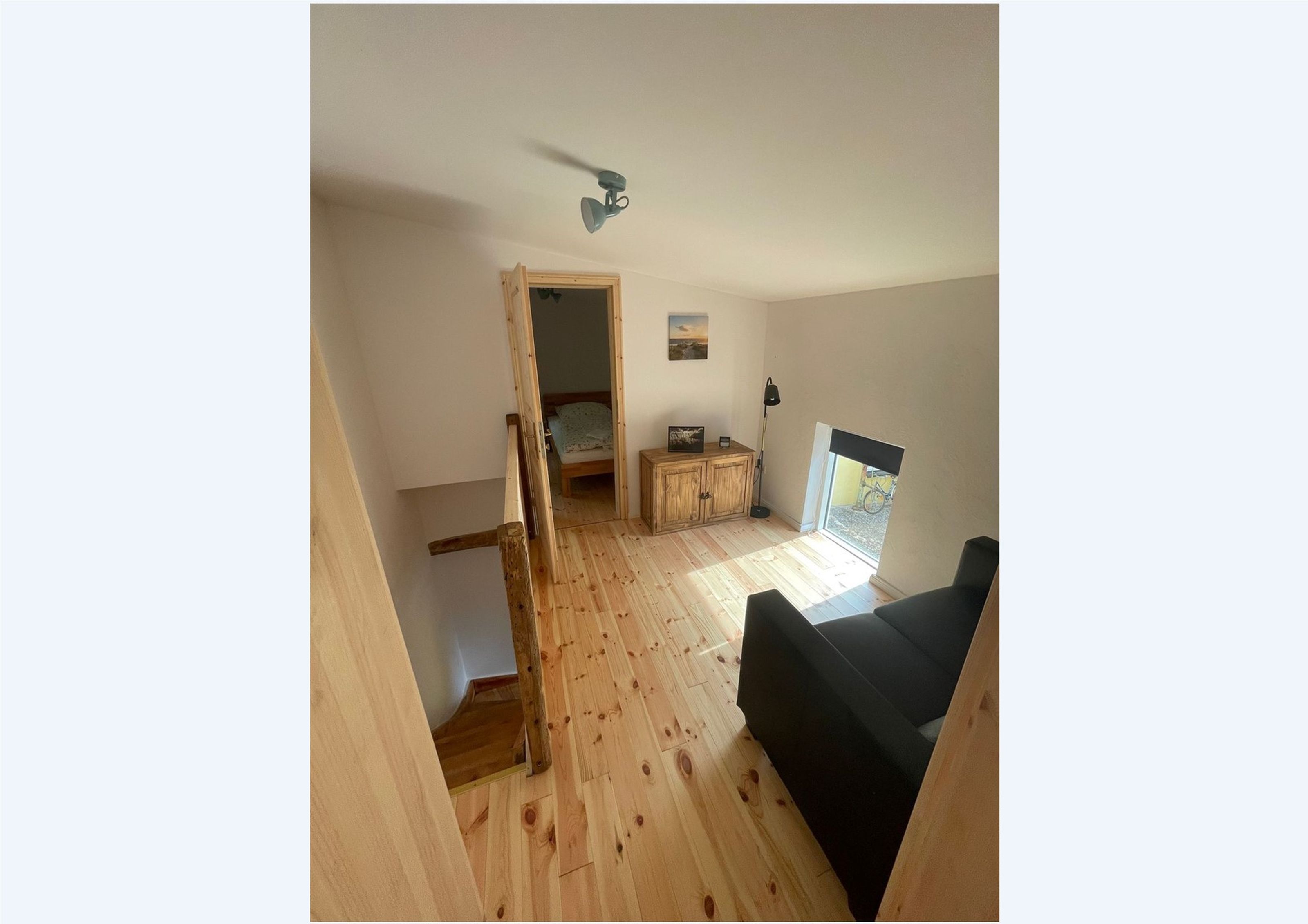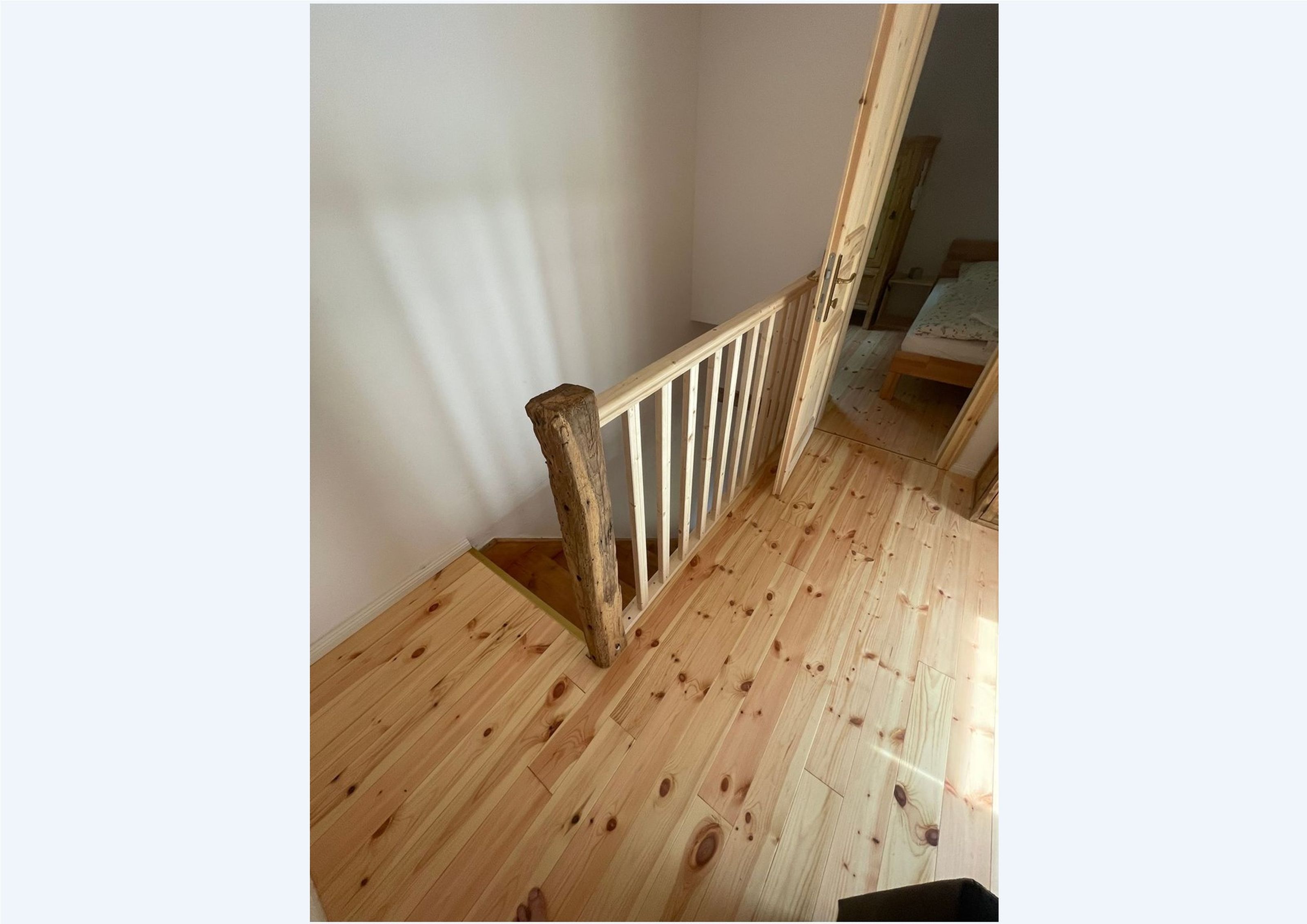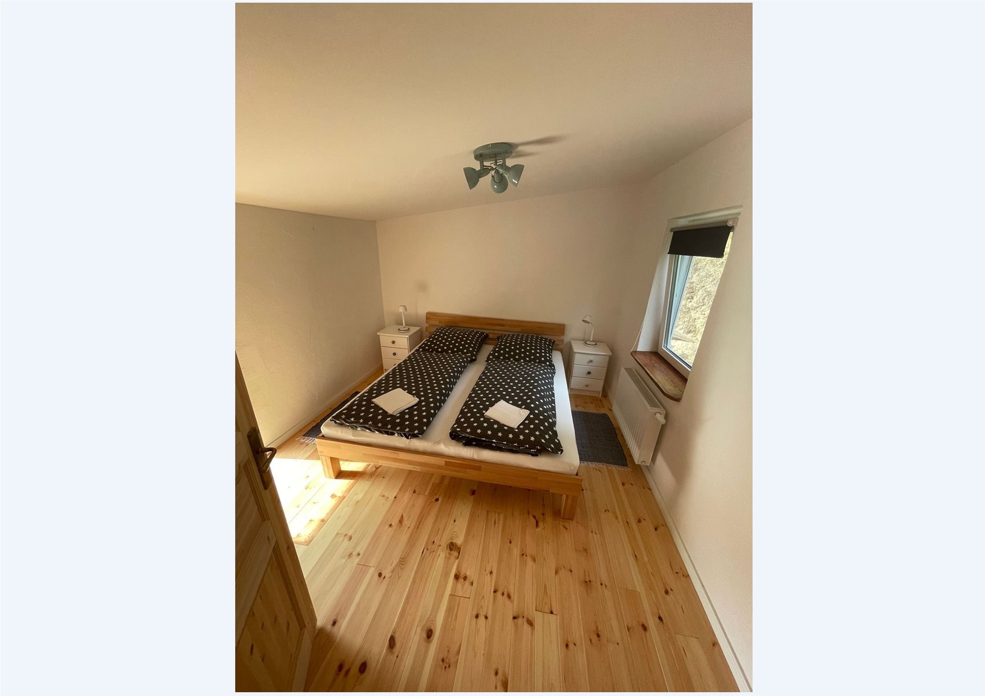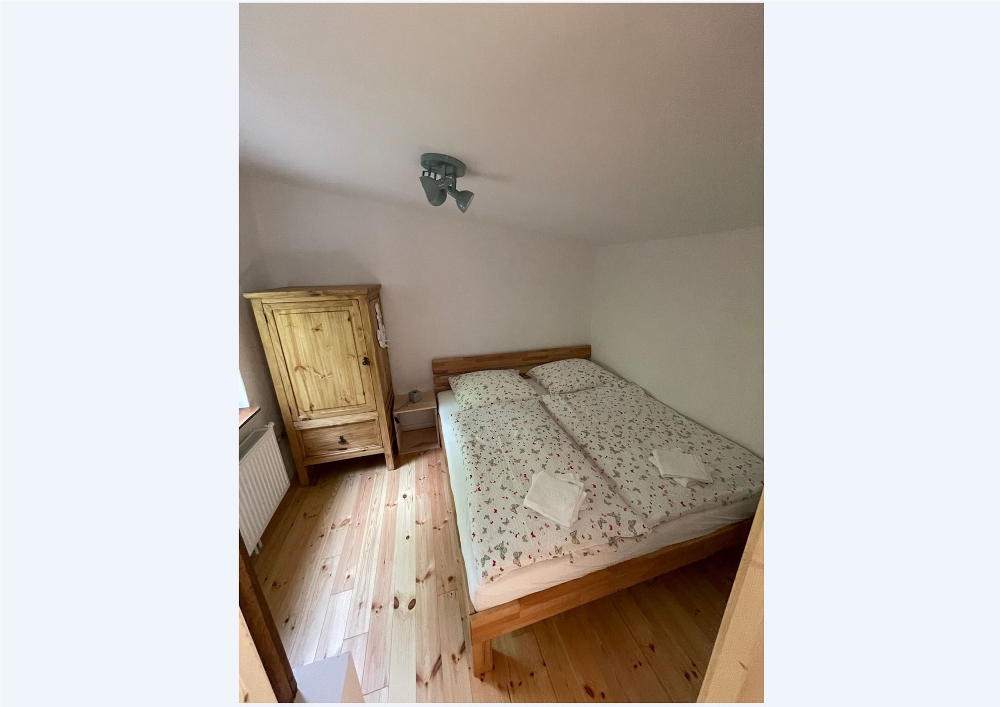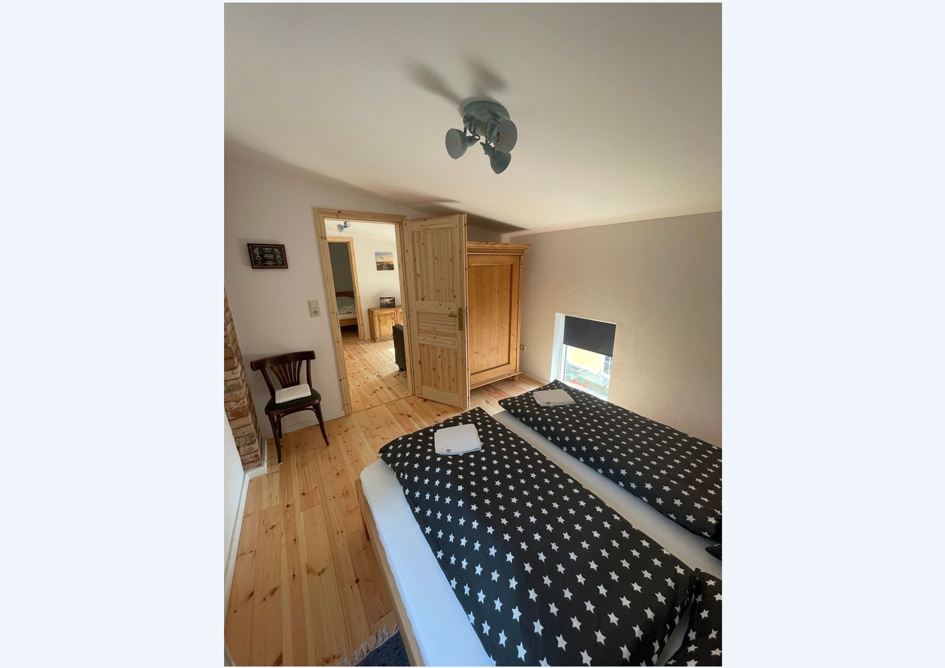 Eine Holztreppe führt Sie in das Obergeschoss, wo sich zwei liebevoll eingerichtete Schlafzimmer befinden, jeweils mit einem komfortablen Doppelbett.