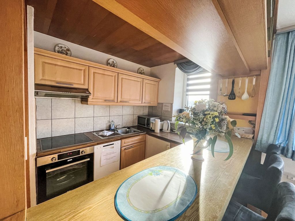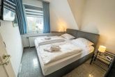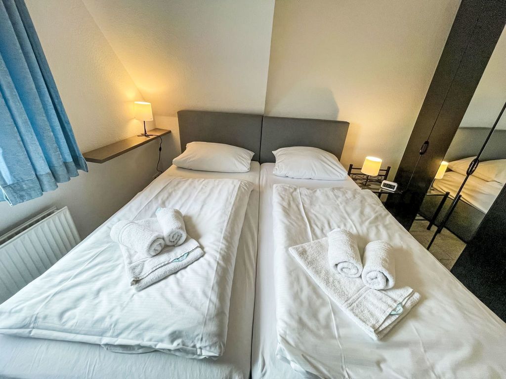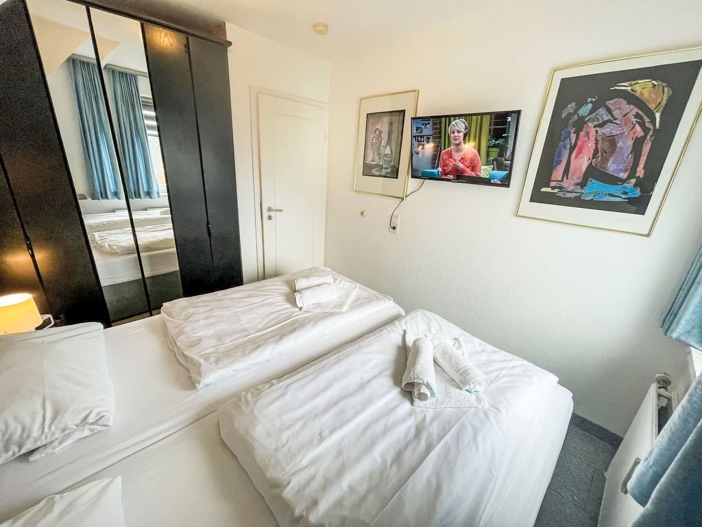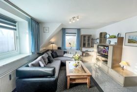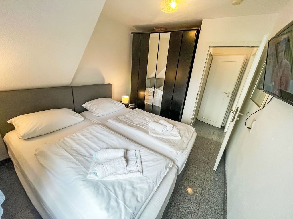 Fewo 4 in ruhigem Haus, 3-Zimmer-Wohnung 45 m2 auf 2 Stockwerken, im Obergeschoss. Komfortabel eingerichtet: Wohn-/Esszimmer mit Sat-TV (Flachbildschirm), Radio, CD und DVD. 1 Zimmer mit 1 Doppelbett und Sat-TV (Flachbildschirm). Kochnische (Backofen, Geschirrspüler, 4 Glaskeramikplatten, Toaster, Wasserkocher, Mikrowelle, elektrische Kaffeemaschine) mit Bar, Esstisch. Dusche/WC. 2. Obergeschoss: (steile Treppe) 1 abgeschrägtes Zimmer, Deckenhöhe 30 - 180 cm mit 2 Betten und Sat-TV (Flachbildschirm). Heizung. Zur Verfügung: Waschmaschine, Wäschetrockner, Babybett, Haartrockner. Internet (WLAN, gratis). Parkplatz (1 Auto) beim Haus. Bitte beachten: Nichtraucher-Unterkunft. Maximal 1 Haustier/Hund erlaubt. Rauchmelder.