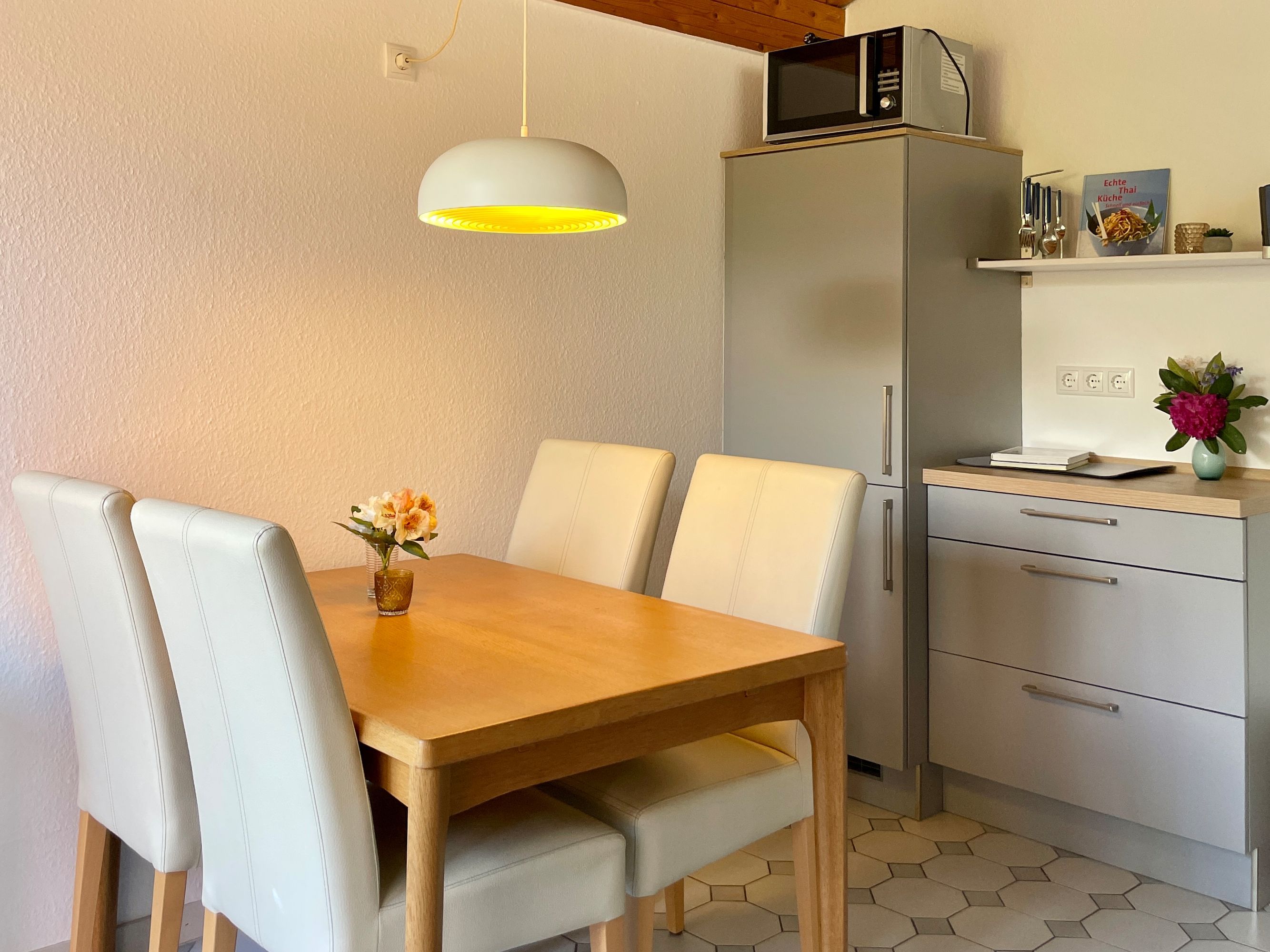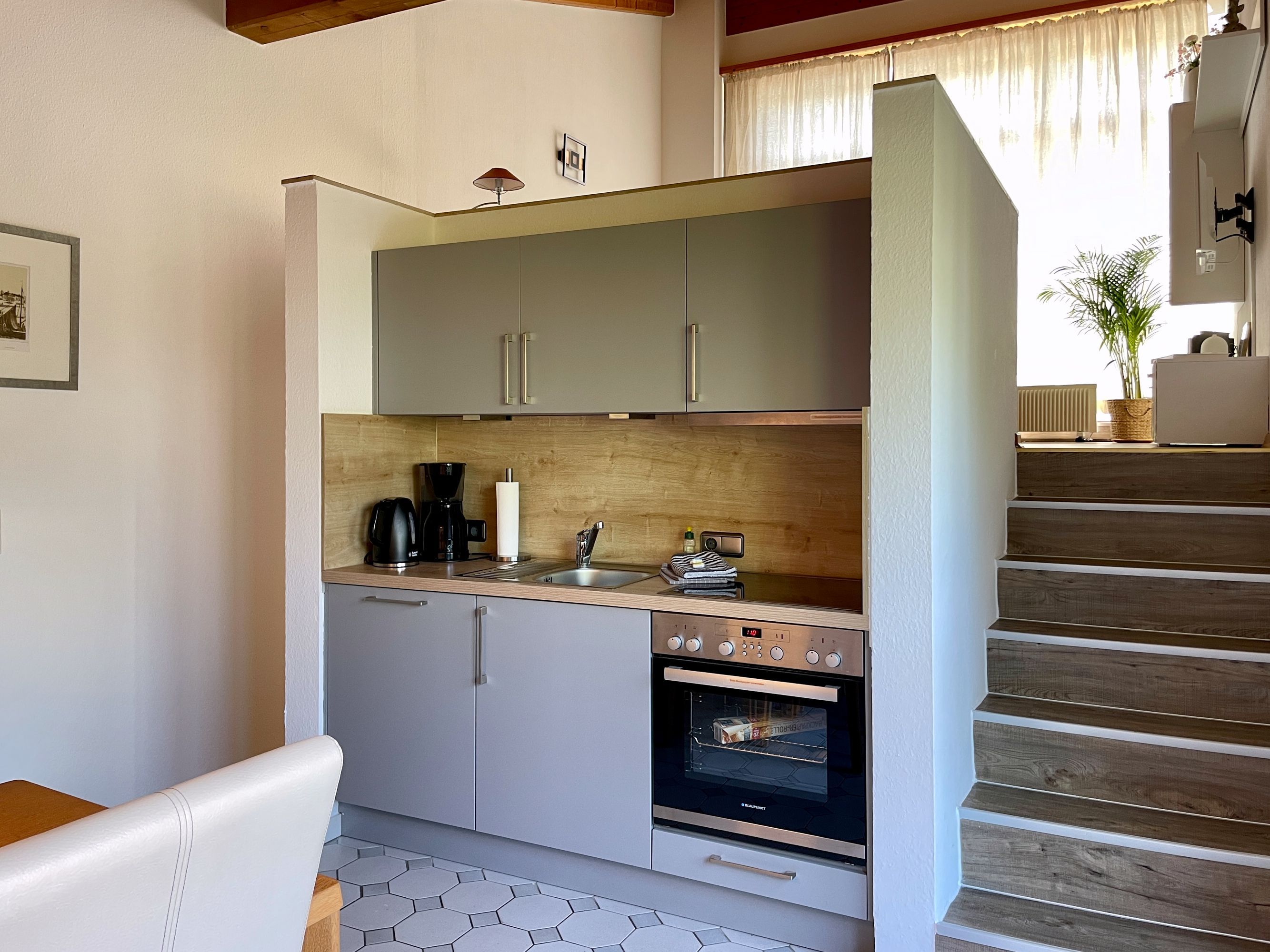 Küche mit Spülmaschine, Kühlschrank, Mikrowelle, Backofen, Ceran-Kochfeld,