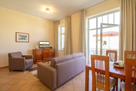Diese mit italienischen Stilmöbeln eingerichtete 2-Zimmer Wohnung ist 53 m² groß und befindet sich im 1. Obergeschoss. Die Wohnung ist komfortabel ausgestattet und bietet 2-3 Personen Platz für einen erholsamen Urlaub. Der offene Wohnraum bietet Ihnen eine gemütliche Sitzecke mit Sofa, Sessel und TV. Die Küchenzeile incl. Backofen, Ceranfeld, Kühlschrank, Geschirrspüler, Mikrowelle etc. sowie der Essplatz sind offen im Wohnraum integriert. Vom Wohnzimmer betreten Sie auch den westlich ausgerichteten Balkon, auf dem Sie den Tag mit einem Glas Wein ausklingen lassen können. Von hier aus können Sie auch einen teilweisen Blick auf das Meer erhaschen. Das Schlafzimmer ist mit einem Doppelbett mit getrennten Matratzen (90 x 200) und einem Kleiderschrank eingerichtet. Das moderne Bad ist mit einer Dusche mit Echtglasabtrennung und Doppelwaschbecken/WC ausgestattet. Außerdem steht den Gästen ein Gäste WC zur Verfügung. Der Pkw- Stellplatz befindet sich auf dem Grundstück und ist der Wohnung zugeordnet.