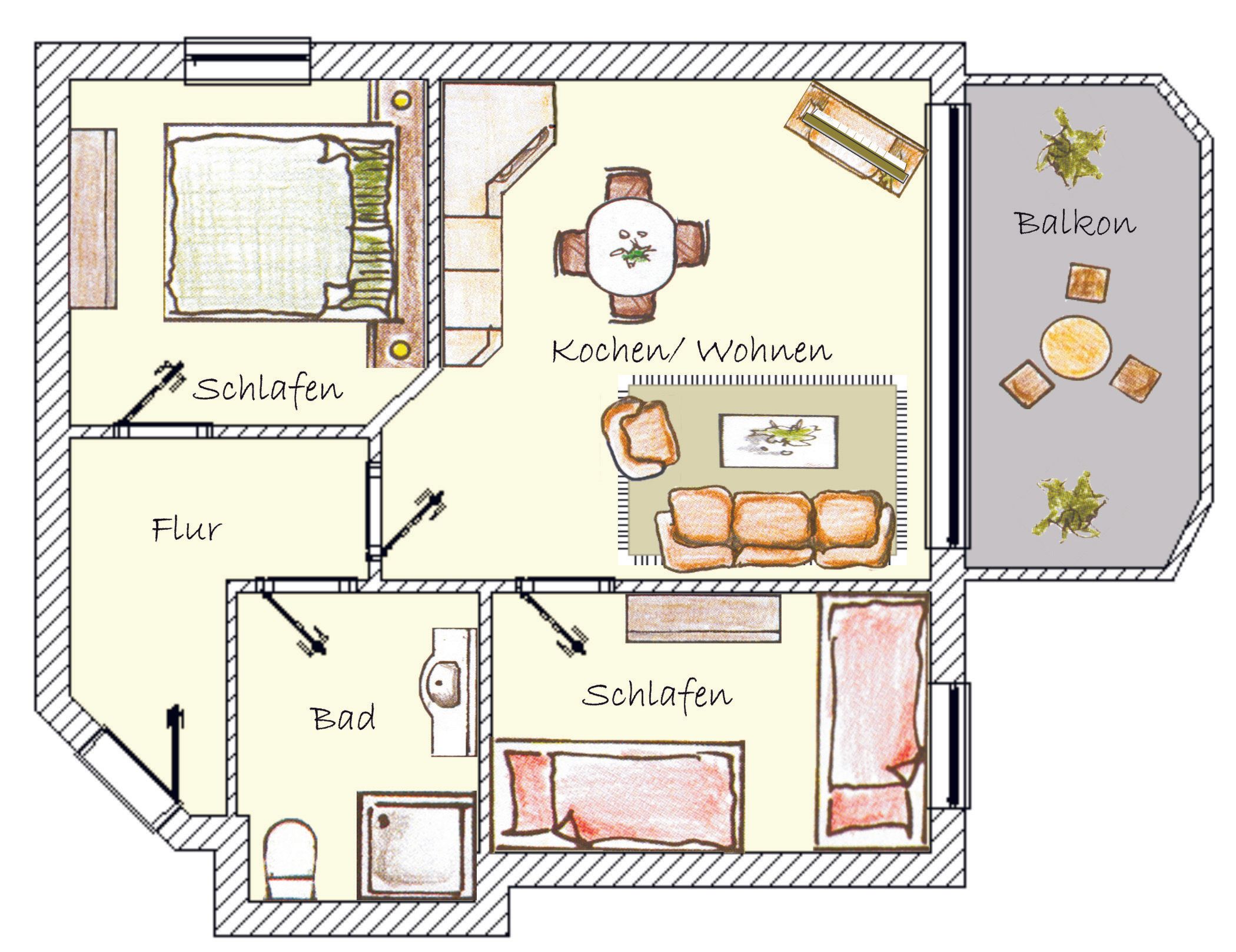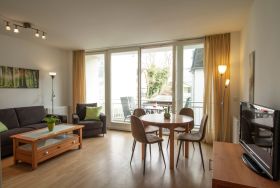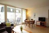 Dieses 54 qm große gemütliche 3-Zimmer-Appartement liegt im Erdgeschoss und verfügt über einen Balkon in nordöstlicher Ausrichtung. Der helle Wohnraum ist mit einem gemütlichen Sofa und Sessel und einem separaten Essplatz für 4 Personen eingerichtet. Ein Flat TV ist selbstverständlich. Die Küchenzeile inkl. Kühlschrank, Geschirrspüler, Cerankochfeld und Mikrowelle ist offen im hinteren Wohnbereich integriert. Das größere Schlafzimmer ist mit einem Doppelbett mit getrennten Matratzen (90 x 200) Kleiderschrank und Kommode eingerichtet, das kleinere mit zwei Einzelbetten (90 x 180) und kleinerem Schrankraum. Der möblierte Balkon liegt zur Hofseite und lädt besonders vormittags zum Verweilen ein. Im Bad steht den Gästen Dusche und Waschbecken/WC zur Verfügung. Ein Pkw- Stellplatz befindet sich auf dem Hof und ist der Wohnung zugeordnet. Den Fahrradabstellraum mit komfortablem Austritt finden Sie im Keller.
