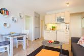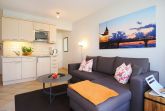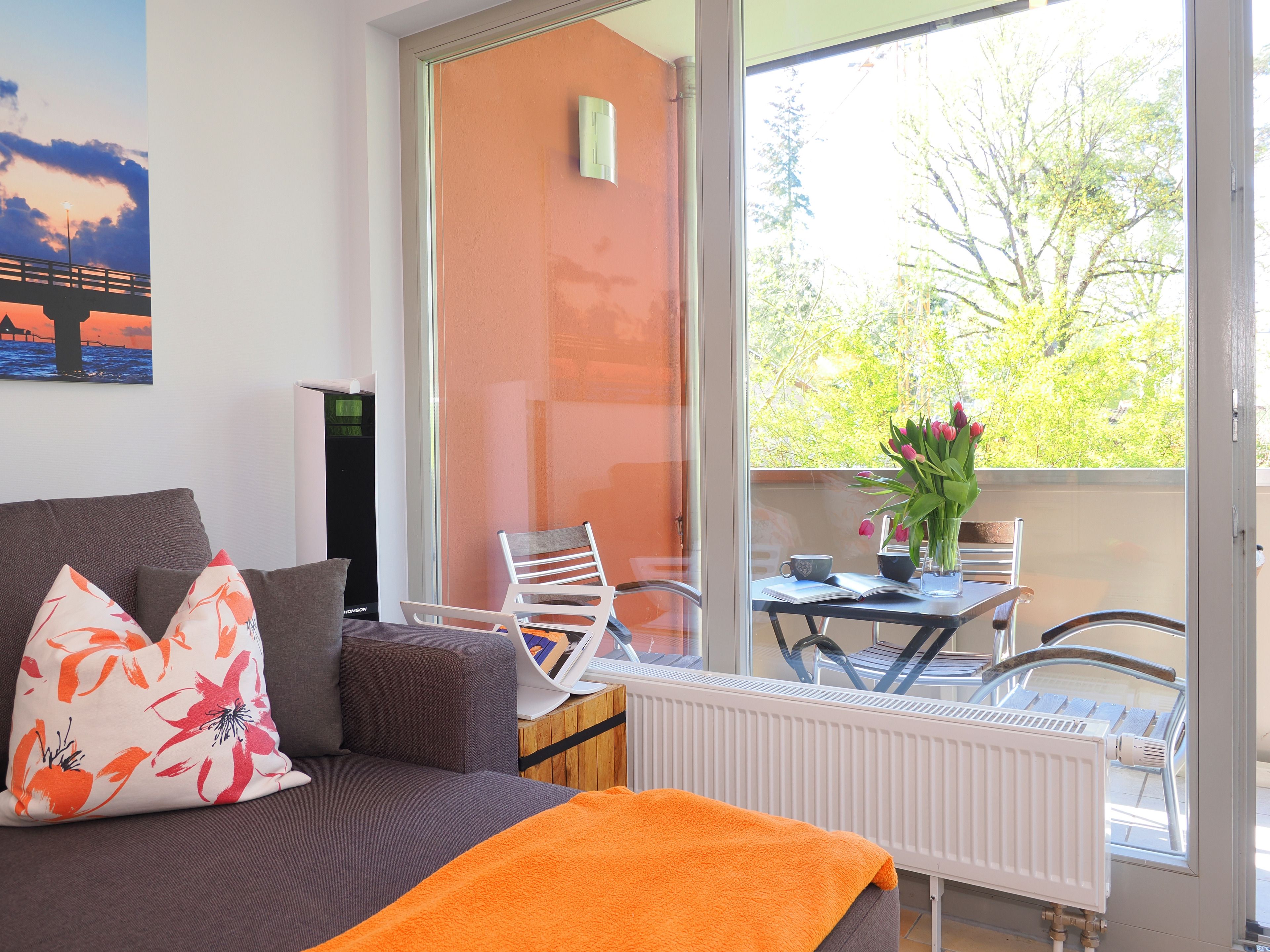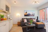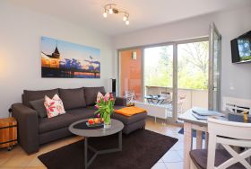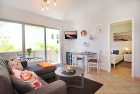 Dieses 37 qm große 2 Zimmer Appartement befindet sich im Hochparterre und ist für 2 Personen und max. ein Kind geeignet. Der geschmackvoll eingerichtete Wohnraum ist mit seiner breiten Fensterfront vom Licht verwöhnt und bietet den Gästen eine gemütliche Eckcouch mit Schlaffunktion (Liegefläche 140 x 185) zum Entspannen. Flat-TV und Radio sind selbstverständlich. Der Essplatz sowie die Küchenzeile incl. Geschirrspüler, Kühlschrank, Mikrowelle, Cerankochfeld etc. befinden sich ebenfalls im Wohnraum. Den Balkon in westlicher Ausrichtung können die Gäste vom Wohnraum begehen. Das Schlafzimmer ist mit einem Doppelbett mit getrennten Matratzen (80 x 200) und reichlich Schrankraum eingerichtet. Im modernen hochwertigen Bad steht den Gästen eine Dusche sowie Waschtisch/WC zur Verfügung. Im Keller finden Sie eine Sauna, einen Fahrradraum, Waschmaschine und Trockner. Der Pkw-Stellplatz befindet sich auf dem abgeschlossenen Grundstück und ist der Wohnung zugeordnet.