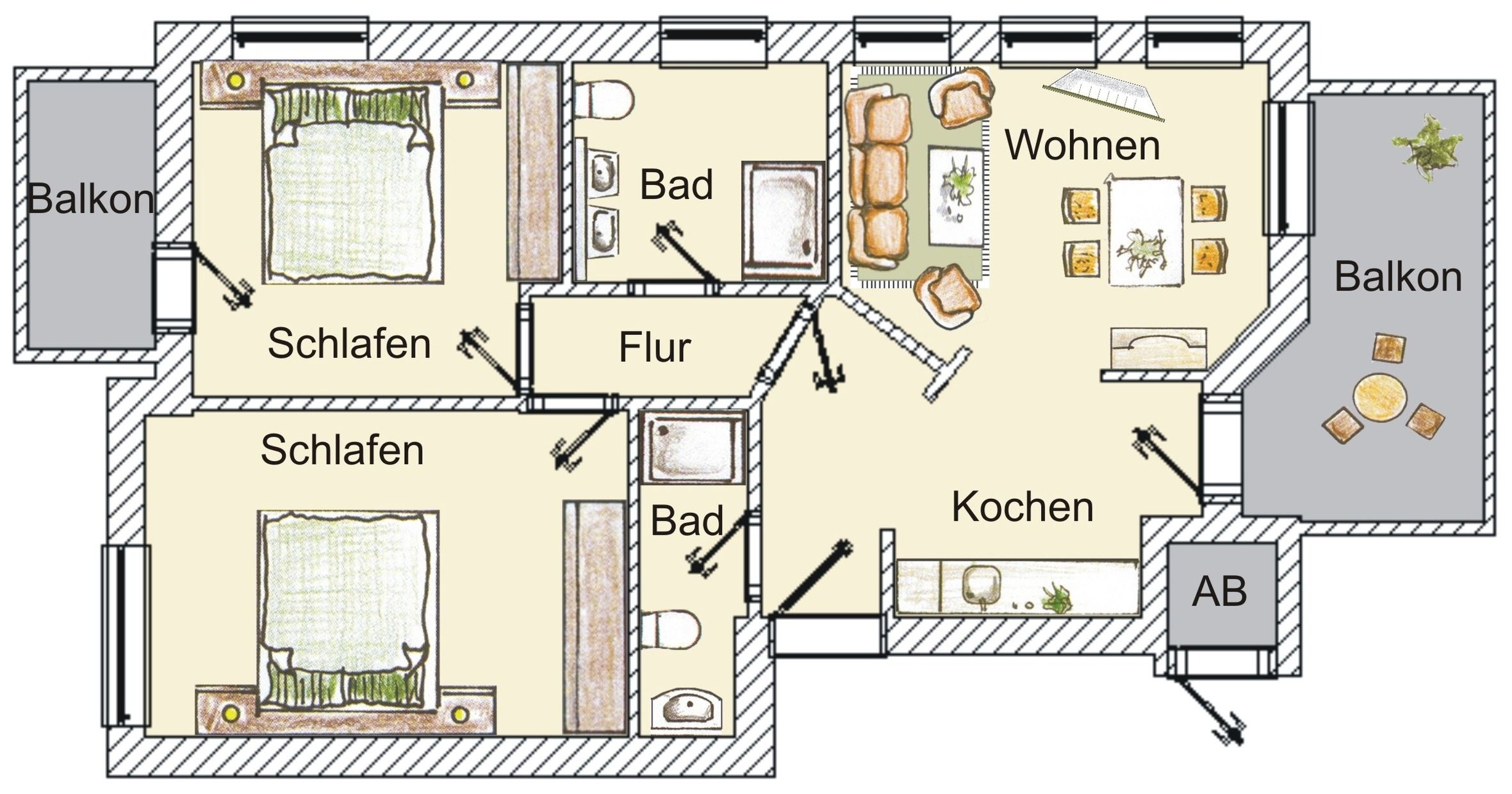 Dieses 94 qm große 3 Zimmer Appartement befindet sich im 1. Obergeschoss. Hier können 2-4 Personen Ihren Urlaub ganz nah am Meer verleben und auch einen Blick auf die Ostsee genießen. Im großzügigen Wohnraum finden Sie eine gemütliche Couchecke mit Flat TV sowie einen großen Essplatz, der viel Platz für gemeinsame Mahlzeiten bietet. Die Vollküche incl. Kühlschrank, Geschirrspüler, Ceranfeld mit Backofen, Mikrowelle etc. grenzt halboffen an den Wohnraum. Von hier aus können Sie auch den südlich ausgerichteten Balkon mit Blick in den Buchenpark betreten, der viele erholsame Sonnenstunden verspricht. Beide Schlafräume sind jeweils mit einem Doppelbett mit getrennten Matratzen (80 bzw. 90 x 200) und einem Kleiderschrank eingerichtet. Den kleineren Seebalkon mit Blick auf das Meer und die Bansiner Seebrücke erreichen Sie von einem der beiden Schlafzimmer. Zwei Badezimmer mit jeweils Dusche sowie Waschtisch/WC komplettieren diese hochwertige Ausstattung.
