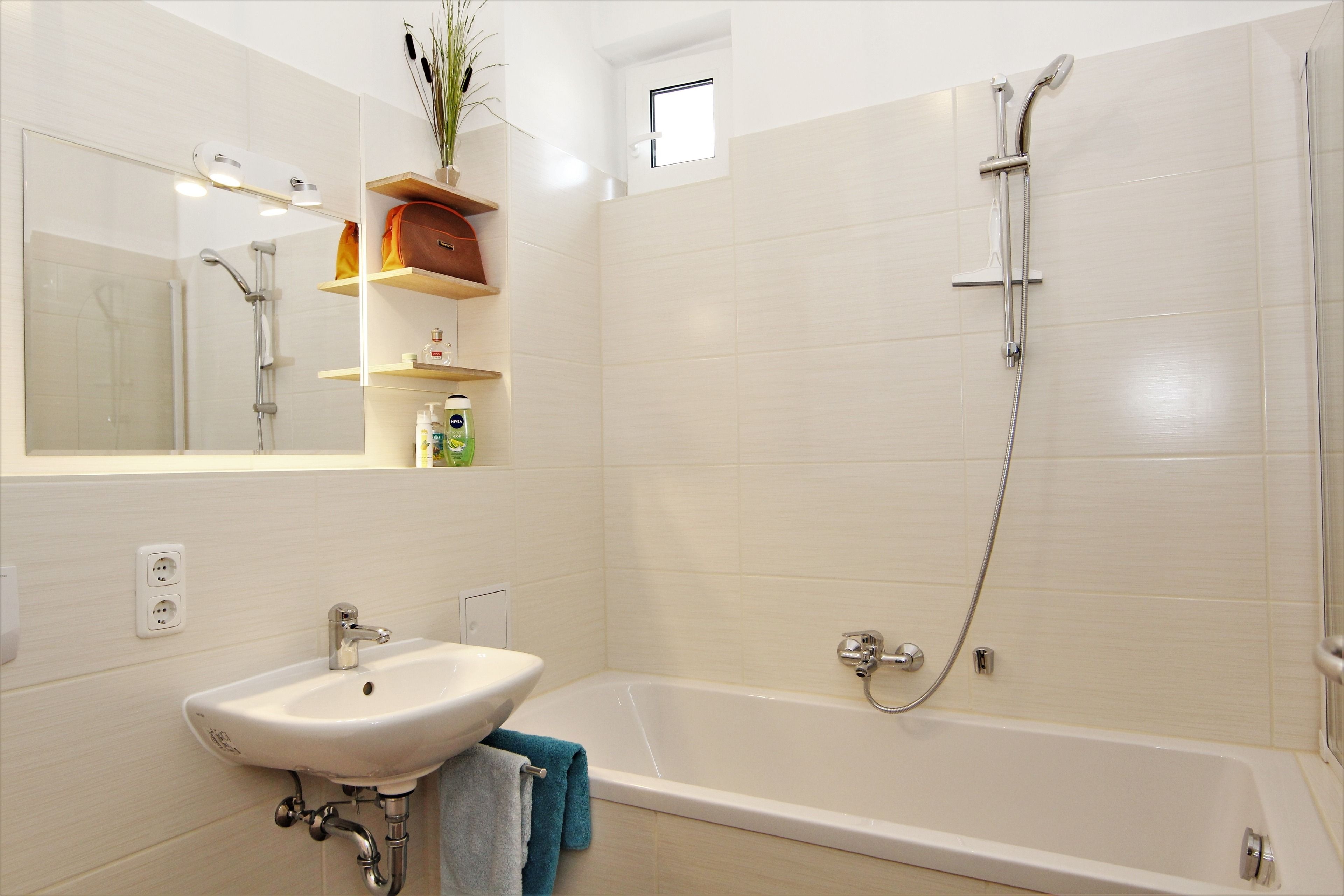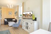 Dieses gepflegte 45 qm große 2-Zimmer-Appartement liegt im Hochparterre und eignet sich für 2-4 Personen. Ausgerichtet zur Ostsee in Richtung Promenade können Sie auf selbige bereits einen Blick erhaschen. Die Wohnung ist hell in modernem Landhausstil eingerichtet. So finden Sie ein Wohnzimmer mit gemütlichem Sofa mit Schlaffunktion (Liegefläche 140 x 195) sowie den einladenden Essbereich direkt vor deckenhohen Fenstern. Die im Wohnbereich integrierte Küchenzeile ist mit Geschirrspüler, Cerankochfeld, Backofen etc. ausgestattet. Das helle Schlafzimmer verfügt über ein Doppelbett mit getrennten Matratzen (90x200) in Komforthöhe und genügend Schrankraum. Für ein jüngeres Kind steht hier wahlweise ein Schlafsessel zum Ausklappen zur Verfügung. Aus dem Schlafzimmer haben Sie Zugang zu einem windgeschützten Balkon in süd-östlicher Ausrichtung, der die Gäste schon mit Morgensonne verwöhnt und zum gemütlichen Verweilen einlädt. Das moderne Bad mit kleinem Fenster bietet eine Badewanne mit Duschabtrennung und Waschtisch/WC. Ein kleiner Abstellraum im Treppenhaus gehört zur Wohnung. Ein Pkw-Stellplatz befindet sich auf dem Grundstück und ist der Wohnung zugeordnet. Einen Fahrradständer gibt es am Haus.