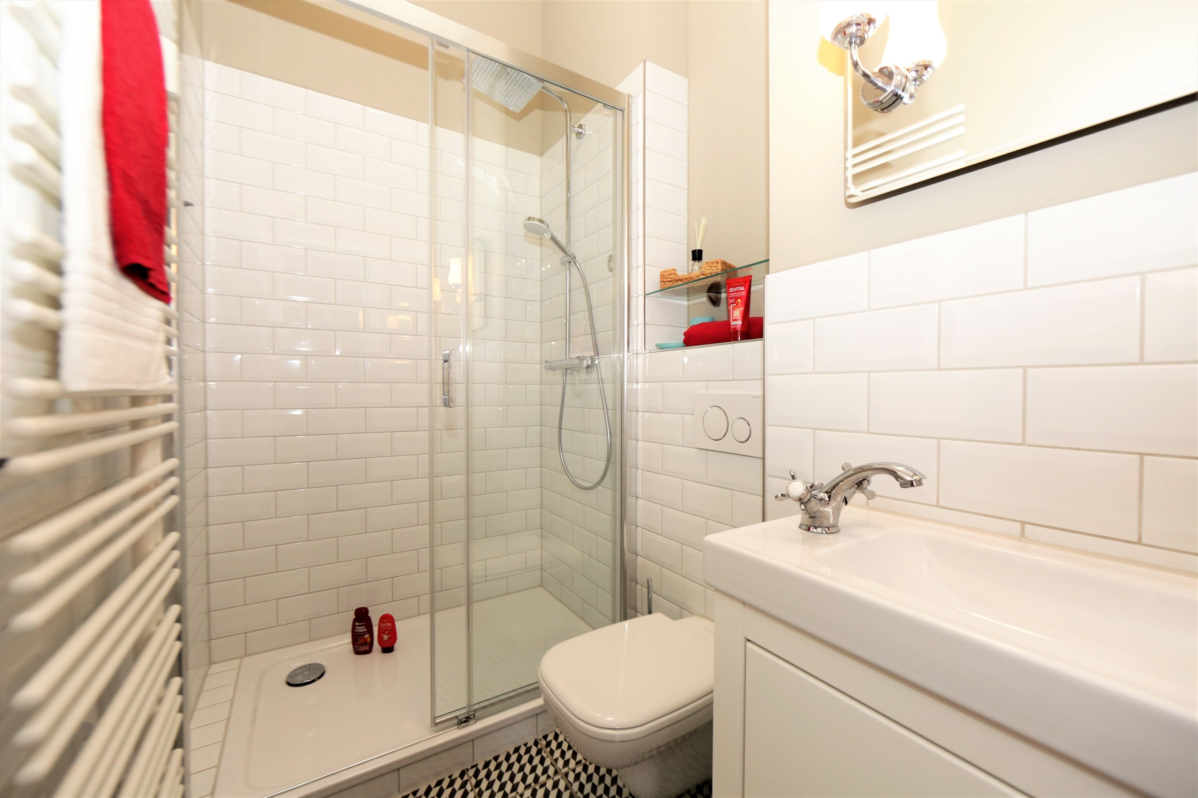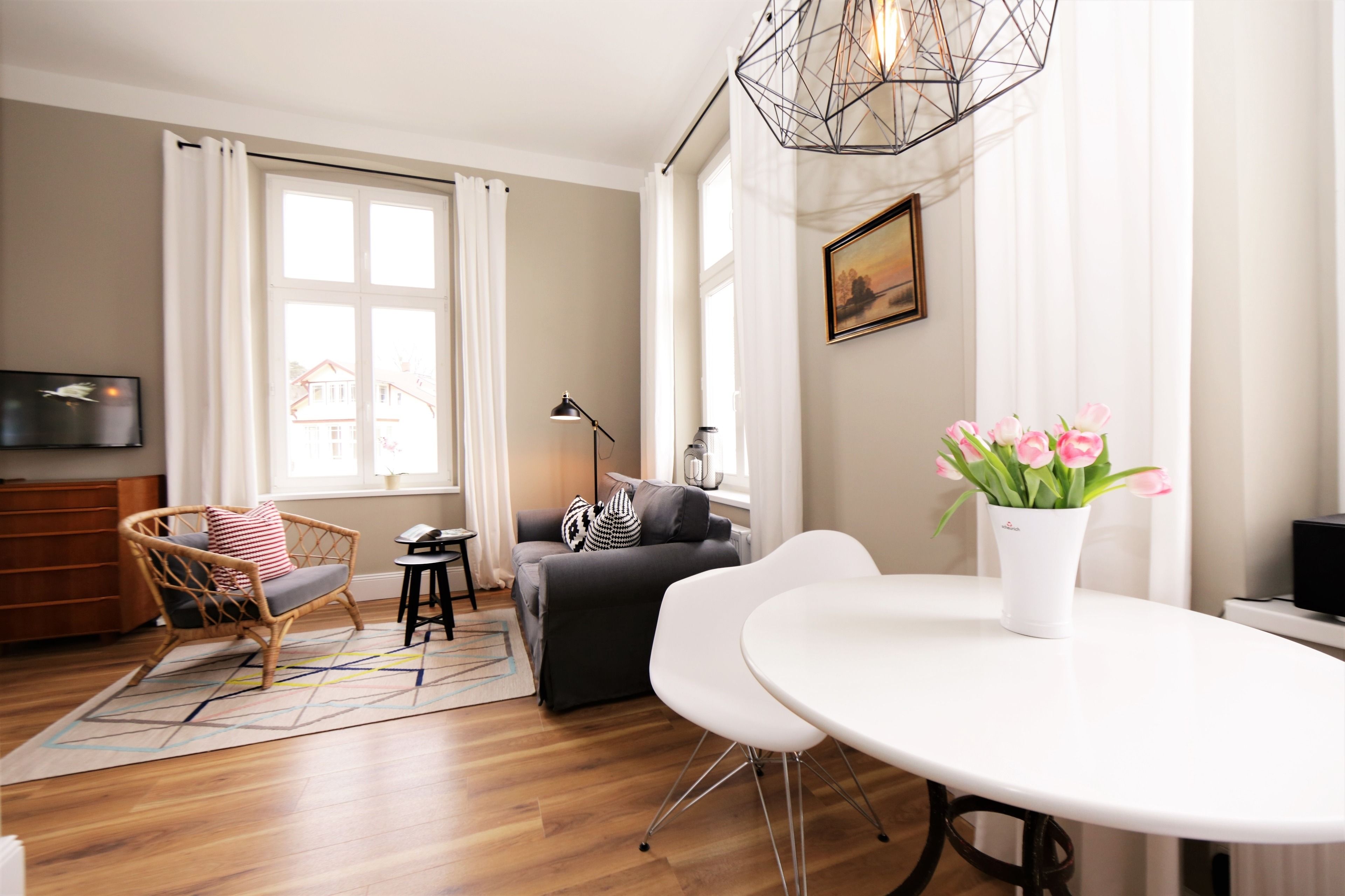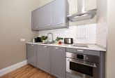 Moderne Einrichtung harmoniert mit dem Charme vergangener Zeiten – hier werden Sie sich wohl fühlen. Mit ihren 34m² ist diese 2-Zimmer-Wohnung perfekt für 2 Personen geeignet. Im hellen Wohnraum finden Sie eine gemütliche Sitzecke mit Flat-TV, Esstisch sowie die moderne Küchenzeile mit 2fach Cerankochfeld, Kühlschrank mit Gefrierfach, Backofen und Geschirrspüler. Das Schlafzimmer bietet Ihnen ein komfortables Boxspringbett sowie ausreichend Schrankraum. Das aufwendig geflieste Duschbad verfügt über einen modernen Waschtisch, ausreichend Aufbewahrungsmöglichkeiten, einem beleuchteten Spiegel und WC.