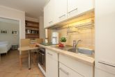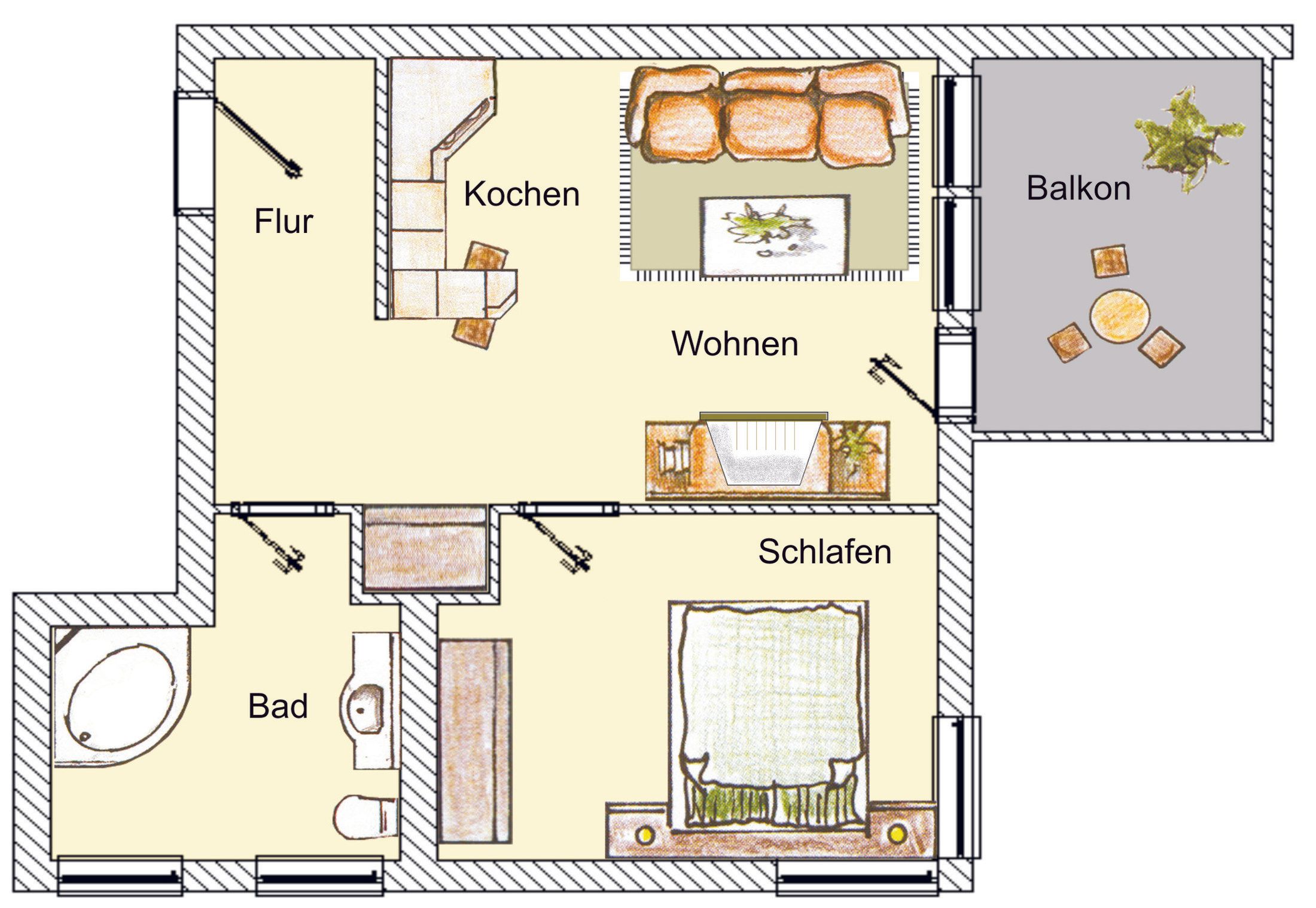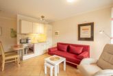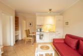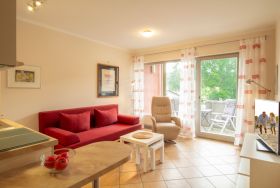 Diese liebevoll eingerichtete Zwei Zimmerwohnung ist 37 qm groß und liegt im 1. Obergeschoss. Der lichtdurchflutete Wohnraum mit seiner breiten Fensterfront ist mit einem Sofa, dass gleichzeitig die dritte Schlafgelegenheit bietet und einem Relaxsessel eingerichtet. Flat TV sowie Radio mit CD-Player sind selbstverständlich. Die Küchenzeile incl. Geschirrspüler, Kühlschrank, Cerankochfeld, Backofen p.p. und der angrenzende Essplatz sind ebenfalls offen im Wohnraum integriert. Das Schlafzimmer ist mit einem Doppelbett mit getrennten Matratzen (90x200) und einem Kleiderschrank eingerichtet. Das moderne Bad ist mit einer ebenerdigen Dusche sowie Waschtisch/WC ausgestattet. Ein Balkon zum Westen, der vom Wohnraum begehbar ist, rundet diese Wohnung ab. Im Keller finden Sie eine Sauna, die im Winterhalbjahr kostenfrei genutzt werden kann. Einen Fahrradraum und einen Waschraum mit Waschmaschine und Trockner steht den Gästen ebenfalls zur Nutzung zur Verfügung. Der Pkw-Stellplatz befindet sich auf dem abgeschlossenen Grundstück und ist der Wohnung zugeordnet.