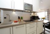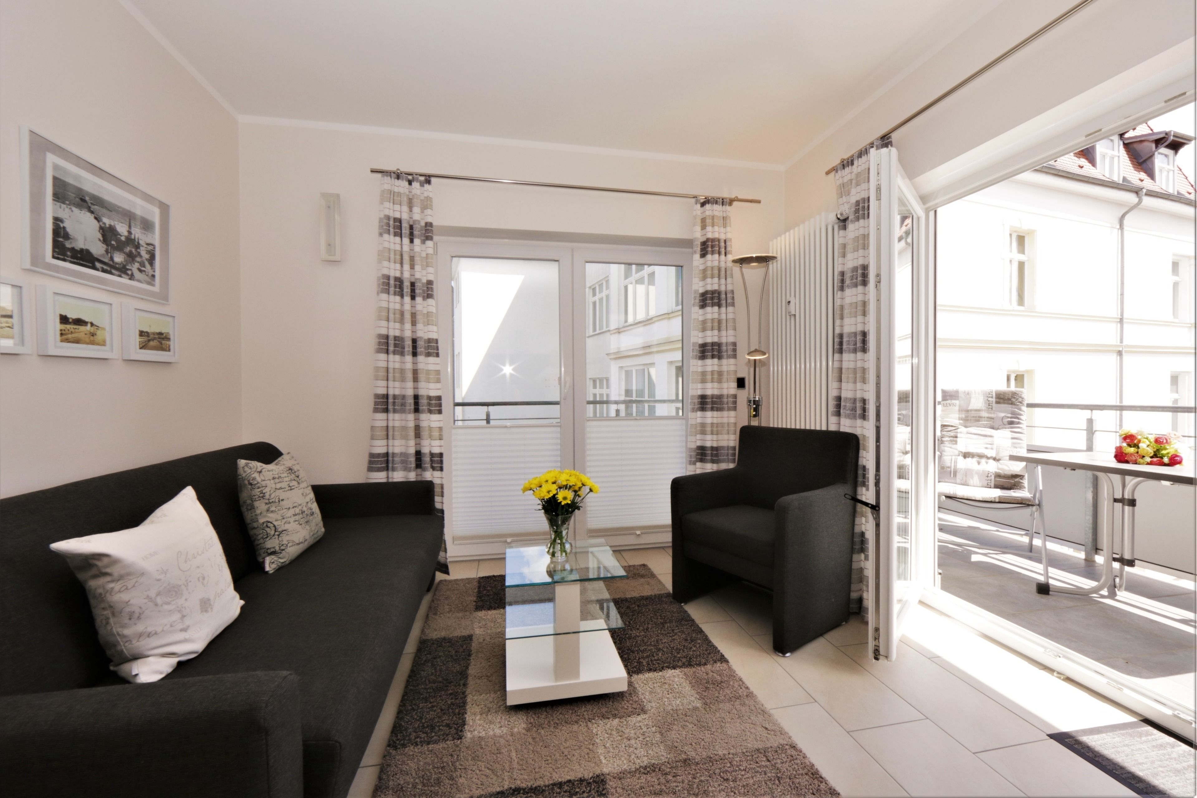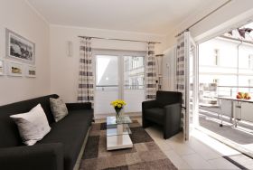 Diese 2-Zimmer Ferienwohnung für maximal 2 - 3 Personen befindet sich im 2. Obergeschoss. Sie verfügt über ein helles gemütliches Wohnzimmer mit Couchecke und Sessel (ausgezogen Schlafmöglichkeit für die 3. Person), von dem aus der große halb umlaufende Balkon betreten werden kann. Dieser möblierte nordöstlich ausgerichtete Balkon ist sonnig bis zum zeitigen Nachmittag und bietet viel Platz. Die offene, vom Wohnbereich nicht einsehbare Pantryküche mit einem Sitzplatz für 2 - 3 Personen ist mit zwei Ceranfeldern, Spülmaschine, Kühlschrank, Kaffeemaschine etc. ausgestattet. Das Schlafzimmer zum Hof bietet ein 1,80 m breites Doppelbett mit getrennten Matratzen sowie reichlich Schrankraum und einen zusätzlichen TV. Im modernen Bad finden Sie Dusche/WC und Waschbecken. Der Parkplatz befindet sich am Haus.