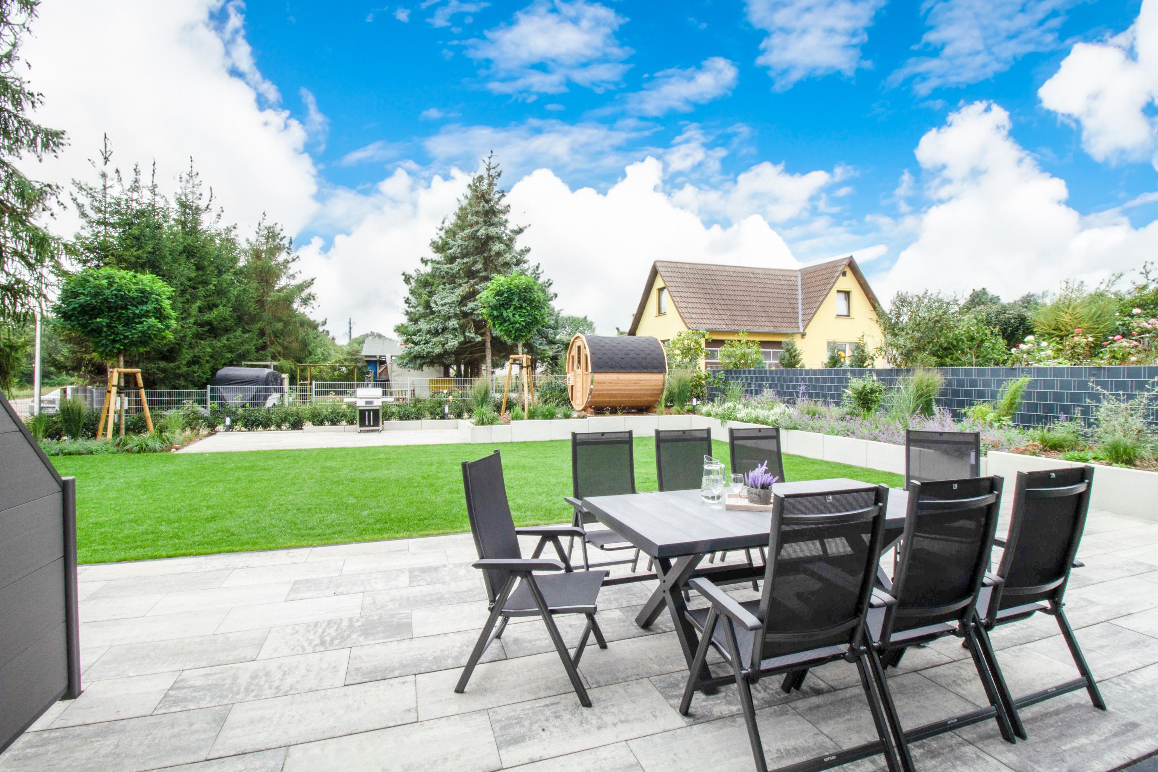 Die großzügige Terrasse mit angrenzendem Rasen lädt dazu ein, entspannte Stunden im Freien zu verbringen. Und für das absolute Wohlfühlerlebnis haben wir eine Fasssauna für Sie bereitgestellt. Genießen Sie nach einem aktiven Tag an der Ostsee die wohlige Wärme und lassen Sie die Seele baumeln.