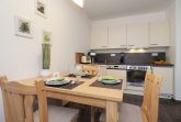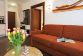 Der Wohnbereich erwartet Sie mit einer bequemen Couch, die eine Schlaffunktion (1,60x2,00m) bietet, sowie einem Sessel, einem Couchtisch und einem TV/Radio. Die moderne Küchenzeile, ausgestattet mit Cerankochfeld, Backofen, Geschirrspüler, Kühlschrank, Toaster, Kaffeemaschine usw., ist nahtlos in den Wohnbereich integriert. Der Essplatz lädt zu gemeinsamen Mahlzeiten ein.