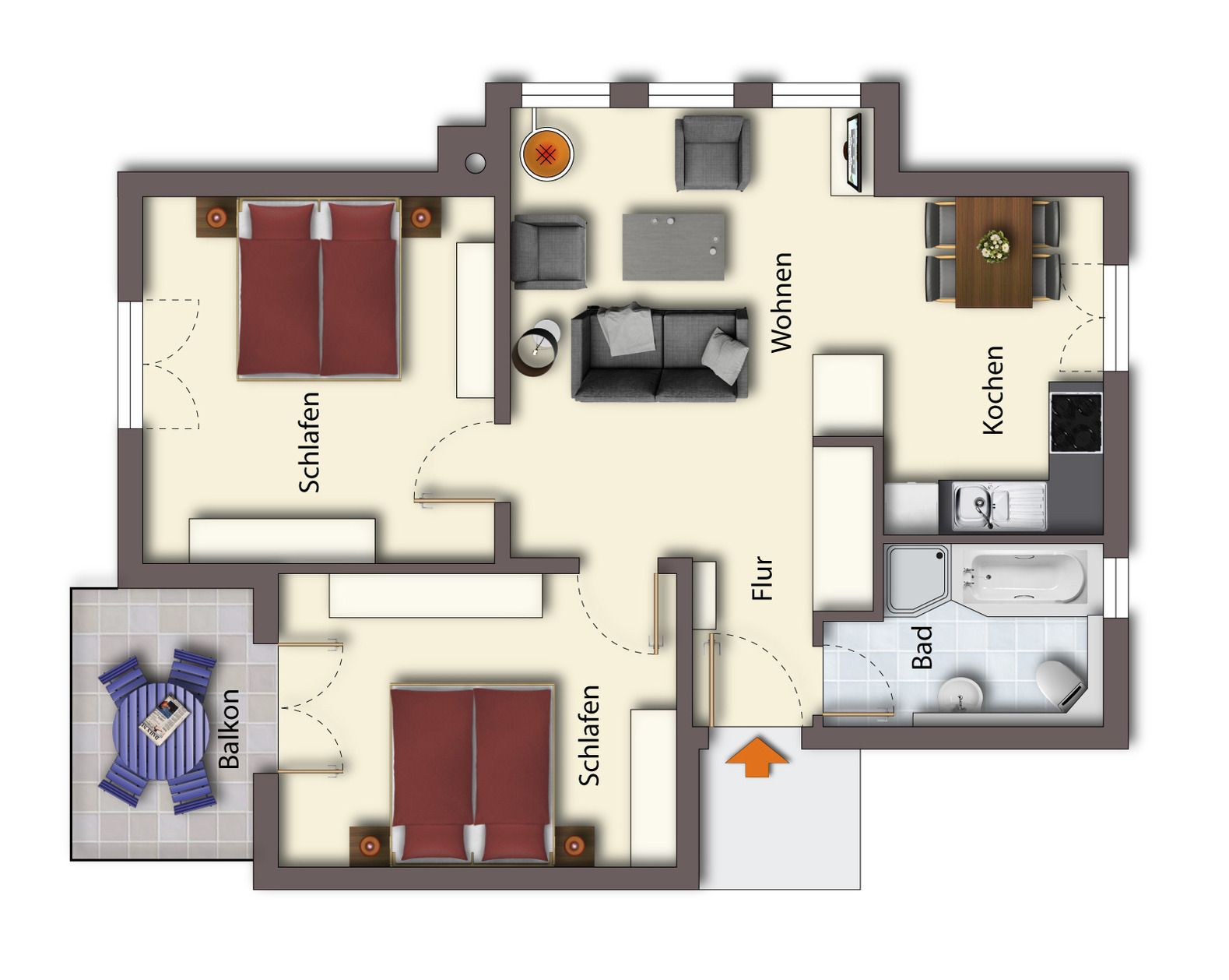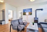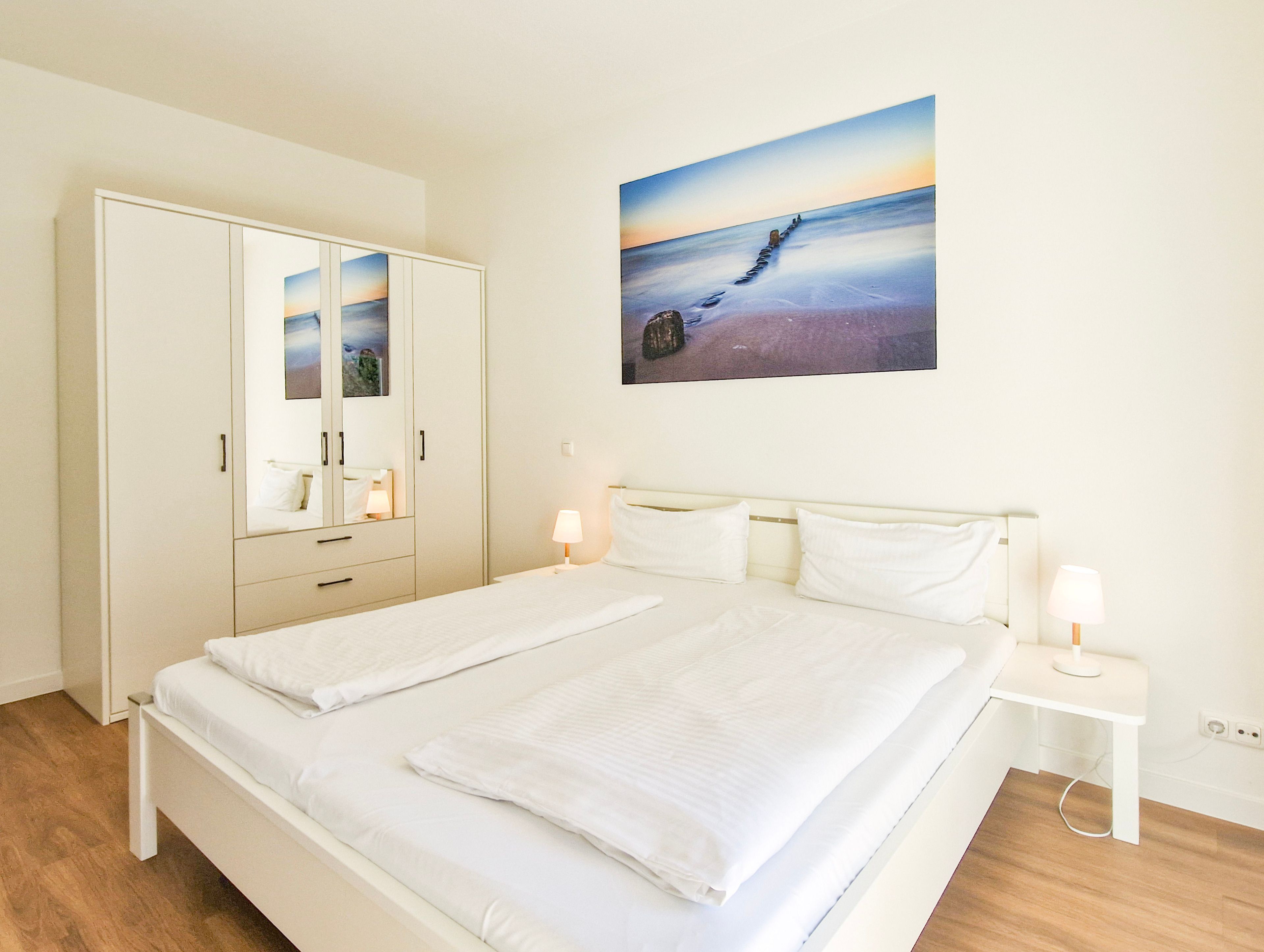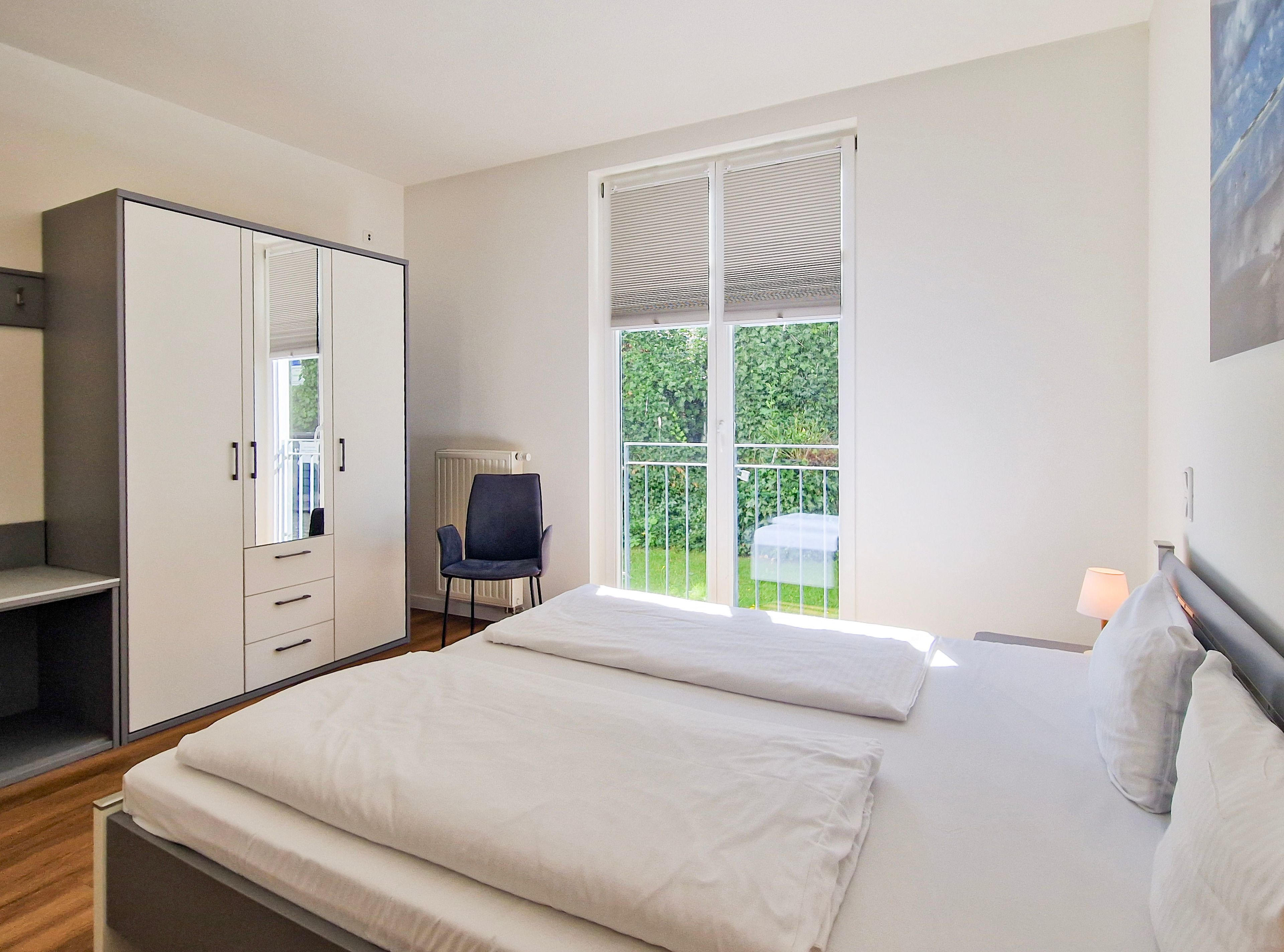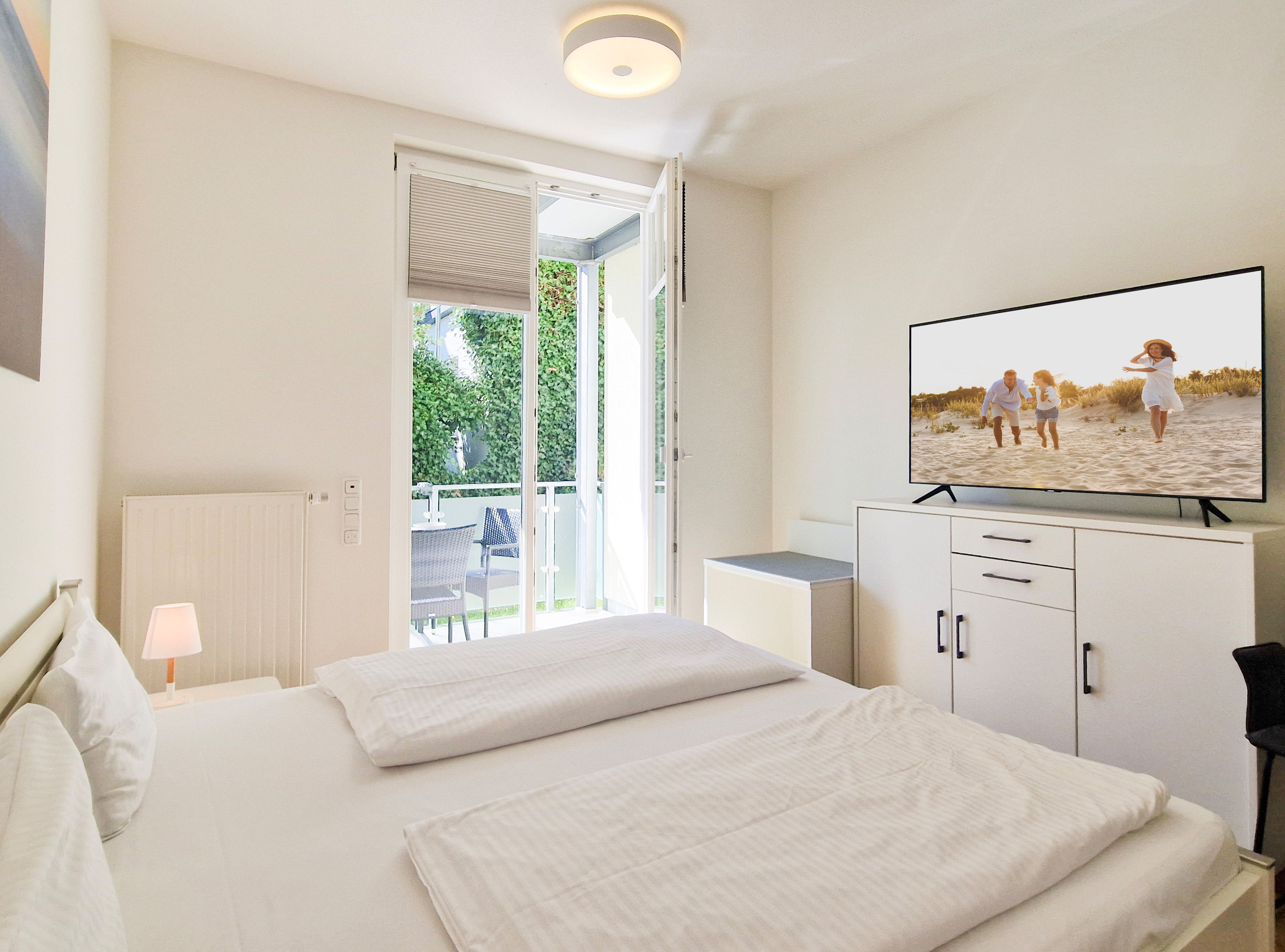 Dieses hochwertige, moderne 3-Zimmer Appartement ist 69 qm groß und befindet sich im Erdgeschoss. Die Wohnung mit 2 Schlafzimmern bietet 4 Personen reichlich Platz für einen erholsamen Urlaub am Meer. Im Wohnbereich erwartet Sie ein Kaminofen, eine bequeme Polstergarnitur mit Couchtisch und Flat TV sowie ein Esstisch für gemeinsame Mahlzeiten. Die Küche mit Cerankochfeld, Backofen, Mikrowelle, Geschirrspülmaschine, Kühlschrank etc. ist ebenfalls offen im Wohnraum integriert. Von hier aus können Sie einen kleinen Blick auf die Ostsee erhaschen. Über eines der Schlafzimmer erreichen Sie den südlich ausgerichteten überdachten Balkon. Hier ist Sonne garantiert. Die Schlafzimmer verfügen jeweils über ein komfortables Doppelbett mit getrennten Matratzen (90 x 200), einen Kleiderschrank sowie Kofferablage. Eines der Schlafzimmer ist mit einem zusätzlichen TV ausgestattet. Das Badezimmer mit Fenster ist mit Badewanne, Dusche und Waschtisch/WC ausgestattet. Ein Pkw-Stellplatz, der der Wohnung zugeordnet ist, steht den Gästen vor dem Haus zur Verfügung. Der Fahrradraum, als auch Waschmaschine und Trockner im Keller, kann von den Gästen genutzt werden.