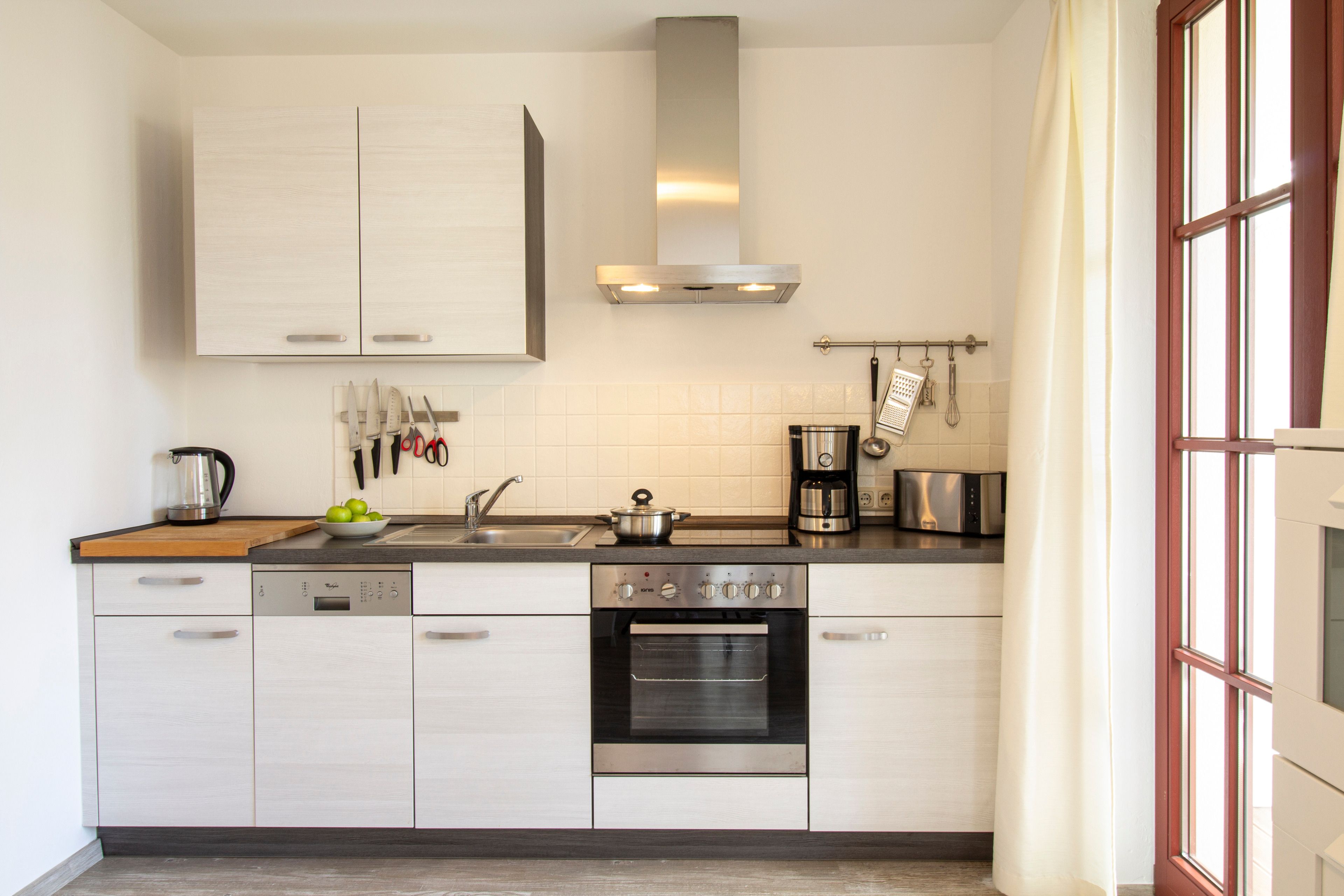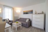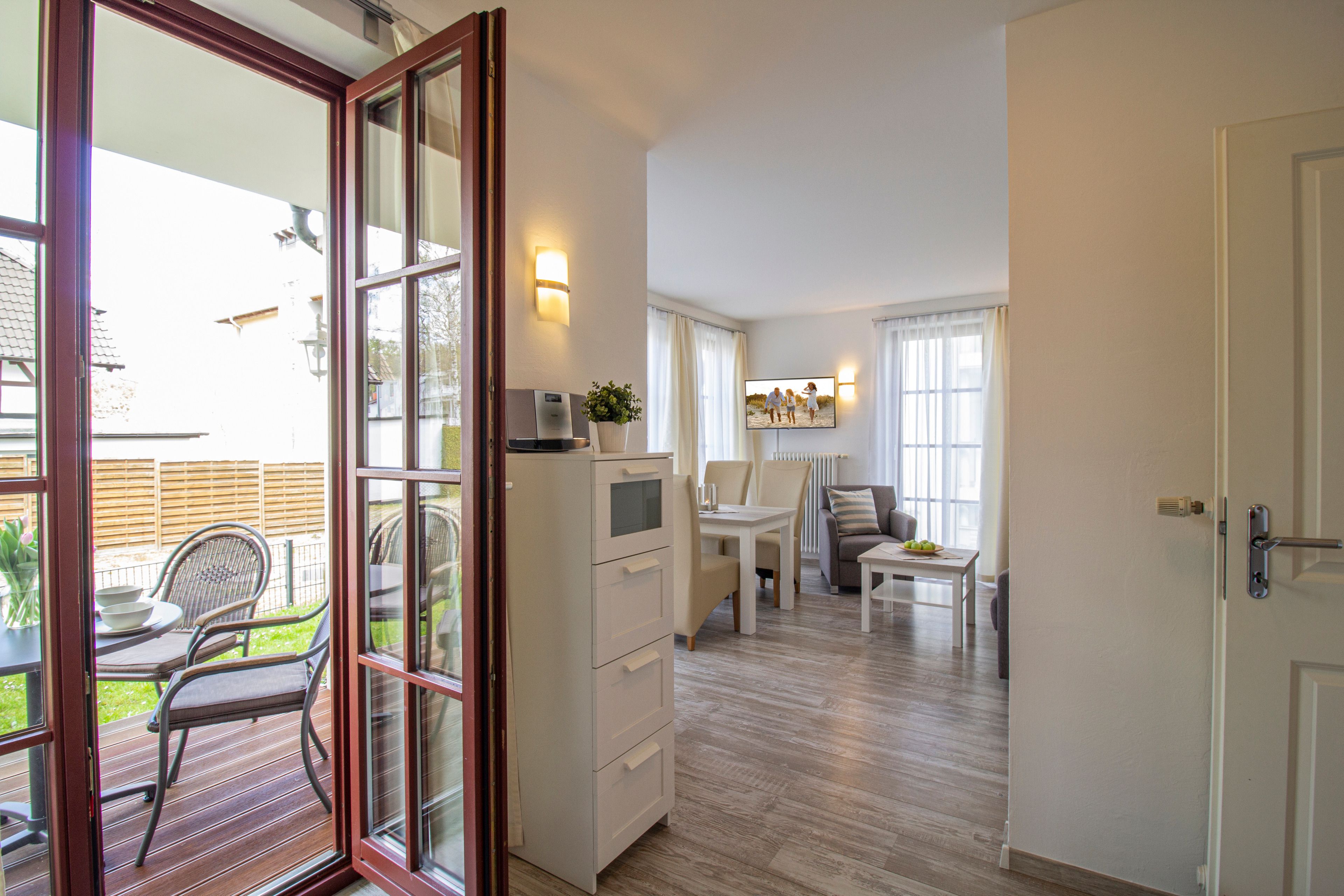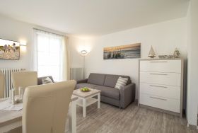Dieses modern und komfortabel eingerichtete 45 qm große 2-Zimmer-Appartement liegt im Erdgeschoss und eignet sich für 2-4 Personen. Der helle Wohnraum ist mit einer gemütlichen Sitzecke mit Schlaffunktion, Flat TV, sowie einem Essbereich für bis zu 4 Personen ausgestattet. Die ebenfalls offen im Wohnbereich integrierte Küchenzeile ist mit Geschirrspüler, Cerankochfeld mit Backofen, Kühlschrank etc. ausgestattet. Eine kleine Terrasse mit westlicher Ausrichtung steht den Gästen zur Nutzung zur Verfügung. Das helle Schlafzimmer verfügt über ein Doppelbett mit getrennten Matratzen und einen Kleiderschrank. Das Bad ist mit Dusche und Waschtisch/WC ausgestattet.