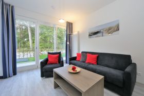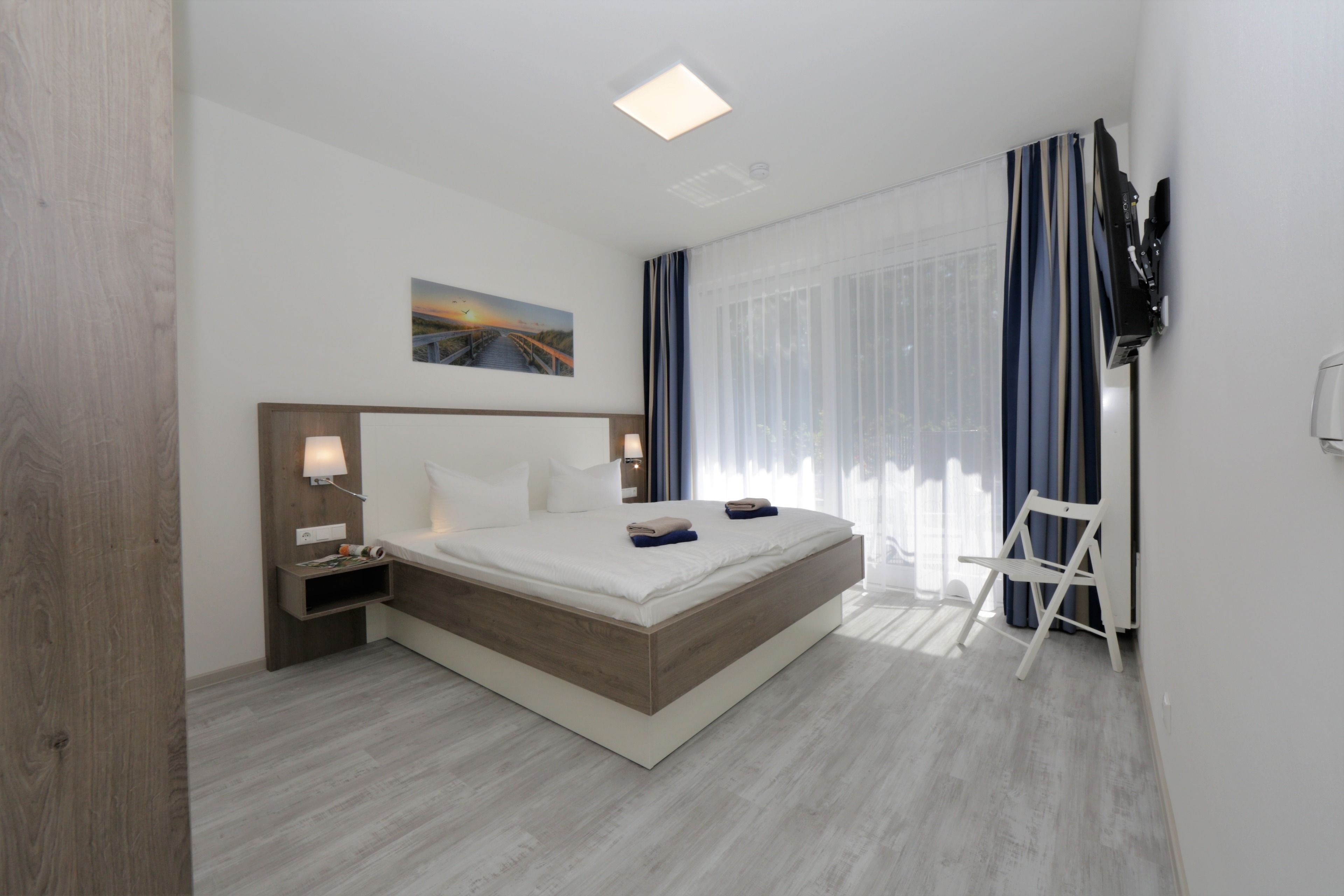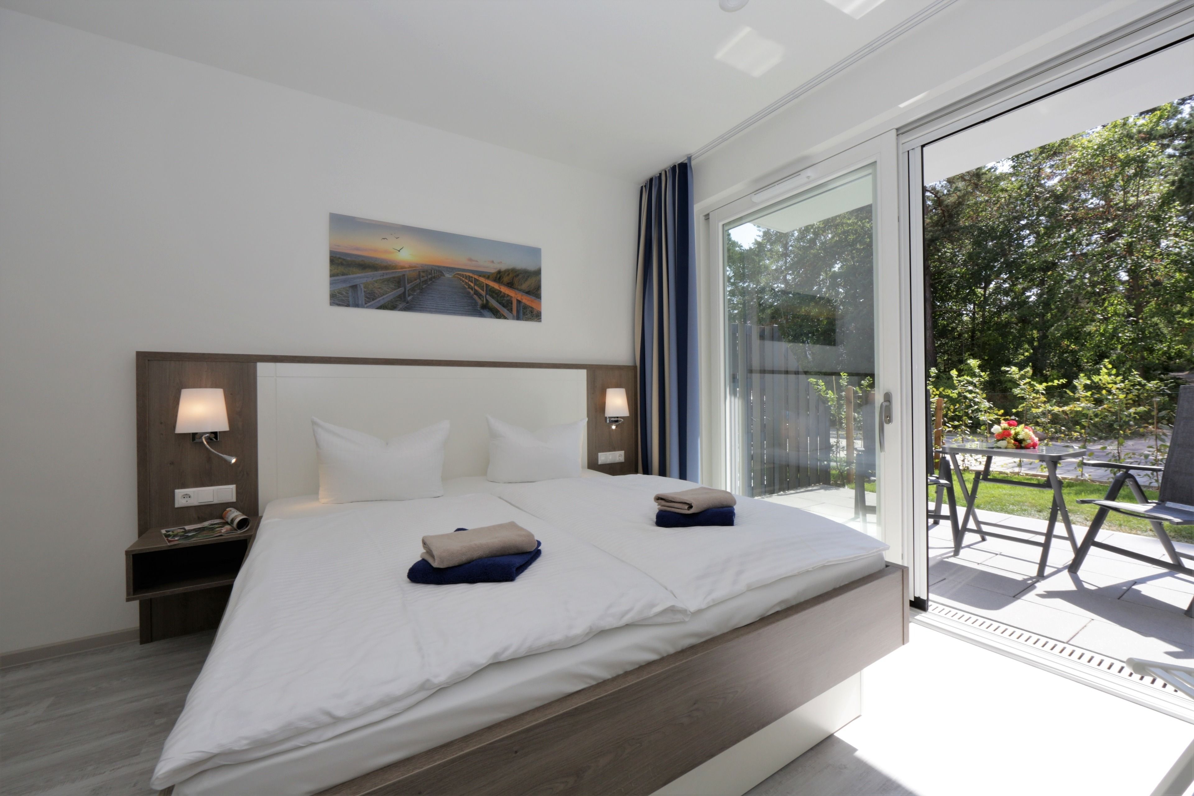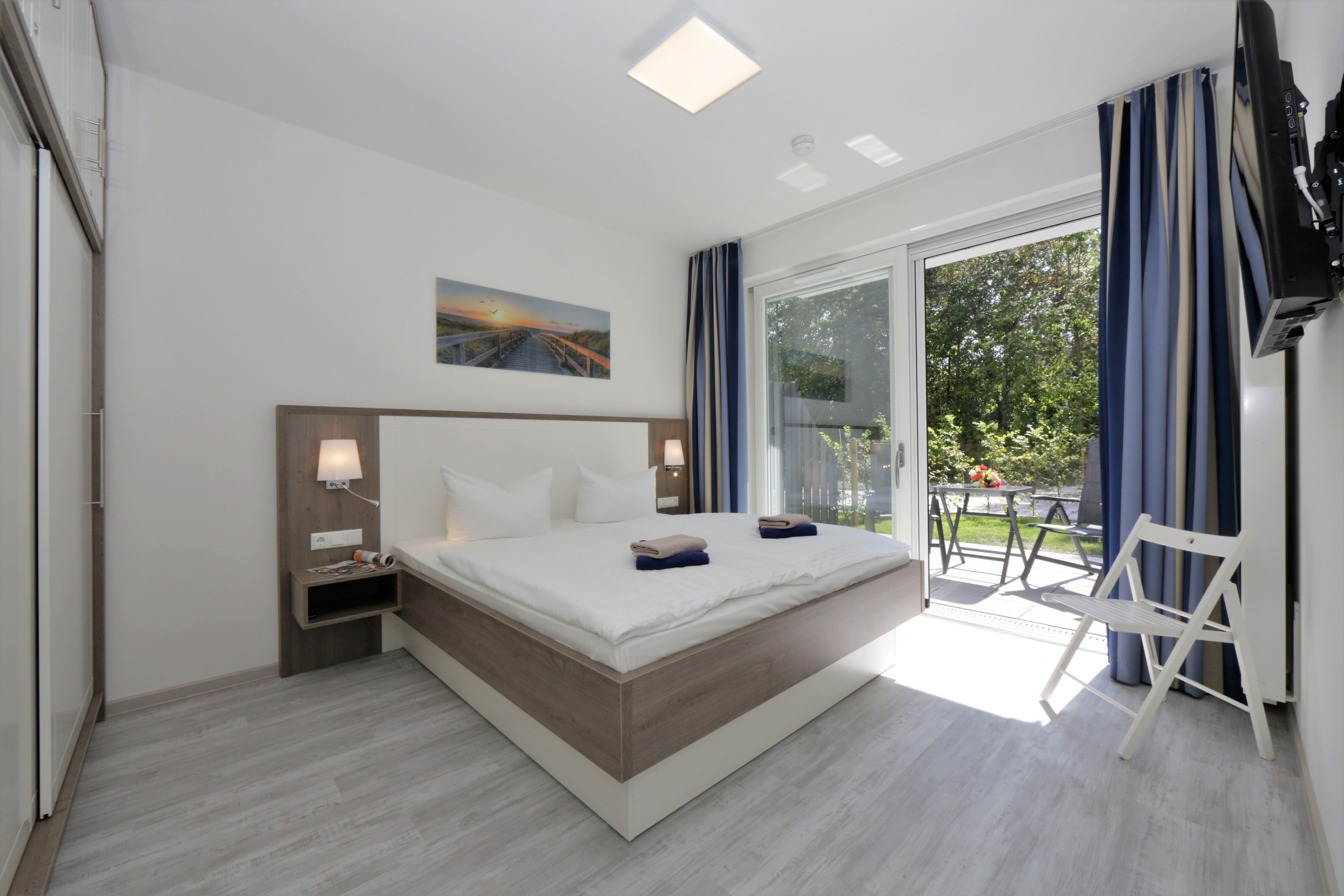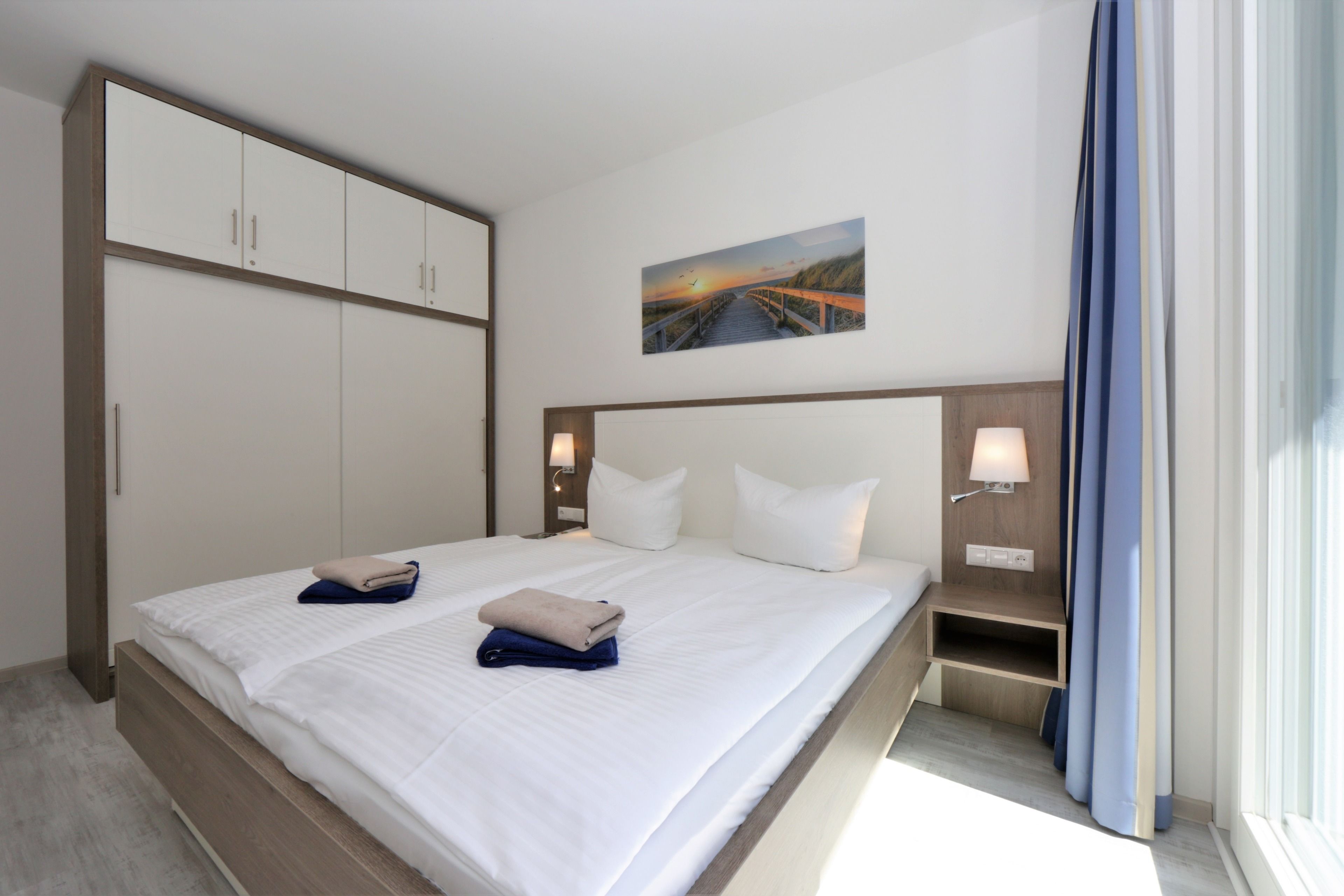 Dieses hochwertig und modern eingerichtete 2-Zimmer Appartement für maximal 2 Personen ist 51 qm groß und befindet sich im Erdgeschoss der 2018 neu erbauten Strandresidenz. Im Wohnbereich erwartet Sie eine bequeme Polstergarnitur bestehend aus einem Sofa mit Schlaffunktion (Matratze 160 x 200) und Sessel, einem Couchtisch und Flat TV. Der Essplatz für gemeinsame Mahlzeiten und die moderne Küche mit Cerankochfeld, Backofen, Mikrowelle, Geschirrspülmaschine, Kühlschrank, Tiefkühlschrank etc. sind ebenfalls offen im Wohnraum integriert. Über den Wohnbereich sowie das Schlafzimmer erreichen Sie die zum Süden ausgerichteten, teilweise überdachte Terrasse, die viele Sonnenstunden verspricht. Das Schlafzimmer verfügt über ein komfortables Doppelbett mit getrennten Matratzen (90 x 200), einen Kleiderschrank und TV. Das großzügige moderne Badezimmer ist mit einer bodengleichen Dusche mit Echtglasabtrennung und Waschtisch/WC ausgestattet. Ein Pkw-Stellplatz, der der Wohnung zugeordnet ist, steht den Gästen vor dem Haus zur Verfügung. Mitgebrachte Fahrräder können im Fahrradkeller abgestellt werden.