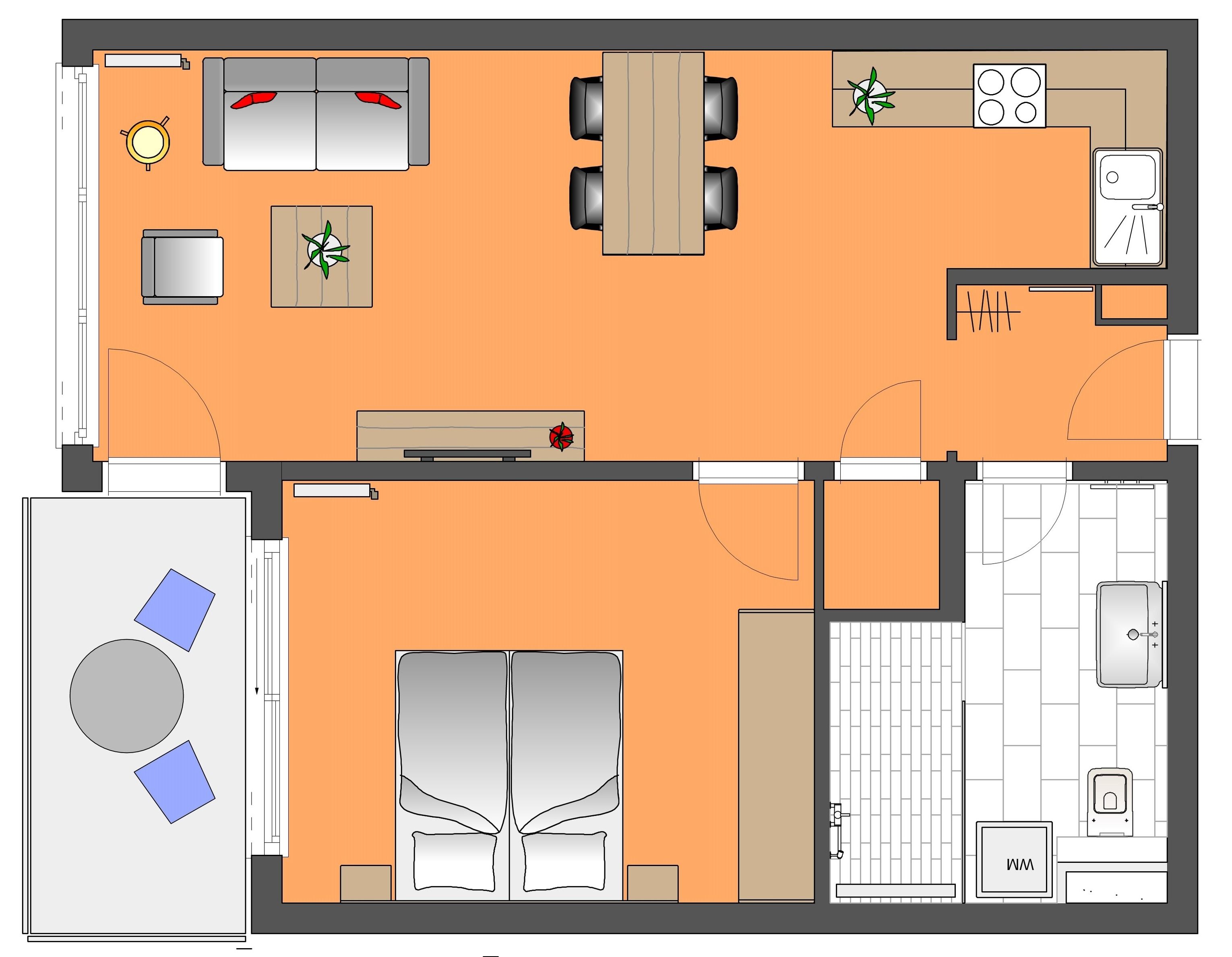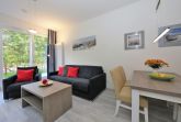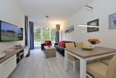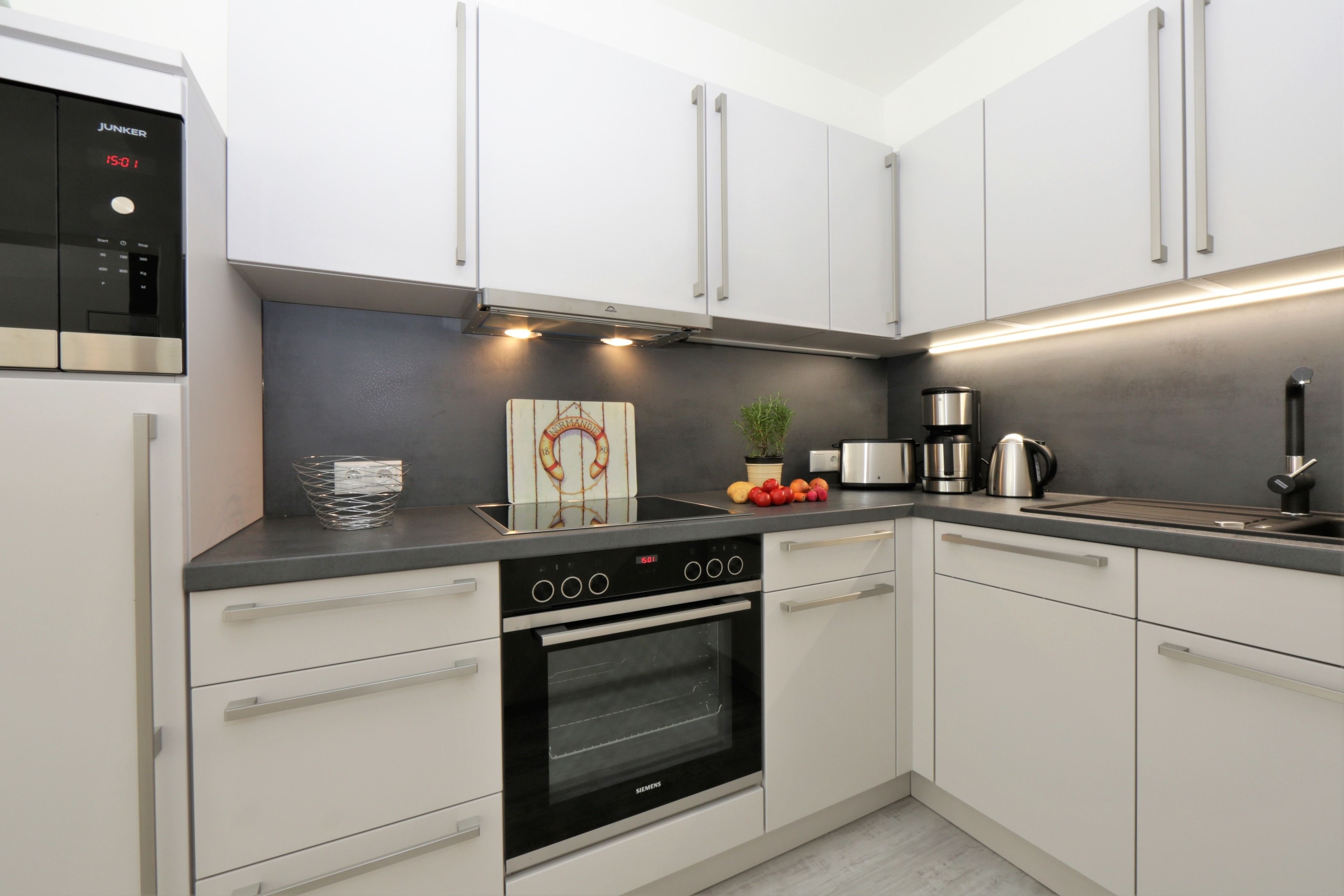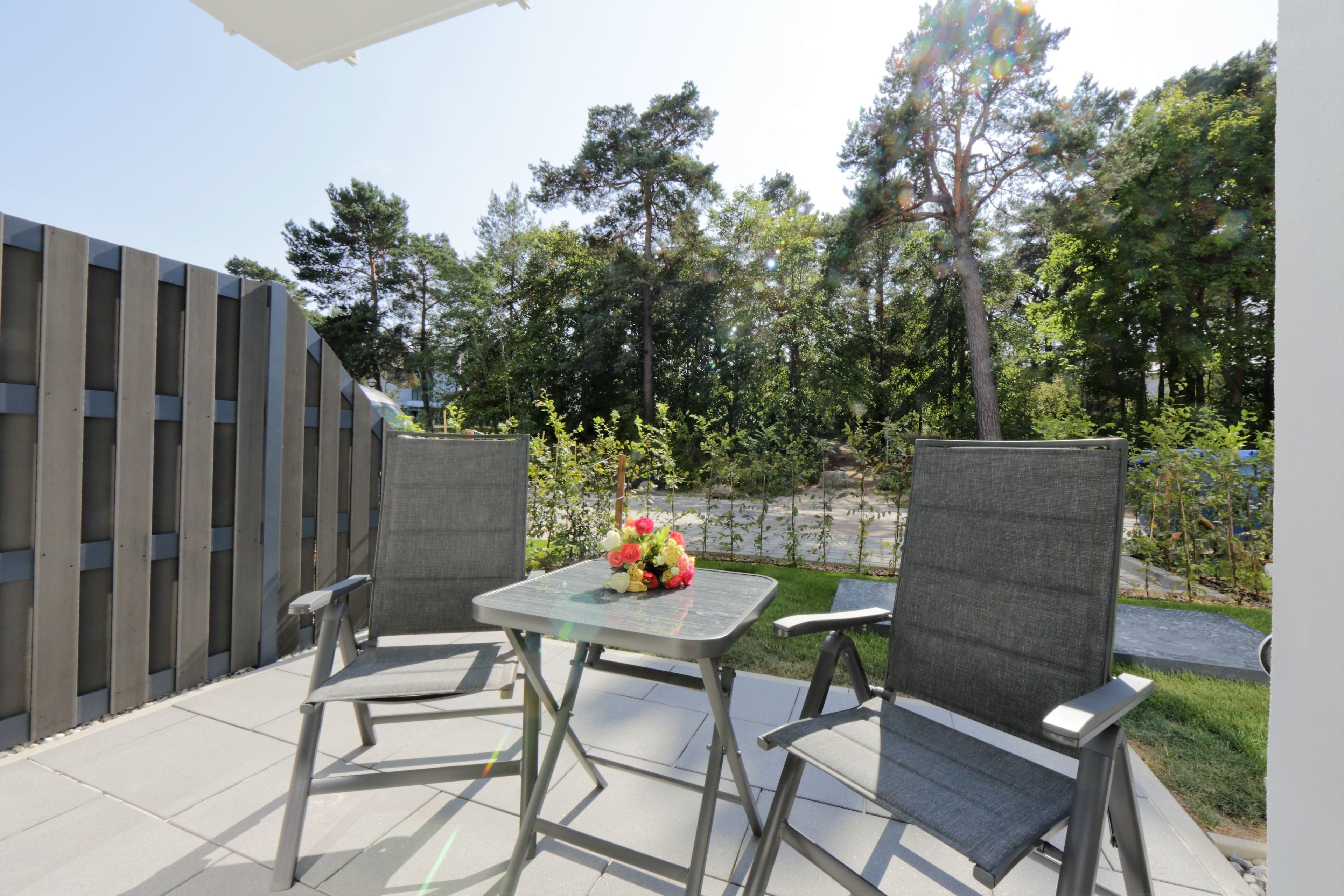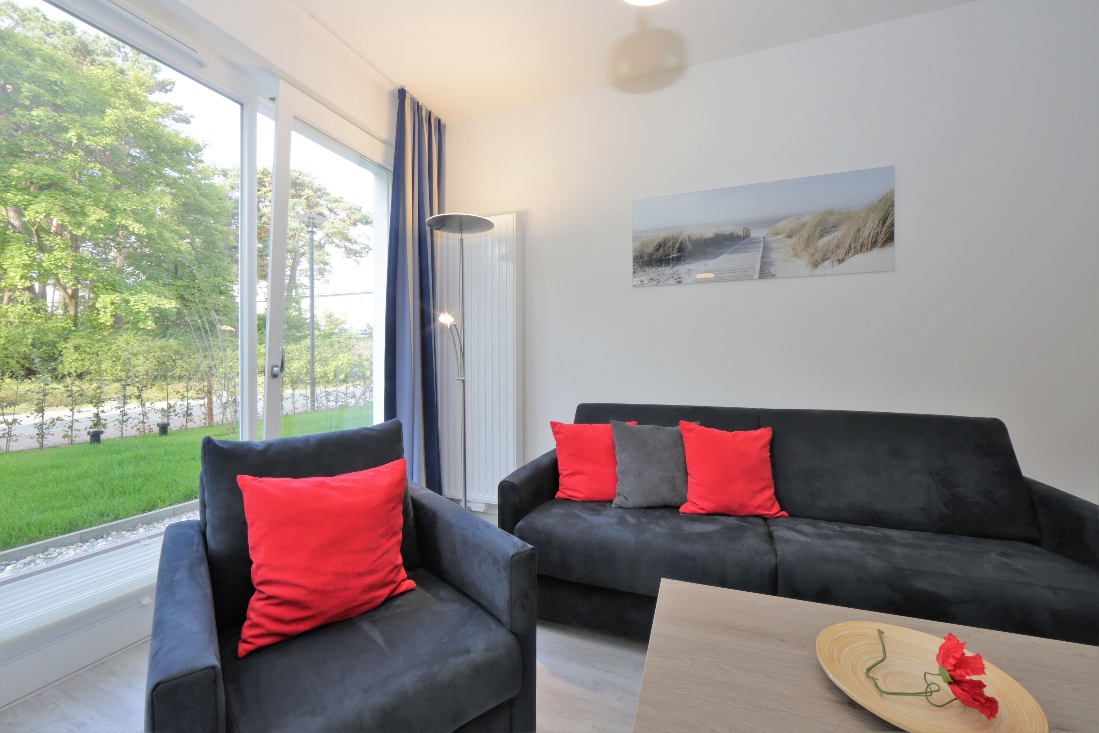 Dieses hochwertig und modern eingerichtete 2-Zimmer Appartement für maximal 2 Personen ist 51 qm groß und befindet sich im Erdgeschoss der 2018 neu erbauten Strandresidenz. Im Wohnbereich erwartet Sie eine bequeme Polstergarnitur bestehend aus einem Sofa mit Schlaffunktion (Matratze 160 x 200) und Sessel, einem Couchtisch und Flat TV. Der Essplatz für gemeinsame Mahlzeiten und die moderne Küche mit Cerankochfeld, Backofen, Mikrowelle, Geschirrspülmaschine, Kühlschrank, Tiefkühlschrank etc. sind ebenfalls offen im Wohnraum integriert. Über den Wohnbereich sowie das Schlafzimmer erreichen Sie die zum Süden ausgerichteten, teilweise überdachte Terrasse, die viele Sonnenstunden verspricht. Das Schlafzimmer verfügt über ein komfortables Doppelbett mit getrennten Matratzen (90 x 200), einen Kleiderschrank und TV. Das großzügige moderne Badezimmer ist mit einer bodengleichen Dusche mit Echtglasabtrennung und Waschtisch/WC ausgestattet. Ein Pkw-Stellplatz, der der Wohnung zugeordnet ist, steht den Gästen vor dem Haus zur Verfügung. Mitgebrachte Fahrräder können im Fahrradkeller abgestellt werden.