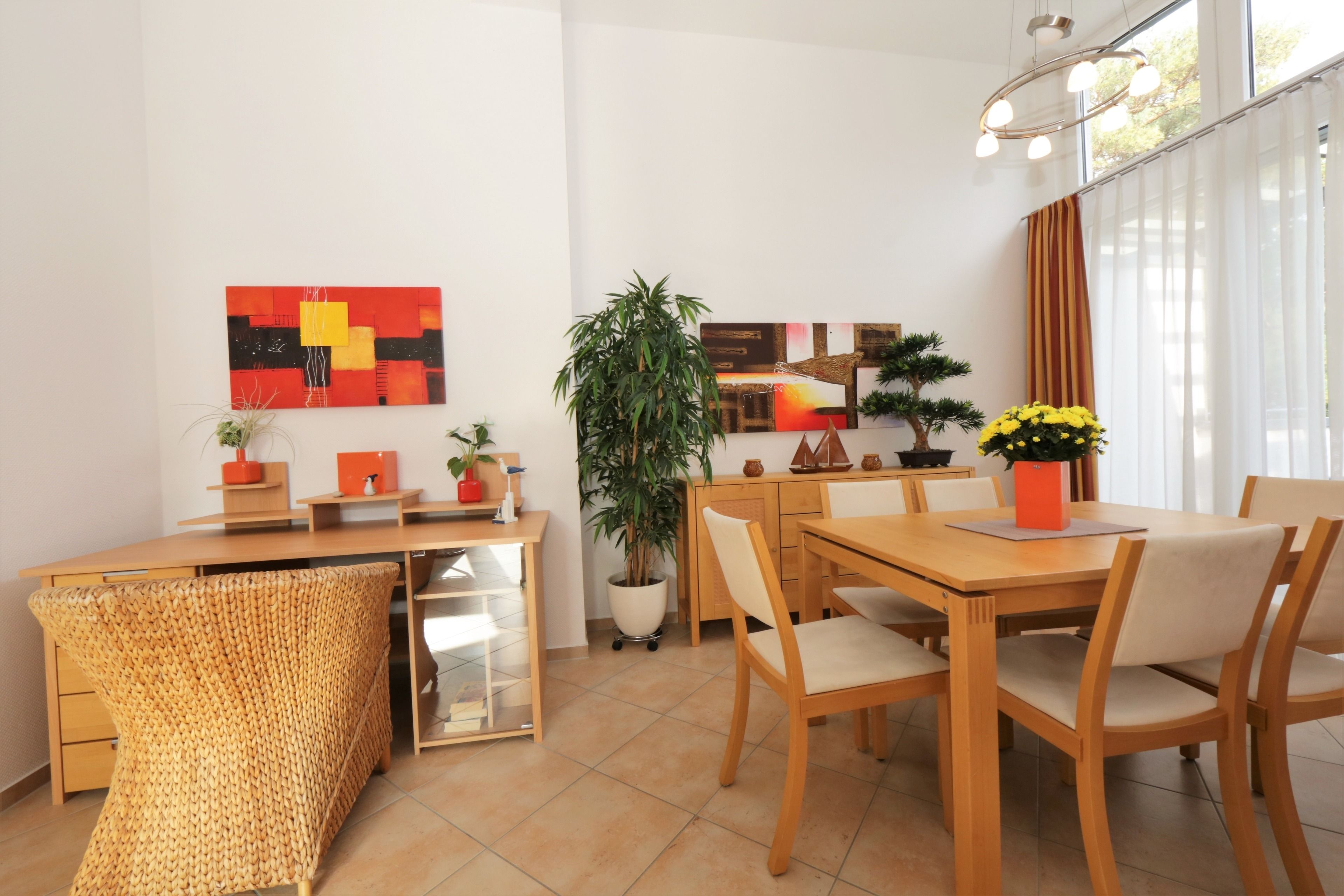 Diese 80 qm große 2-Zimmer Wohnung im Dachgeschoss erreichen Sie über den Aufzug. Der großzügige Wohnbereich mit reichlich Fenstern verfügt über eine gemütliche Sitzecke mit großem Flat-TV und Musikanlage. Die moderne Vollküche incl. Spülmaschine, Ceranfeld, Backofen, Kühlschrank, Mikrowelle etc. bietet viel Platz. Ein Essplatz für 6 Personen ist ebenfalls offen im Wohnraum integriert. Vom Essplatz können Sie den angrenzenden Seebalkon betreten, von dem aus Sie durch die Kiefern einen Blick auf die Ostsee erhaschen können. Am Schreibtisch können Sie Ihre Ansichtskarten mit Urlaubsgrüßen versehen. Das große Schlafzimmer mit einem Bad en suite ist mit einem Doppelbett mit getrennten Matratzen (90 x 200) und genügend Schrankraum ausgestattet. Hier steht Ihnen ein zweiter Flat TV zur Unterhaltung zur Verfügung. Das großzügige Bad verfügt über Badewanne und Waschtisch/WC. Vom Bad als auch aus der Küche können Sie den kleineren Ostbalkon betreten, der am Vormittag viel Sonne verspricht. Das zweite Bad erreichen Sie aus der Diele, es ist mit Dusche und Waschtisch/WC ausgestattet. Ein PKW-Stellplatz steht Ihnen auf dem abgeschlossenen Grundstück zur Verfügung. Ein Abstellraum für Fahrräder und ein Waschraum mit Waschmaschine und Trockner sind im Keller vorhanden (Münzbetrieb). Im Nachbarhaus Villa Darja erreichen Sie die Wellness-Räume mit Sauna (Münzbetrieb).