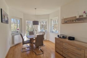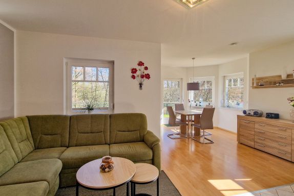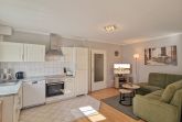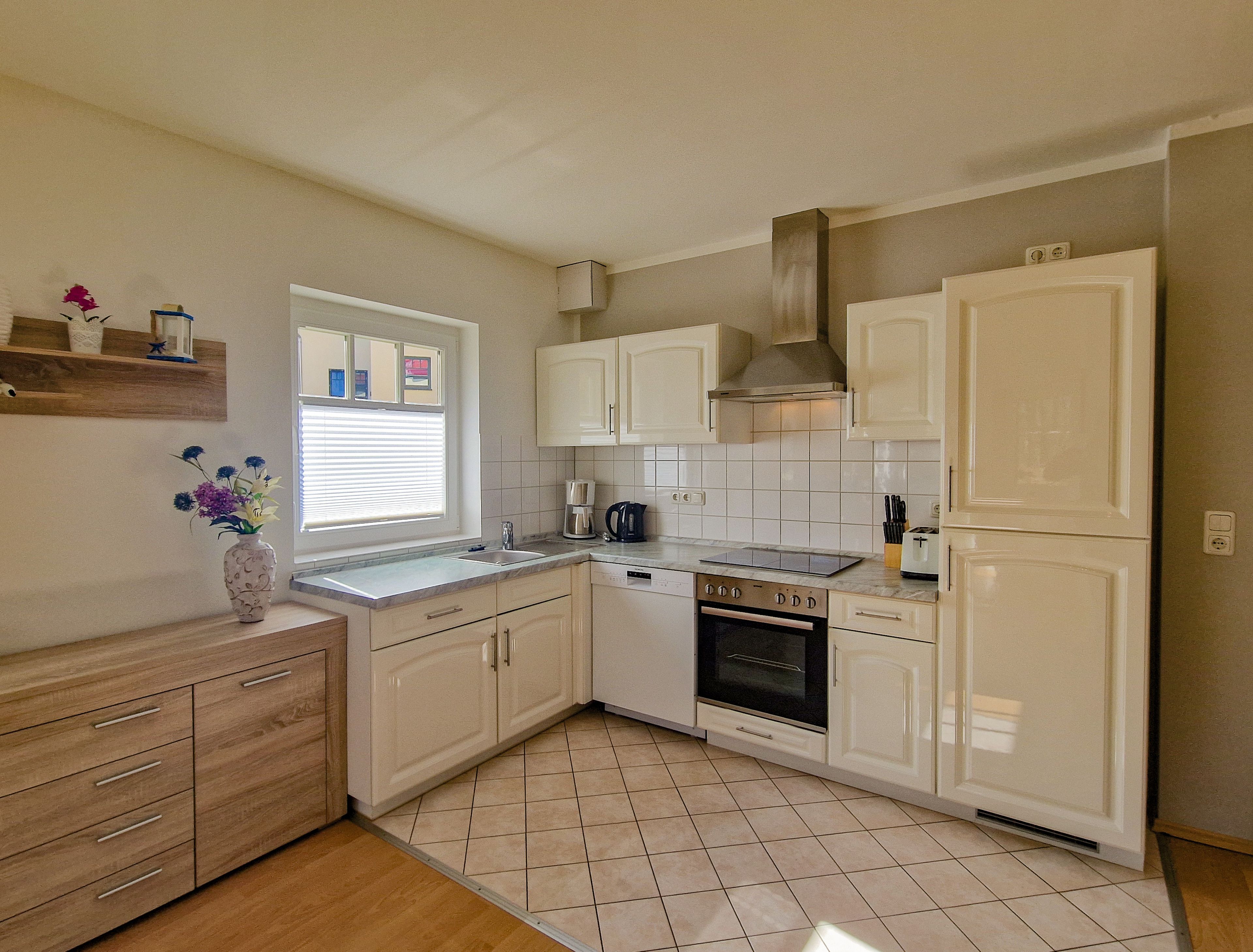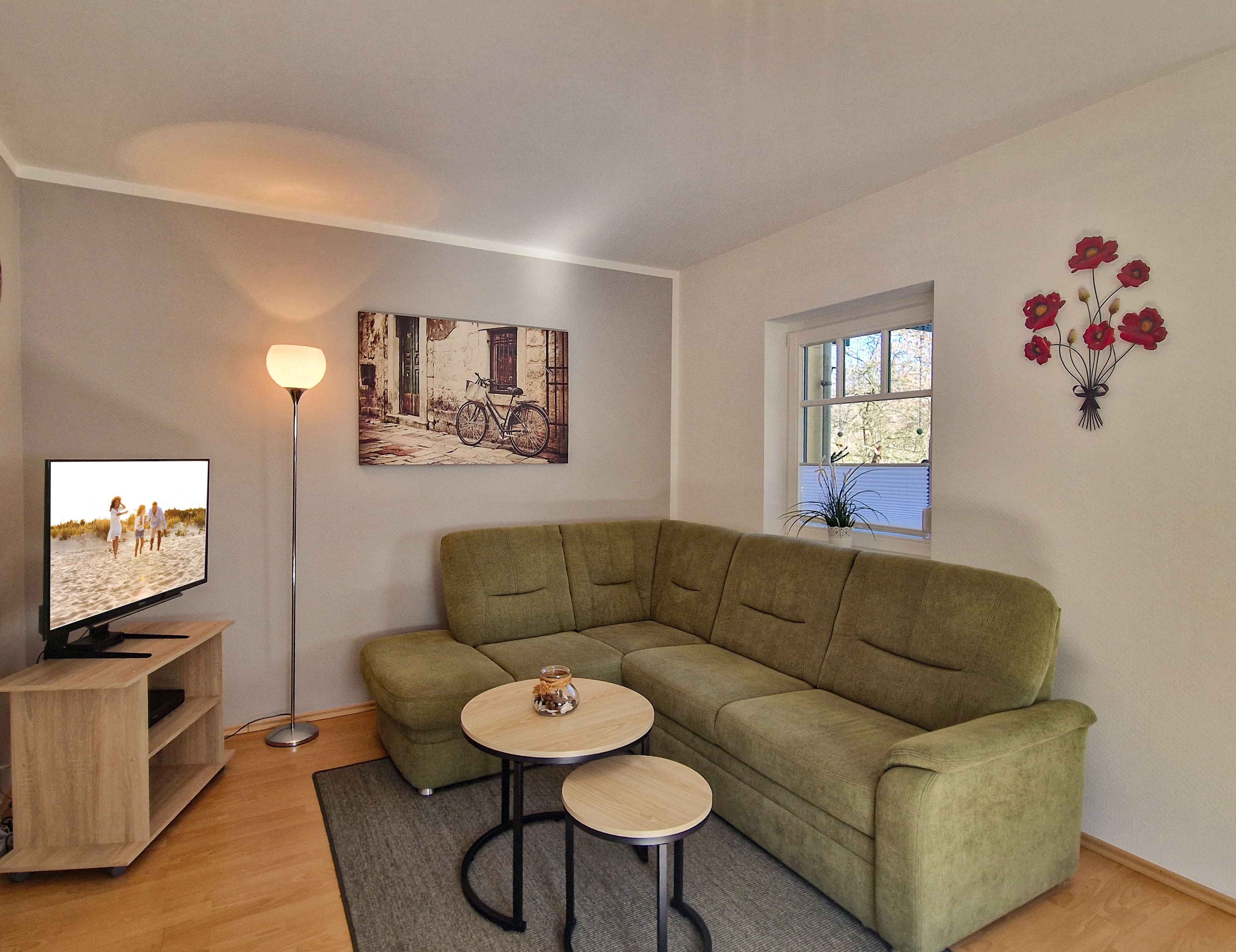 Diese herrlich sonnige 2 Zimmer-Wohnung bietet mit Ihren 59 qm 2 – 4 Personen allen Komfort für einen erholsamen Ferienaufenthalt. Der hell eingerichtete Wohnraum verfügt über eine gemütliche Sitzecke (mit Schlaffunktion) und Flat TV. Von hier aus finden die Gäste auch Zugang zu der ruhigen Terrasse, die ins Grüne schaut und viele Sonnenstunden verspricht. Der Essplatz für 4 Personen sowie eine Vollküche incl. Kühlschrank, Geschirrspüler, Backofen mit Ceranfeld, Mikrowelle etc. sind ebenfalls im Wohnbereich integriert. Essplatz und Küche gestatten ebenfalls einen Blick nach draußen. Das großzügige Schlafzimmer ist mit einem Boxspringbett (1,80 m x 2,00 m mit durchgehenden Topper) und genügend Schrankraum ausgestattet. Ein Bad mit Dusche und Waschbecken/WC runden diese Wohnung ab. Ein Pkw-Stellplatz befindet sich direkt vor der Tür.