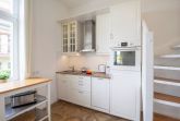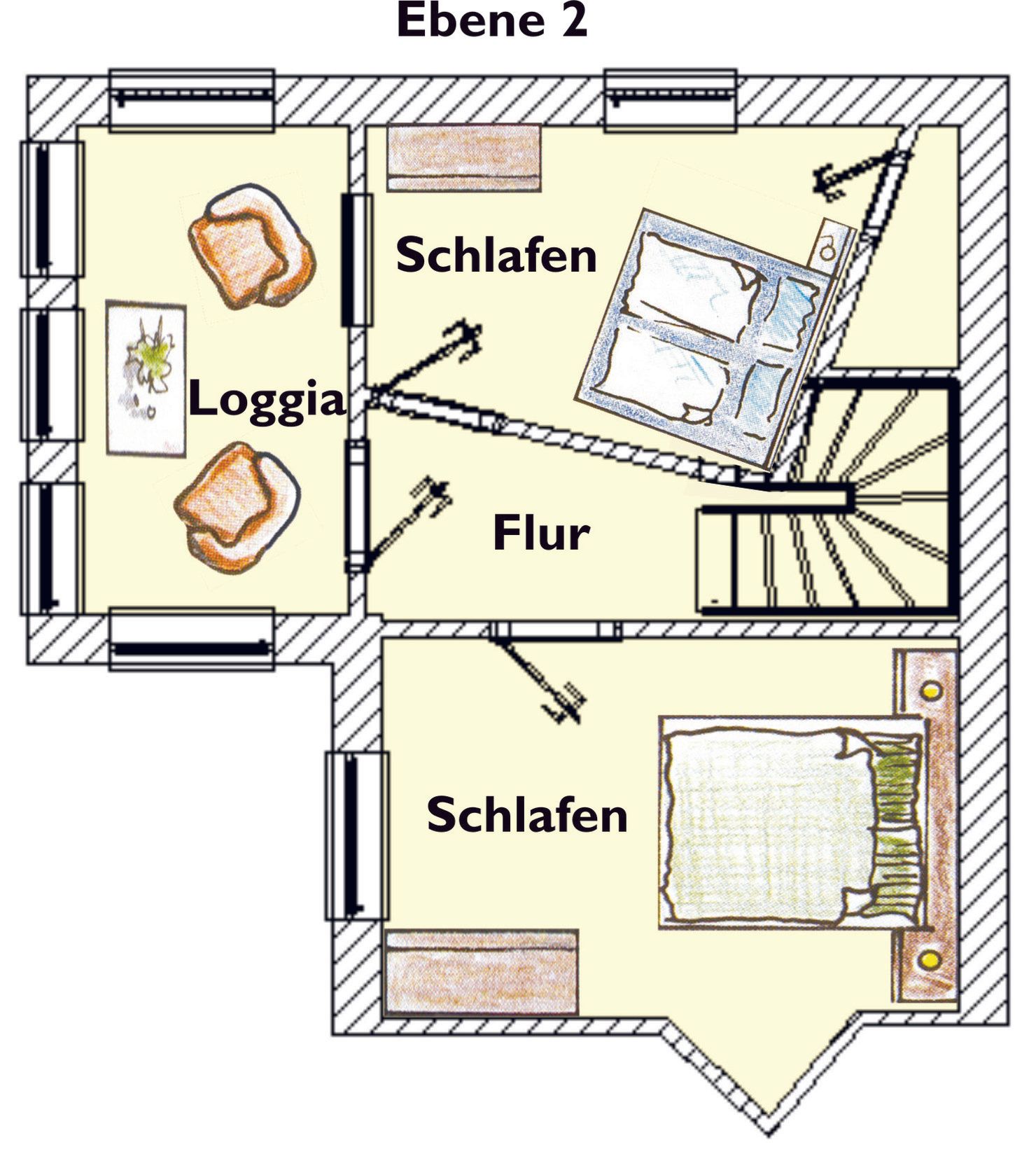 Diese großzügige lichtdurchflutete 3-Zimmer Maisonettwohnung liegt im Erd- bzw. 1. Obergeschoss mit einer möblierten Terrasse zur Seeseite mit Blick auf die Promenade. Der Wohnraum im unteren Bereich beherbergt eine kleinere Couchecke mit Flat TV sowie die offene Vollküche inkl. Ceranfeld mit Backofen, Kühlschrank, Spülmaschine etc. In der angrenzenden Loggia lädt ein großer Essplatz zu gemeinsamen Mahlzeiten ein. Das Bad liegt ebenfalls auf der unteren Ebene und ist mit einer ebenerdigen Echtglasdusche und Waschtisch/WC ausgestattet. Beide Schlafzimmer liegen auf der oberen Ebene, sind über eine Treppe aus dem Wohnbereich zu erreichen und mit einem Doppelbett mit getrennten Matratzen und einem begehbaren bzw. großen Kleiderschrank eingerichtet. Das Highlight dieser Wohnung ist die zweite Loggia, die an eines der beiden Schlafzimmer grenzt und mit zwei bequemen Sesseln eingerichtet ist. Von hier aus können Sie das Meer nicht nur riechen sondern teilweise auch durch die Bäume sehen. Der Blick reicht bis zur Ahlbecker Seebrücke. Dieser herrliche Platz lädt zum Lesen, Träumen und Relaxen ein. Die Gäste, die Sonne und Seeluft lieber aus erster Hand genießen, können die Terrasse nutzen, die bis um die Hausecke reicht.