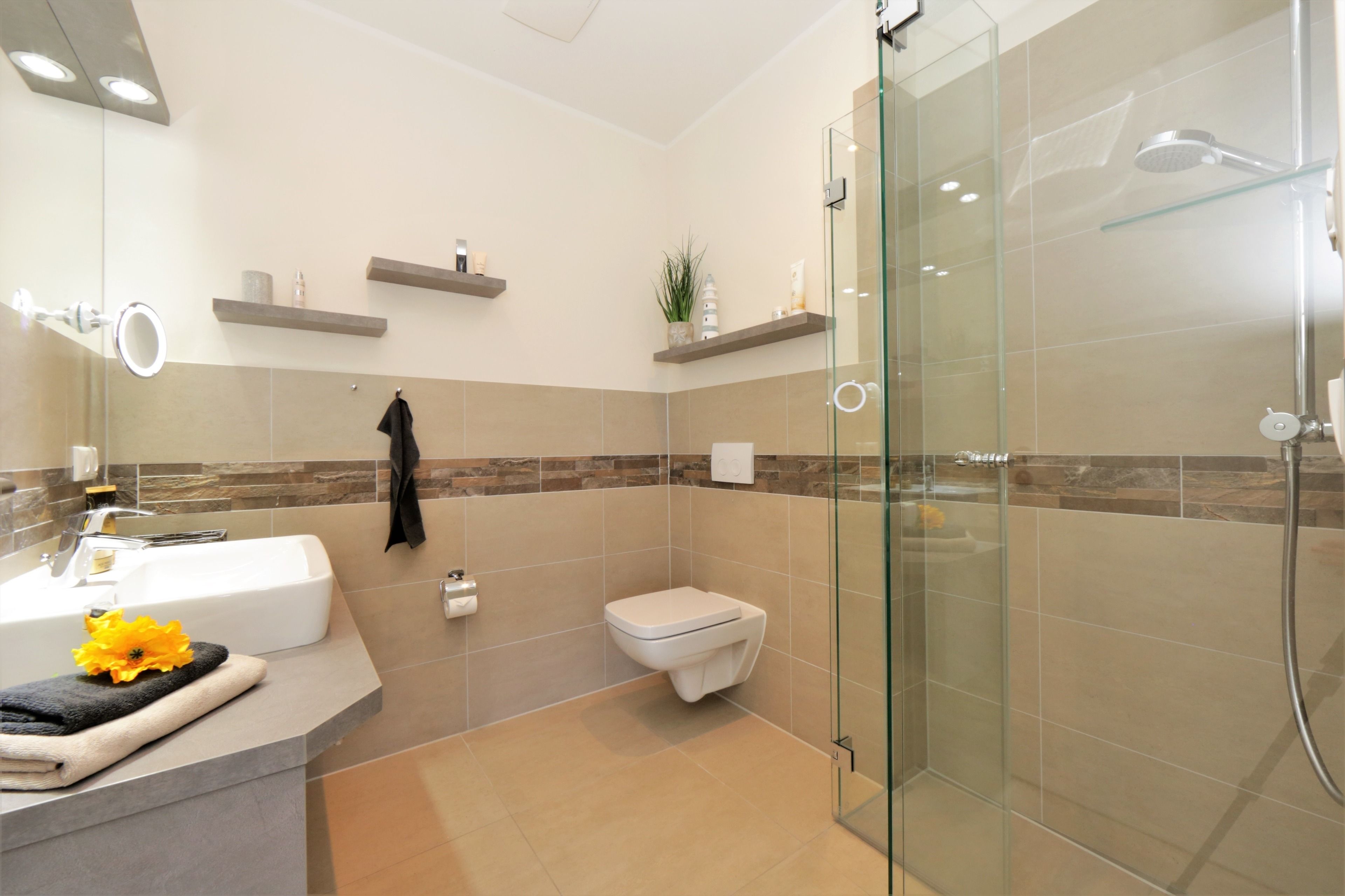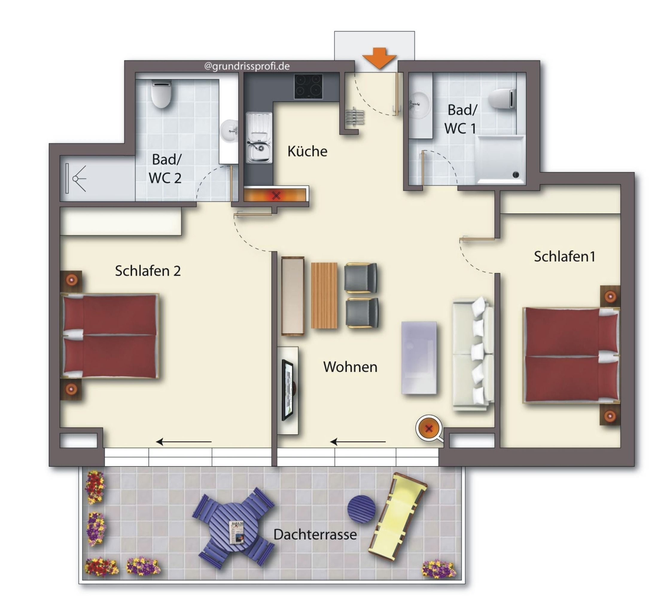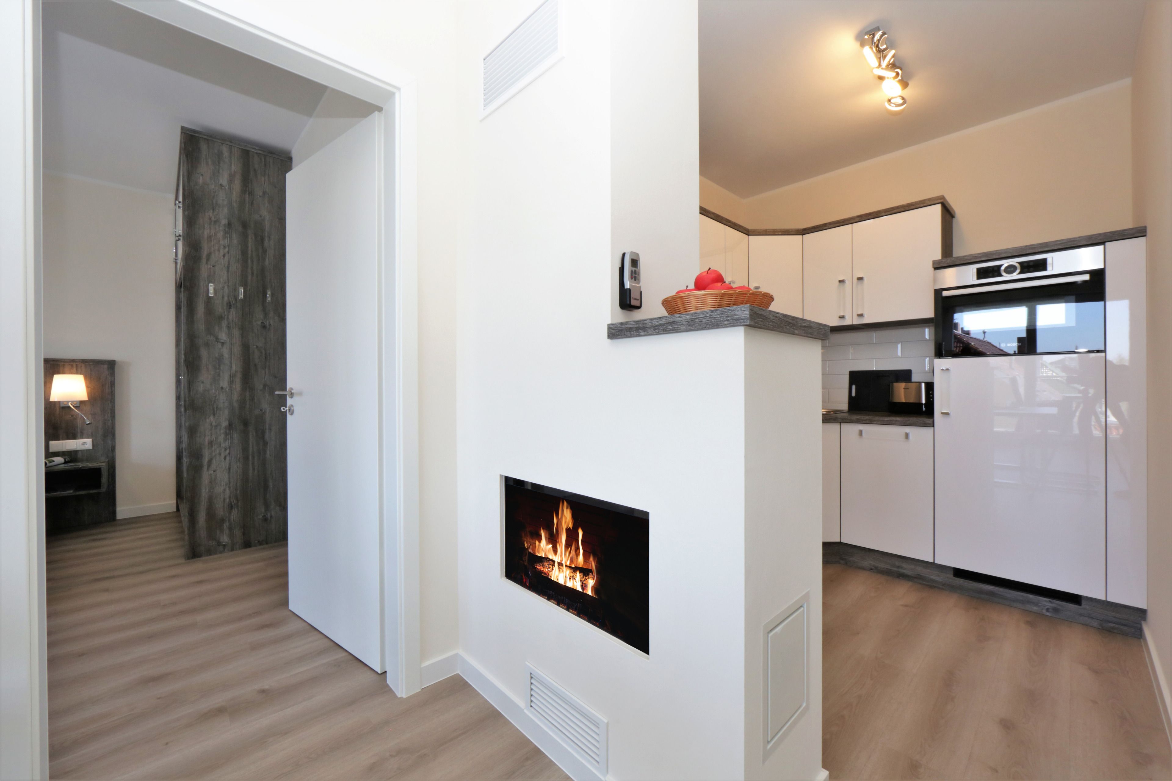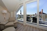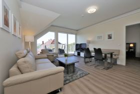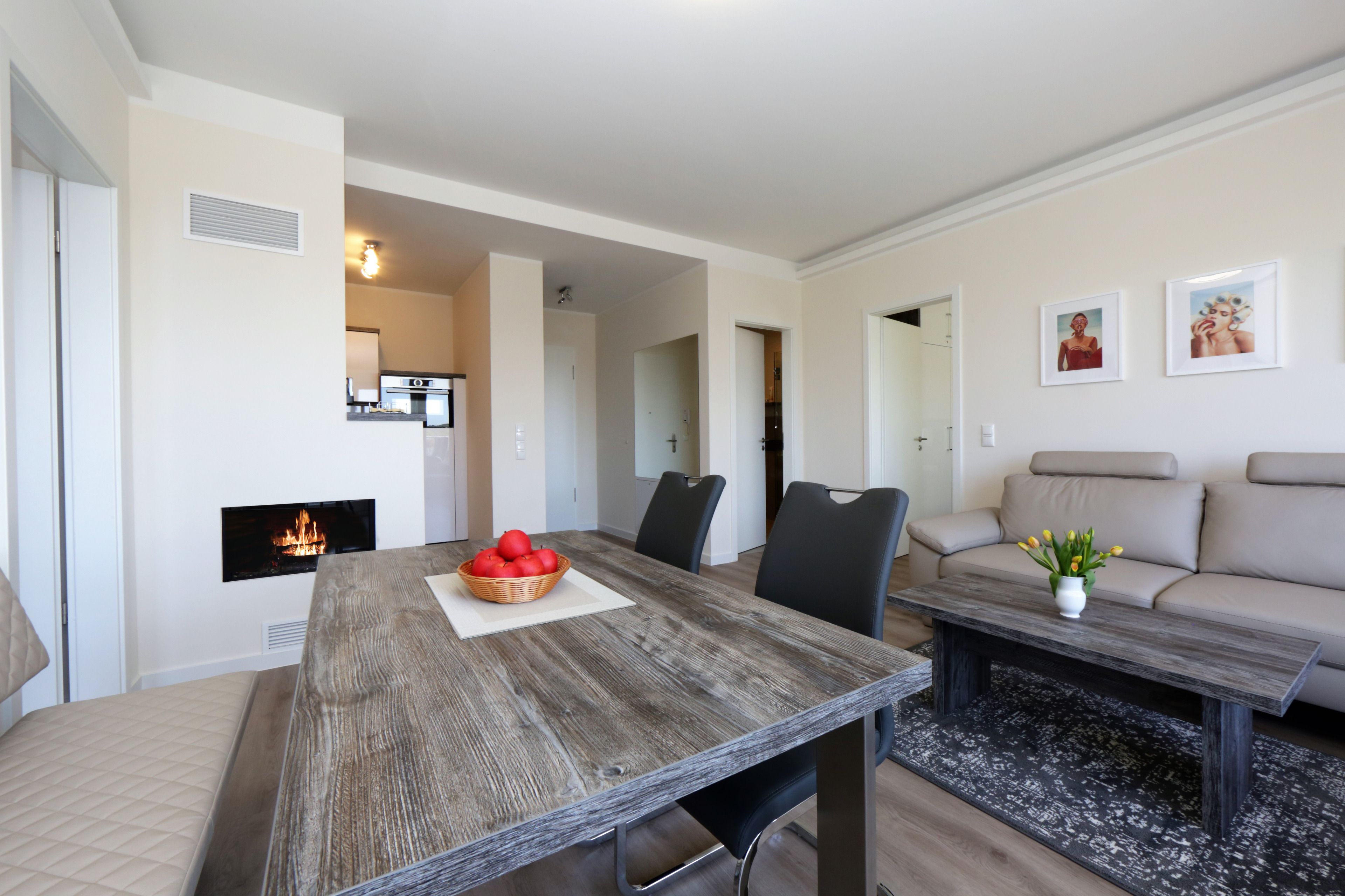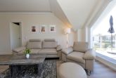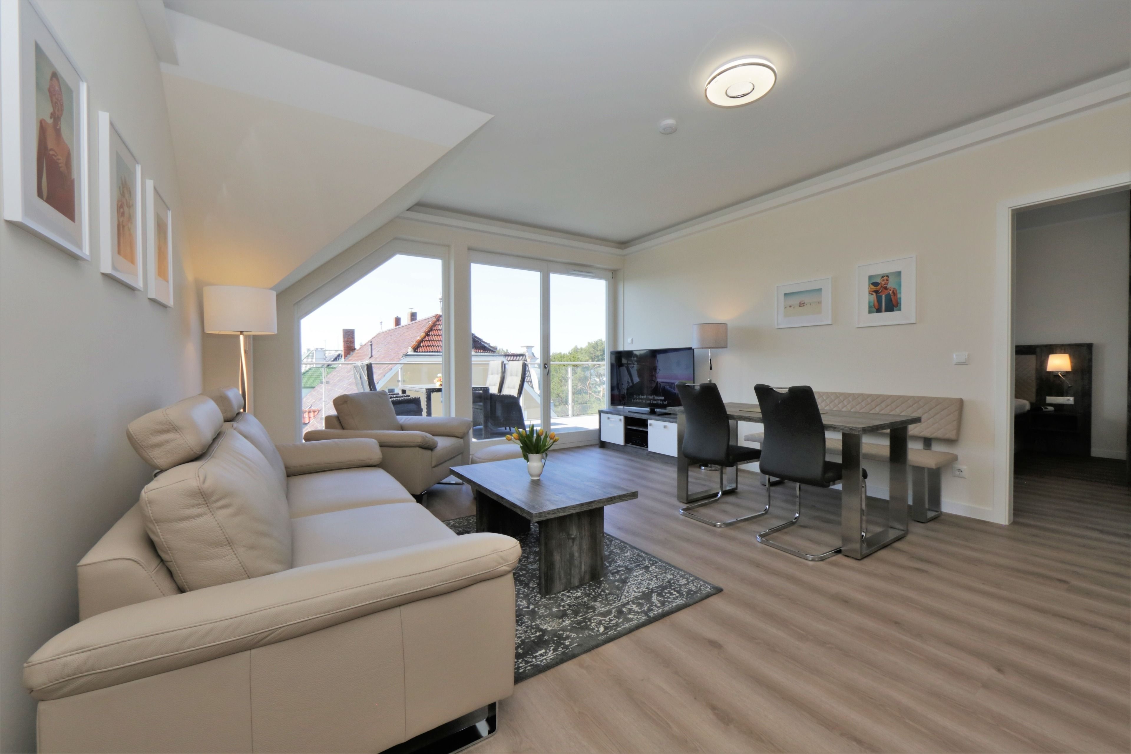 Dieses mit 78 qm großzügige 3-Zimmer Appartement befindet sich im Dachgeschoss der 2018 neu erbauten Strandresidenz und bietet 4 Personen reichlich Komfort. Genießen Sie Ihren Urlaub direkt am Meer in dieser hochwertig und sehr geschmackvoll eingerichteten Wohnung. Im Wohnbereich mit großer Fensterfront erwartet Sie eine bequeme Polstergarnitur bestehend aus Sofa und Sessel, ein Couchtisch und Flat TV sowie ein Esstisch für gemeinsame Mahlzeiten. Ein Gaskamin sorgt für Gemütlichkeit und zusätzliche Wärme bei Bedarf. Die moderne Küche mit Cerankochfeld, Backofen mit integrierter Mikrowelle, Geschirrspüler, Kühlschrank etc. ist ebenfalls offen im hinteren Wohnbereich integriert. Beide Schlafzimmer verfügen jeweils über ein komfortables Doppelbett mit getrennten Matratzen (90 x 200), reichlich Schrankraum sowie einen eigenen TV. Über den Wohnbereich sowie eines der Schlafzimmer erreichen Sie den riesigen zum Südwesten ausgerichteten Balkon, der viele erholsame Sonnenstunden und Mahlzeiten im Freien verspricht. Genießen Sie den Blick auf die Promenade und auf die Ostsee zwischen den Baumkronen hindurch. Die Glaseinfassung am Balkon schützt Sie vor möglichem Wind. Beide Badezimmer sind mit einer bodengleichen Dusche mit Echtglasabtrennung und Waschtisch/WC ausgestattet.