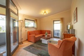 Diese mit italienischen Stilmöbeln eingerichtete 3-Zimmer Wohnung ist 67m² groß und befindet sich im 1. Obergeschoss des an die Villa angrenzenden Neubaus. Die Wohnung ist komfortabel ausgestattet und bietet 4-5 Personen Platz für einen erholsamen Inselurlaub. Der großzügige helle Wohnraum bietet Ihnen eine gemütliche Sitzecke mit Sofa, Sessel, TV und Essplatz. Die Küchenzeile incl. Backofen, Ceranfeld, Kühlschrank, Geschirrspüler, Mikrowelle etc. ist offen im hinteren Bereich des Wohnraums integriert. Vom Wohnzimmer betreten Sie auch den westlich ausgerichteten Balkon, auf dem Sie den Tag mit einem Glas Wein ausklingen lassen können. Von hier aus können Sie auch einen teilweisen Blick auf das Meer erhaschen. Beide Schlafzimmer sind mit einem Doppelbett mit getrennten Matratzen (90 x 200) und einem Kleiderschrank eingerichtet. Den großen, überdachten, südlich ausgerichteten Balkon, der zu gemeinsamen Mahlzeiten einlädt, können Sie vom Wohnraum und vom größeren Schlafzimmer betreten. Das moderne Bad ist sowohl mit einer Dusche mit Echtglasabtrennung als auch mit einer Badewanne, Doppelwaschbecken und WC ausgestattet. Außerdem steht ein Gäste-WC zur Verfügung. Der Pkw- Stellplatz befindet sich auf dem Grundstück und ist der Wohnung zugeordnet.