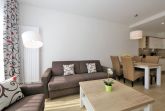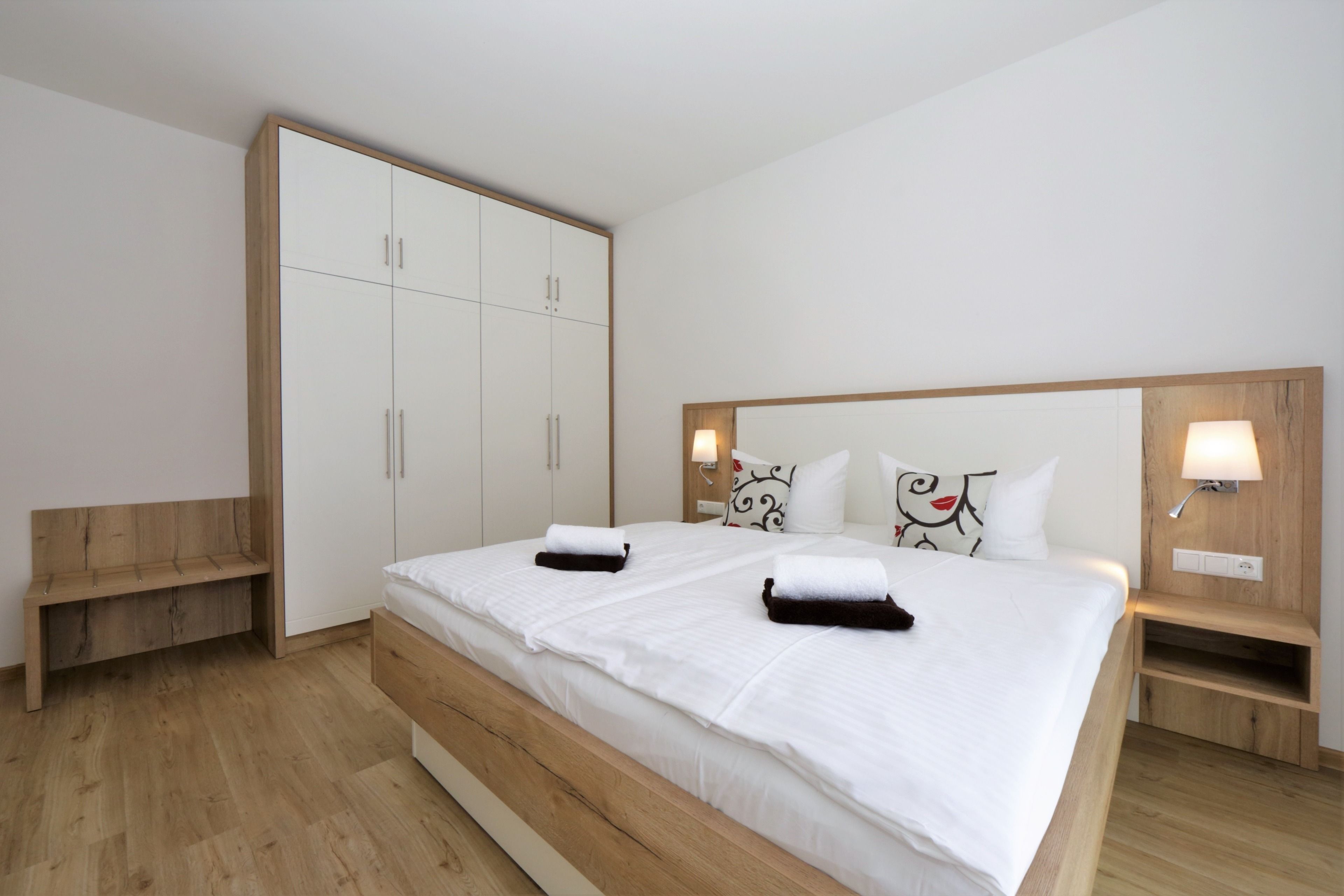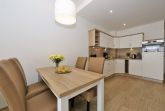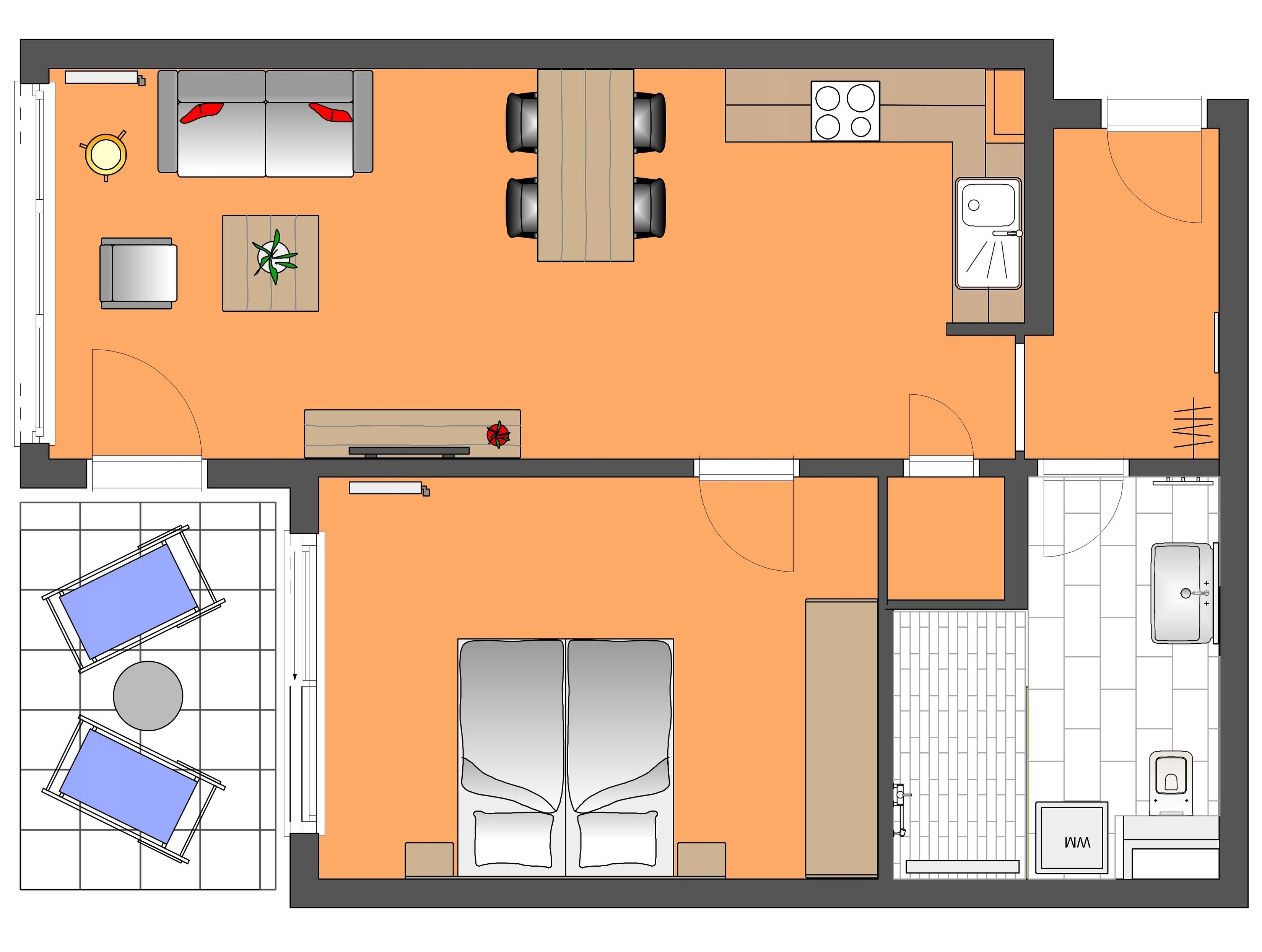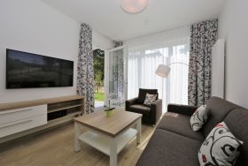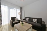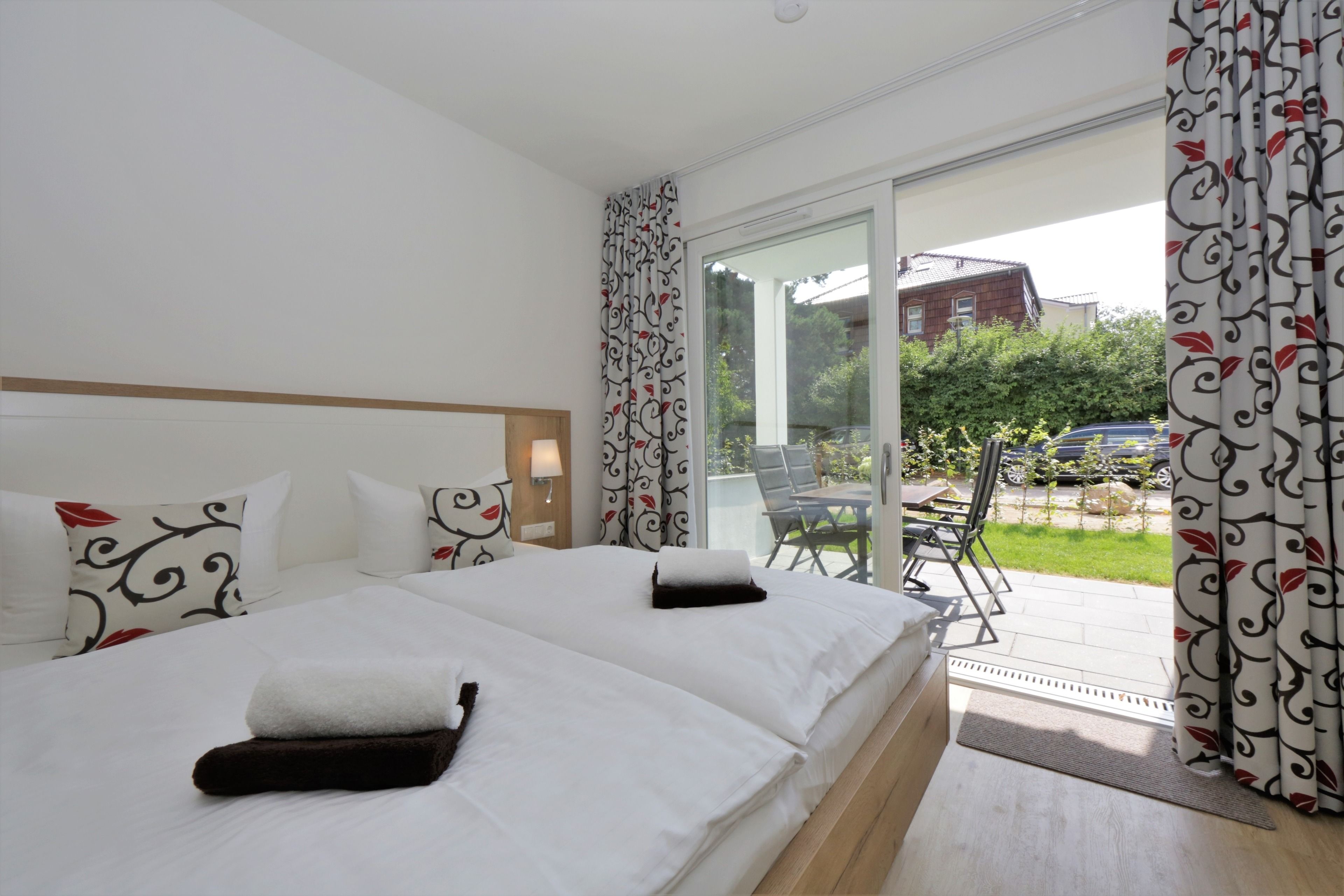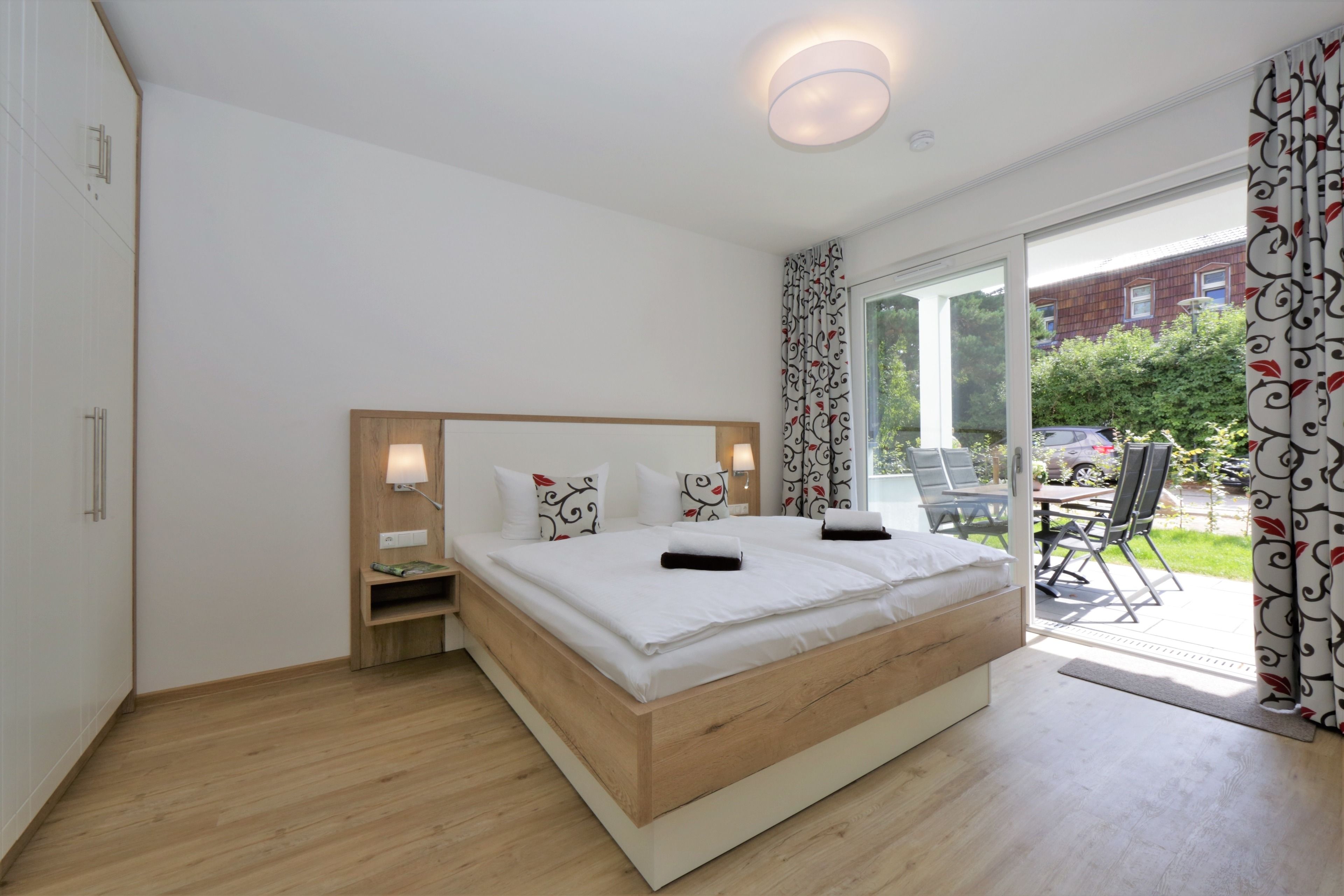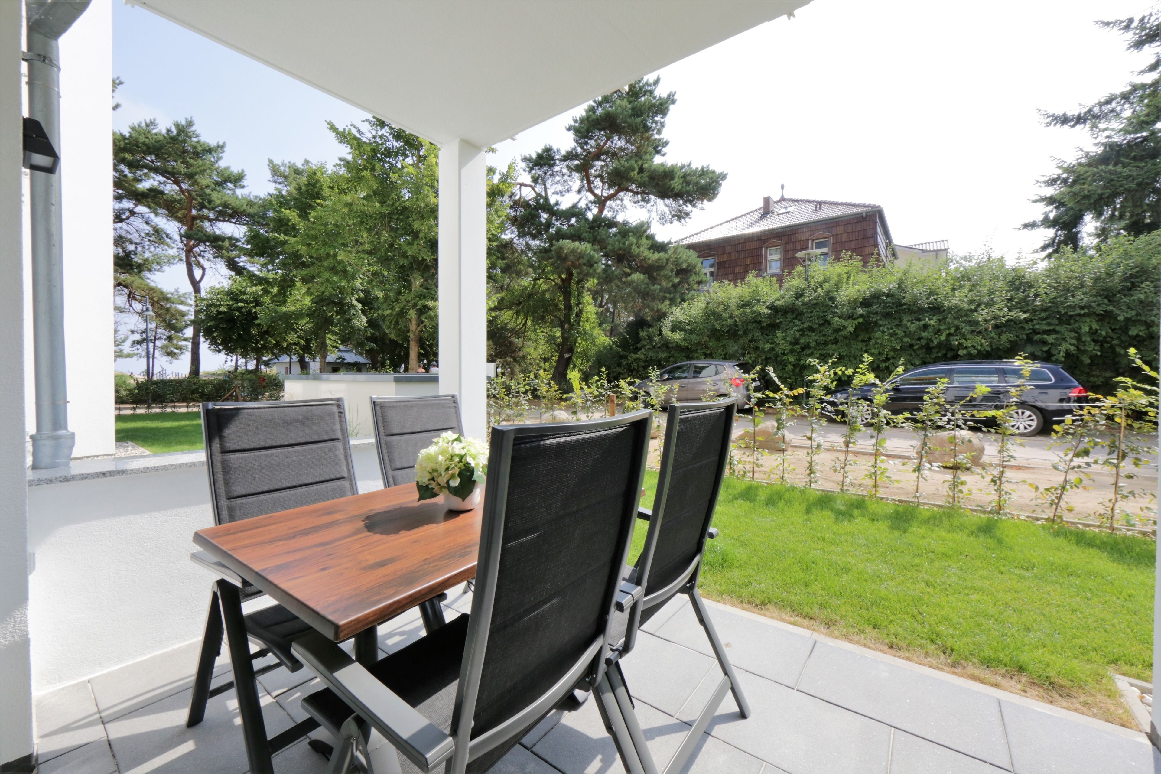 Diese moderne 2-Zimmer Wohnung mit 55 m² Wohnfläche befindet sich im Erdgeschoss der Strandresidenz. Die überdachte Terrasse mit östlicher Ausrichtung lockt die Gäste schon zum Frühstück ins Freie. Von hier genießen Sie den Blick auf die Promenade und in Höhe Strandzugang können Sie einen Blick auf die Ostsee erhaschen. Die Wohnung ist individuell und komfortabel ausgestattet und bietet 2-4 Personen Platz für einen erholsamen Urlaub am Meer. Der offene Wohnraum bietet Ihnen eine gemütliche Sitzecke mit einem bequemen Sofa mit Schlaffunktion (Matratze 160 x 200), Sessel und Flat TV. Die Küchenzeile incl. Backofen, Ceranfeld, Kühlschrank, Geschirrspüler, Mikrowelle etc. sowie der Essplatz sind ebenfalls offen im Wohnraum integriert. Das geräumige Schlafzimmer (mit zusätzlichen TV) ist mit einem Doppelbett mit getrennten Matratzen (90 x 200) und einem großen Kleiderschrank eingerichtet. Die Terrasse lässt sich sowohl vom Wohn- als auch vom Schlafzimmer betreten. Das großzügige, moderne Bad ist mit einer ebenerdigen Dusche mit Echtglasabtrennung und Waschtisch/WC ausgestattet.