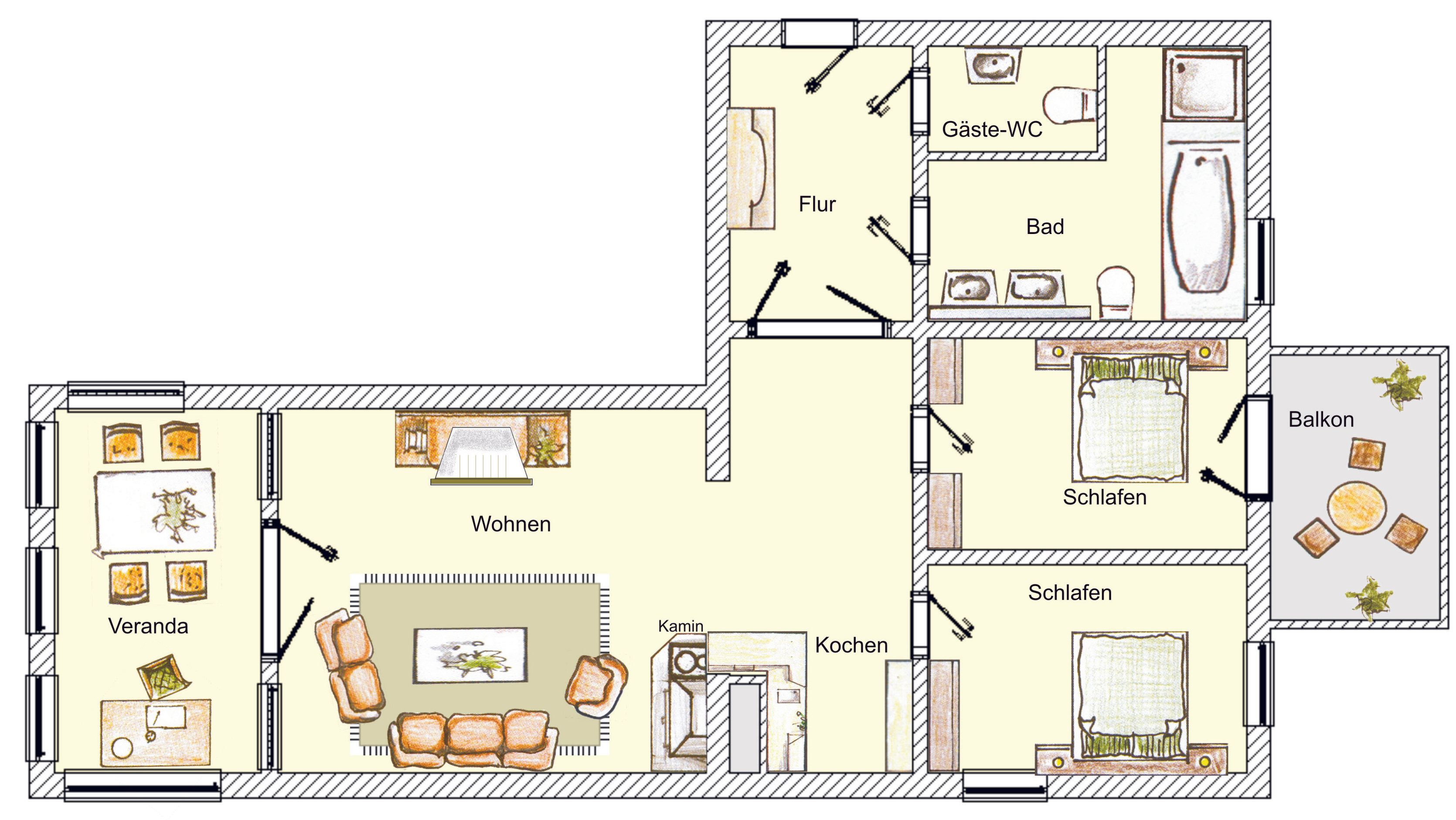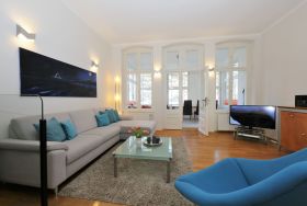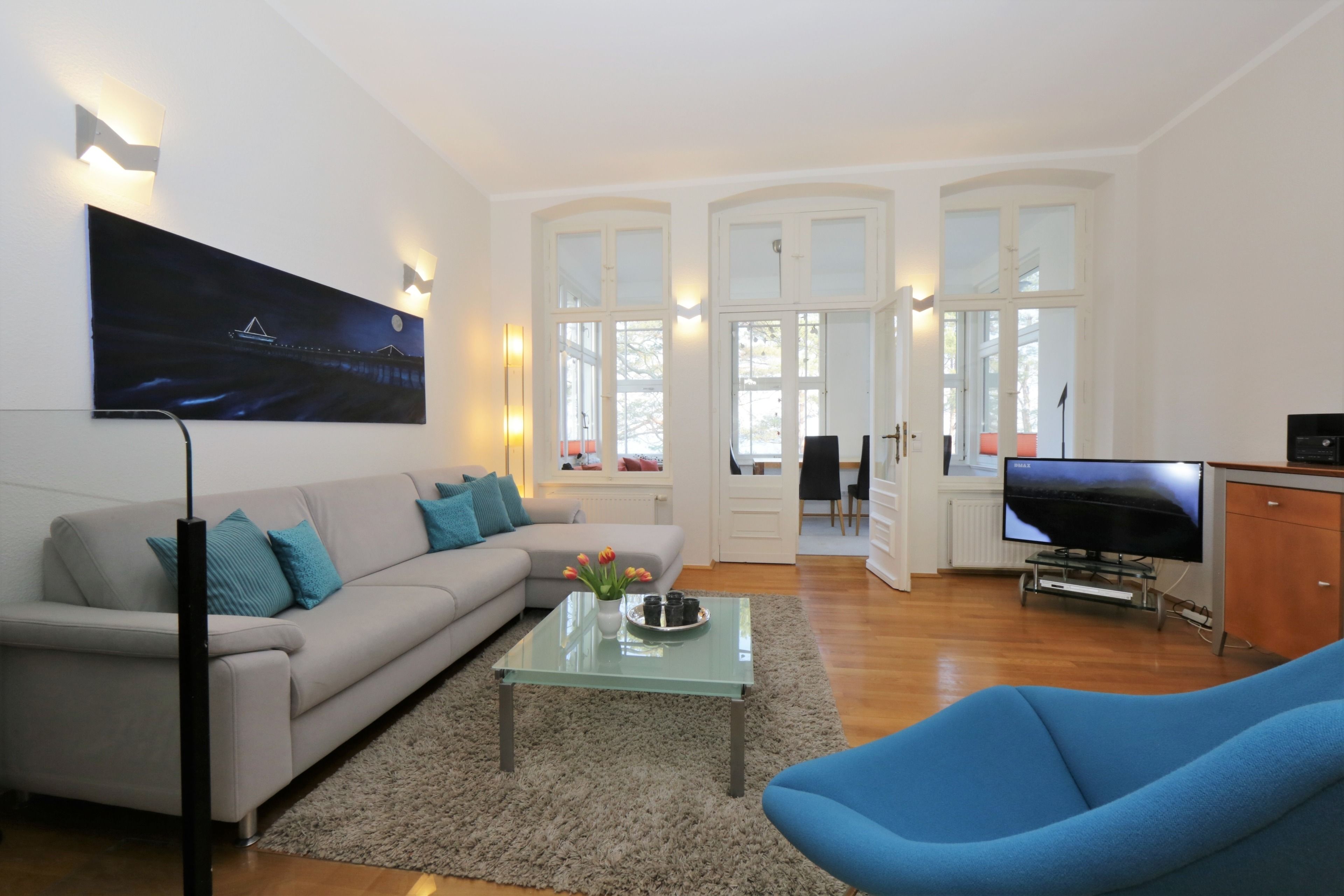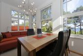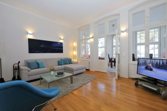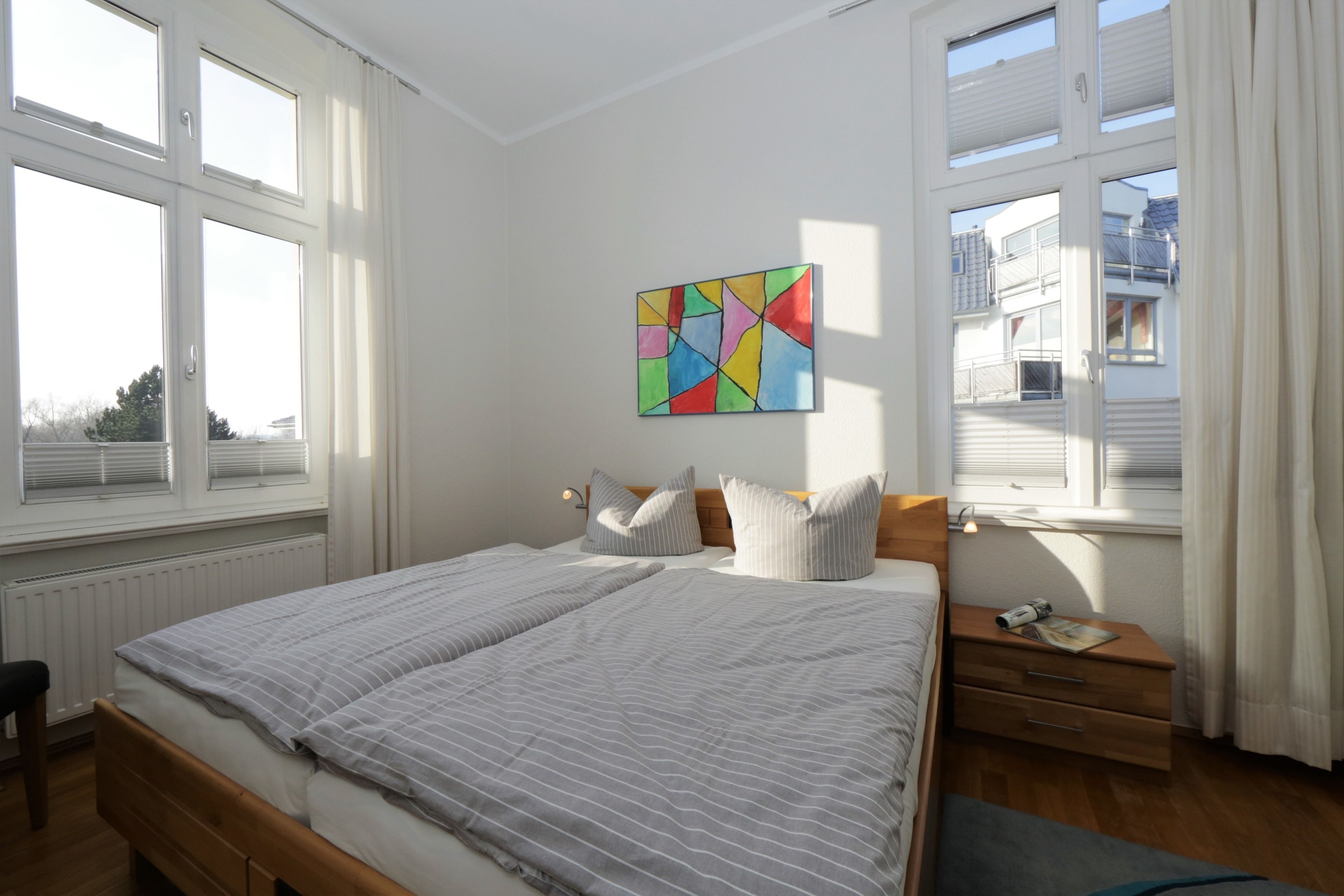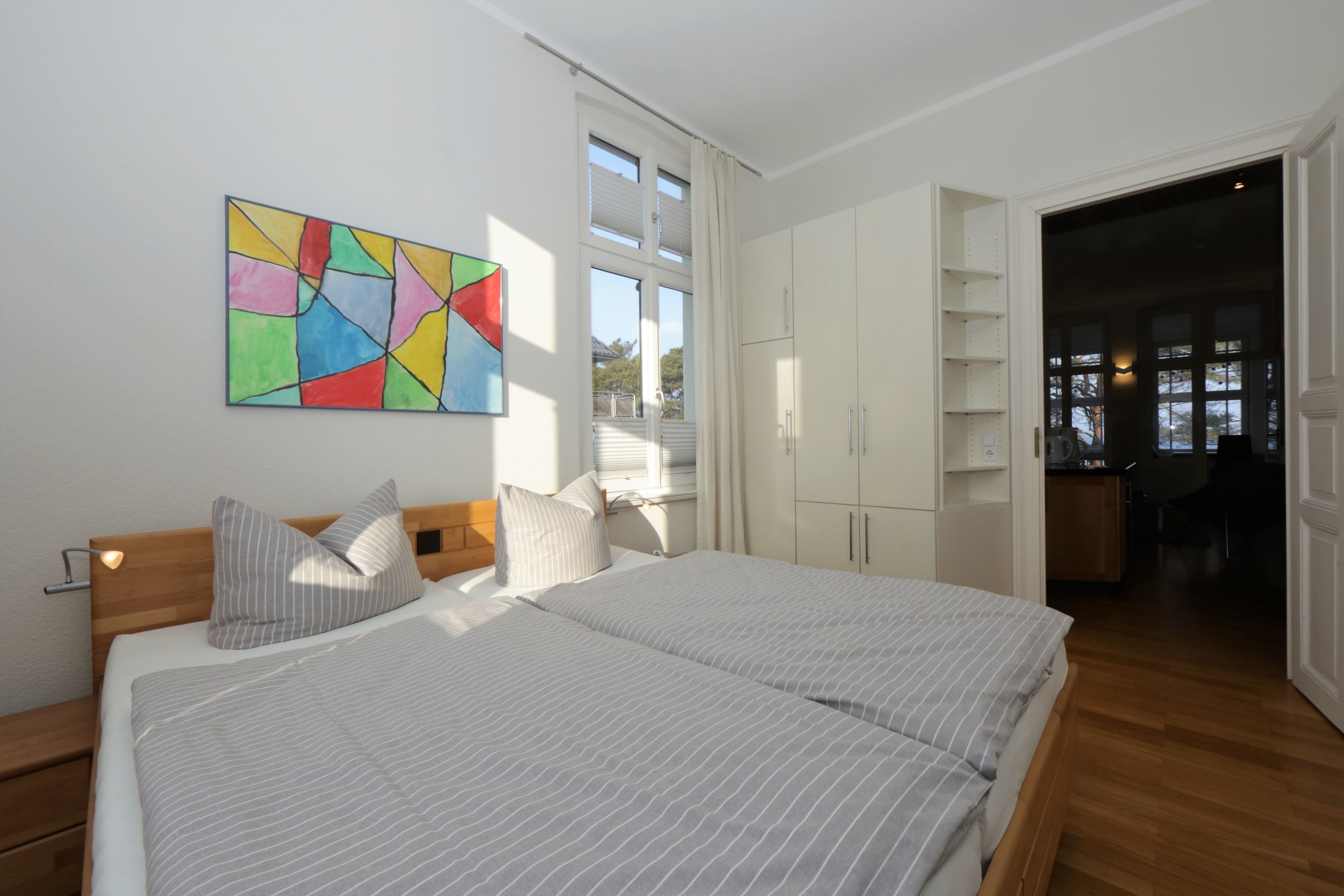 Dieses moderne, mit 89 qm großzügige 3-Zimmer Appartement befindet sich im 1.Obergeschoss und ist für 4 bis 5 Personen geeignet. Im hell eingerichteten Wohnbereich erwartet Sie eine behagliche Polsterecke zum Relaxen, Couchtisch und Flat-TV/DVD, CD/Radio. Ein moderner Kamin schafft Behaglichkeit und Romantik an rauen Ostseetagen in der dunkleren Jahreszeit. Sämtliche Fußböden sind mit Echtholzparkett ausgestattet, Bad und Gäste- WC ausgeschlossen. In der an den Wohnbereich angrenzenden hellen Loggia lädt ein großer Essplatz zu gemeinsamen Mahlzeiten ein. Hier wird nach einem ausgiebigen Strandtag eine Tasse Kaffee getrunken und beratschlagt in welches der zahlreichen, umliegenden Restaurants zu Abend gegessen werden soll. Außerdem steht hier einer möglichen 5. Person ein Schlafplatz auf dem Sofa zur Verfügung. Aus der Loggia genießen Sie einen herrlichen Blick auf die Promenade und die Ostsee. Die im hinteren Wohnbereich integrierte Küchenzeile ist mit Cerankochfeld, Backofen, Geschirrspülmaschine, Kühlschrank, Mikrowelle etc. ausgestattet. Die hellen Schlafzimmer verfügen jeweils über ein komfortables Doppelbett mit getrennten Matratzen und einen großzügigen Kleiderschrank. Ein Balkon in südwestlicher Ausrichtung sichert Ihnen die Abendsonne und ist von einem der Schlafzimmer begehbar. Das moderne Badezimmer ist sowohl mit einer Dusche als auch einer Badewanne, einem Doppelwaschtisch und WC ausgestattet. Ein zusätzliches Gäste-WC steht zur Verfügung. Ein Pkw-Stellplatz befindet sich auf dem Grundstück und ist der Wohnung zugeordnet.