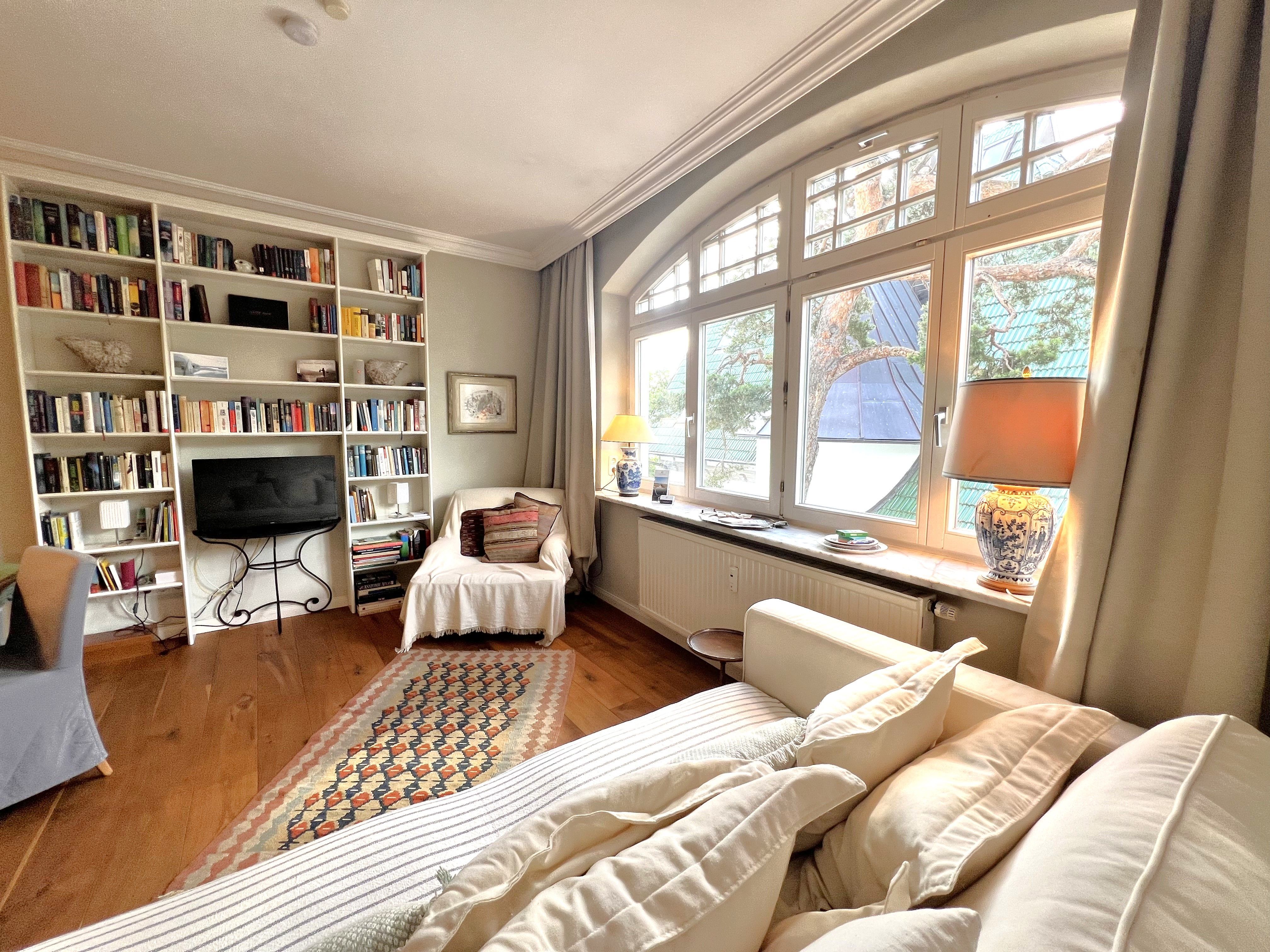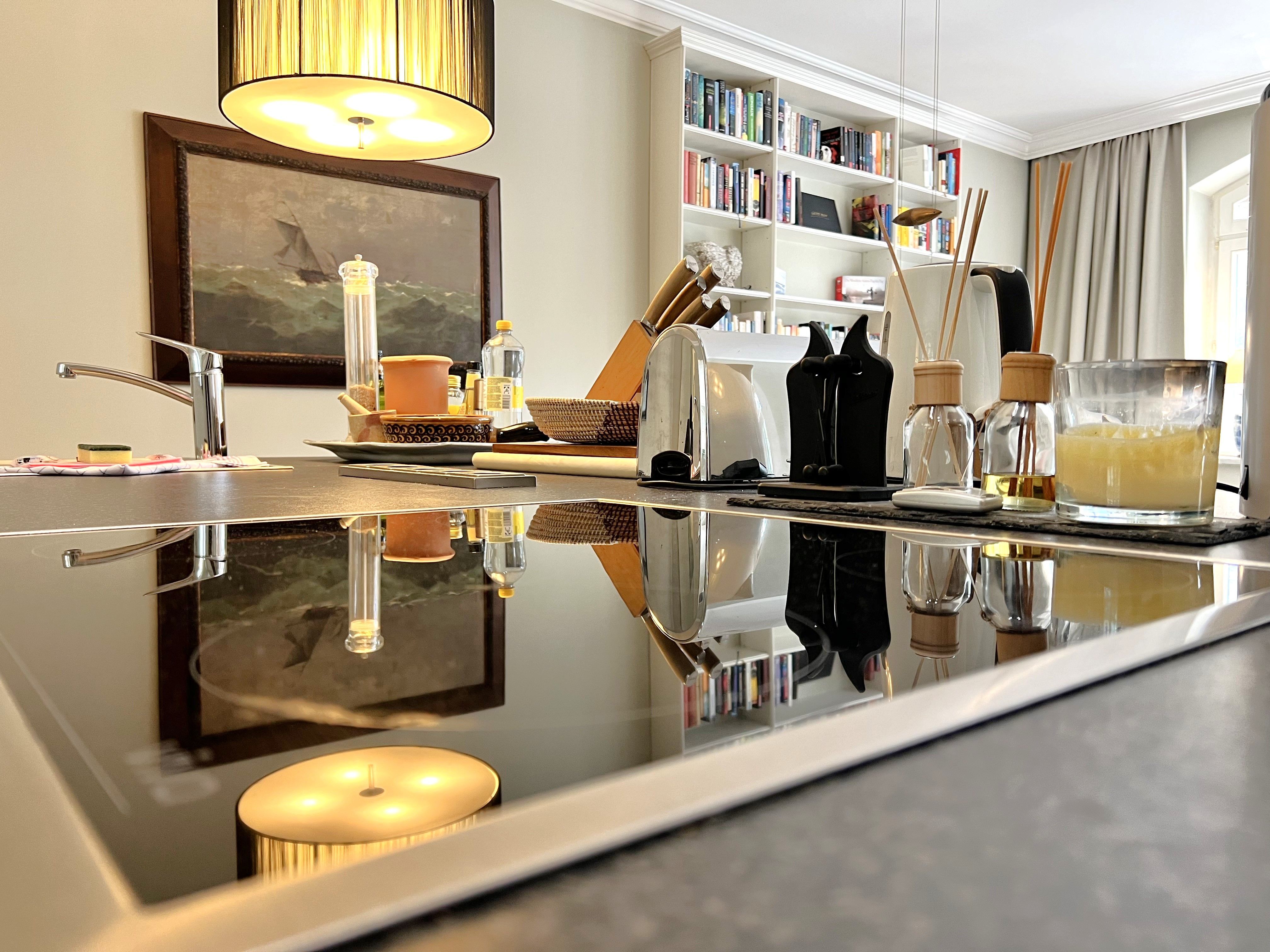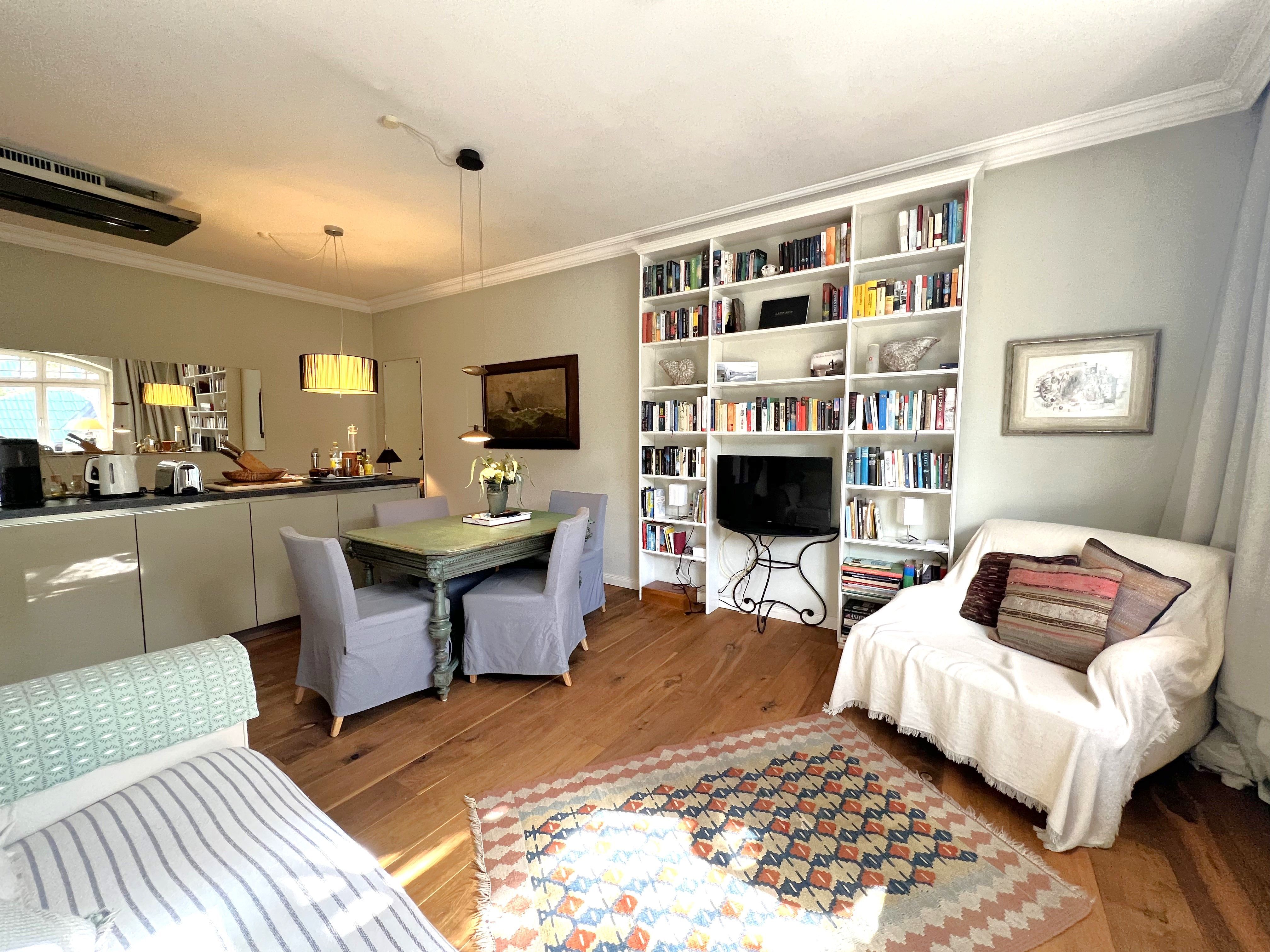 Der helle Wohnbereich mit offener Küche und Kücheninsel lädt zum Verweilen ein. Große Fenster lassen viel Licht herein und eröffnen einen seitlichen Blick aufs Meer. Liebevoll arrangierte Details, viele Bücher und ein harmonischer Materialmix sorgen für ein Gefühl von „Ankommen“. Im separaten Schlafzimmer mit einem fast märchenhaften Doppelbett sowie einem eigenen Ankleidebereich beginnt jeder Morgen stilvoll. Das moderne Badezimmer wurde geschmackvoll erneuert und fügt sich perfekt in das Gesamtbild ein.