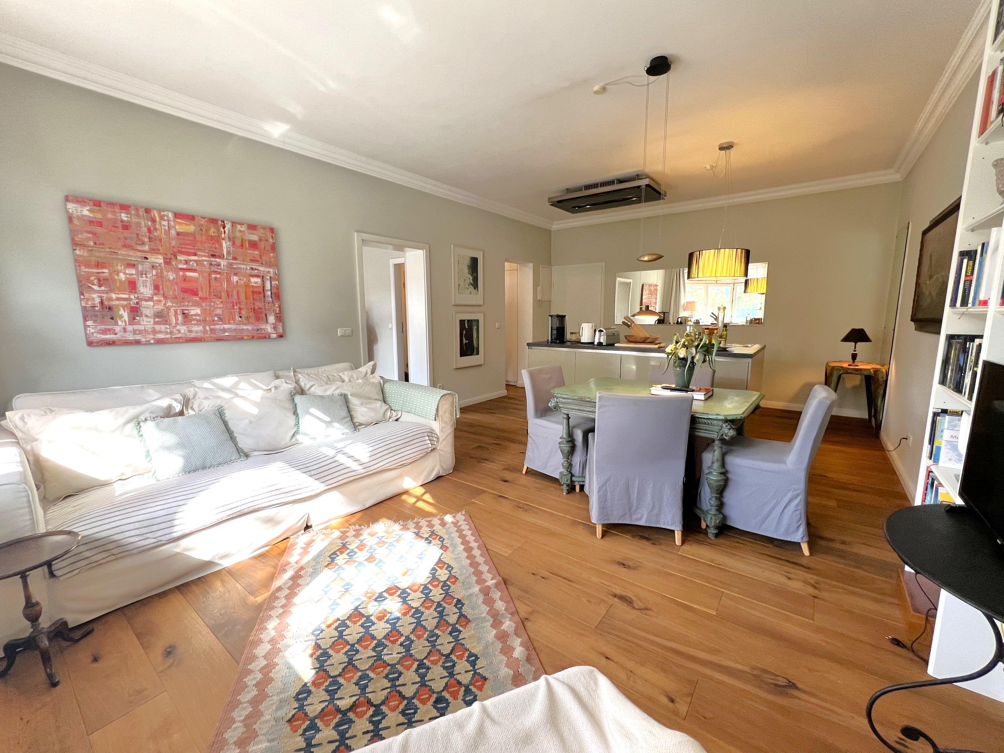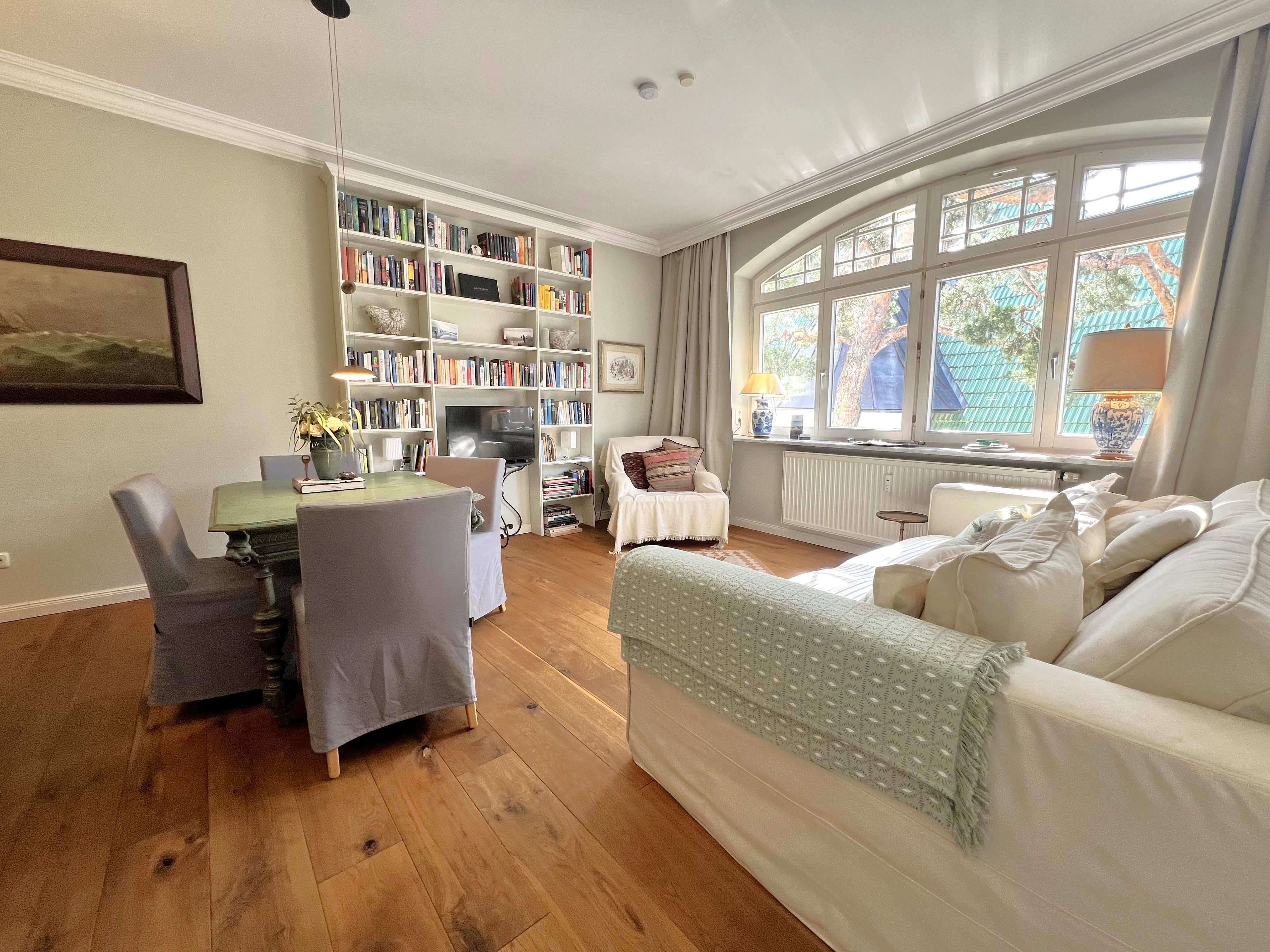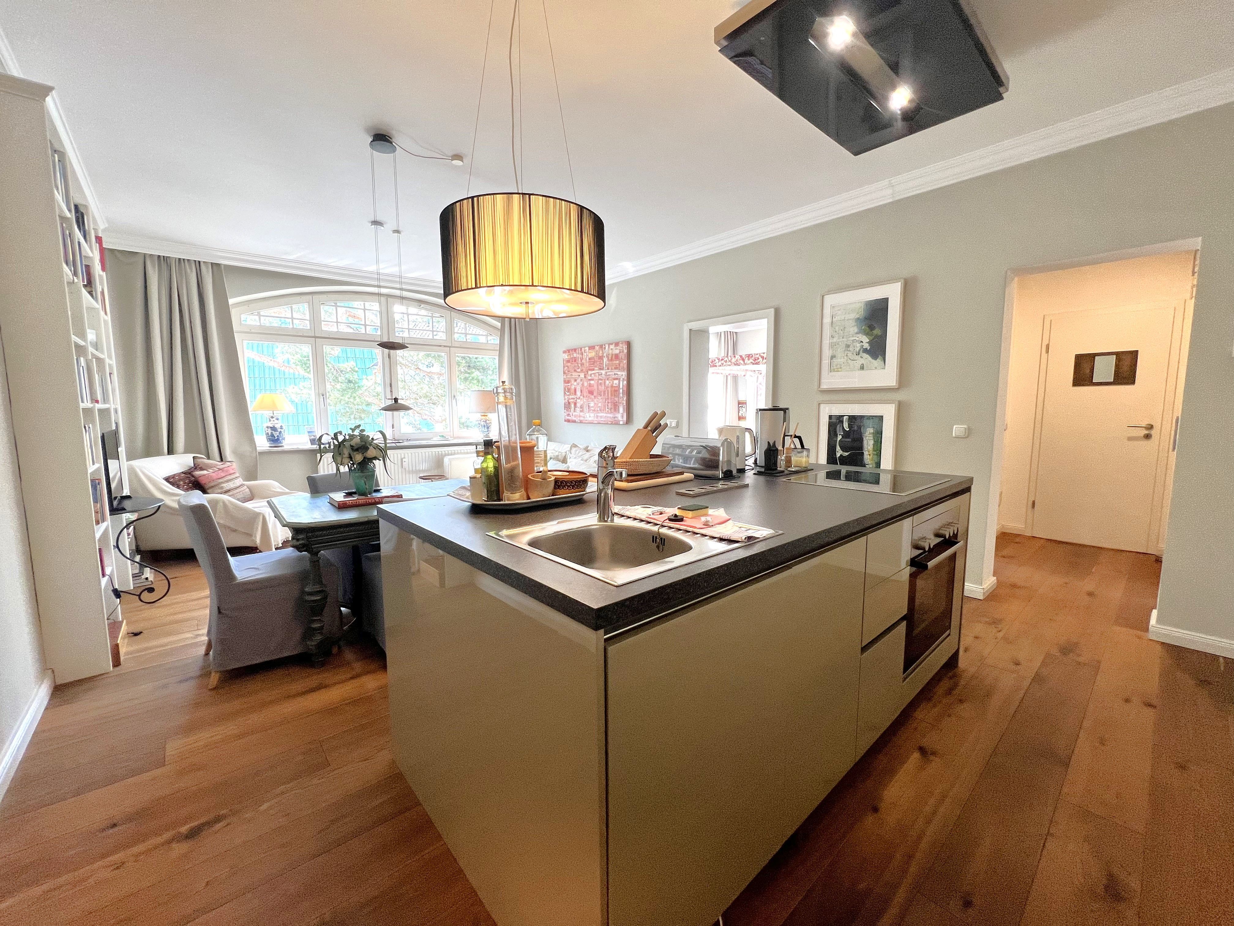 Der helle Wohnbereich mit offener Küche und Kücheninsel lädt zum Verweilen ein. Große Fenster lassen viel Licht herein und eröffnen einen seitlichen Blick aufs Meer. Liebevoll arrangierte Details, viele Bücher und ein harmonischer Materialmix sorgen für ein Gefühl von „Ankommen“. Im separaten Schlafzimmer mit einem fast märchenhaften Doppelbett sowie einem eigenen Ankleidebereich beginnt jeder Morgen stilvoll. Das moderne Badezimmer wurde geschmackvoll erneuert und fügt sich perfekt in das Gesamtbild ein.