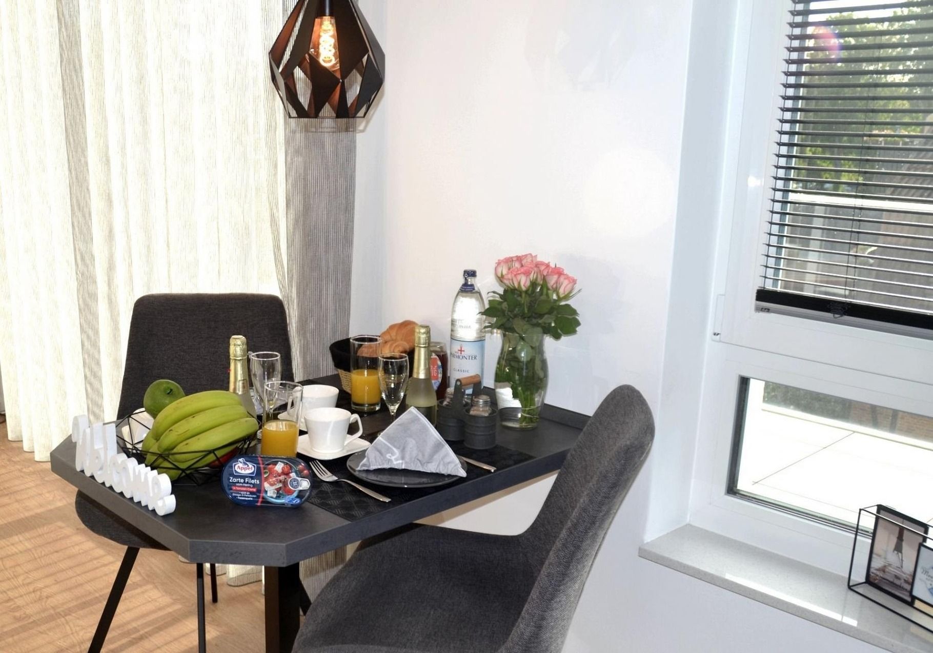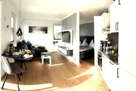 Das große, offen gestaltete Zimmer verbindet Wohnen, Schlafen, Kochen und Essen harmonisch miteinander und bietet nach einem Tag am nahegelegenen Sandstrand von Cuxhaven Duhnen den idealen Rahmen, um den Abend ausklingen zu lassen. Während Ihr Abendessen in der vollausgestatteten Küchenzeile köchelt, können Sie sich bereits auf der Couch entspannen oder den Esstisch decken.