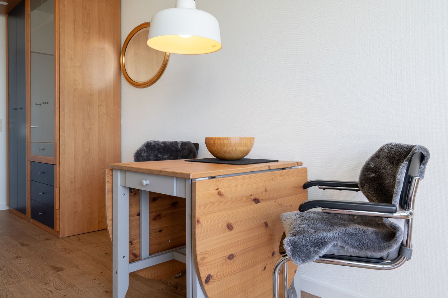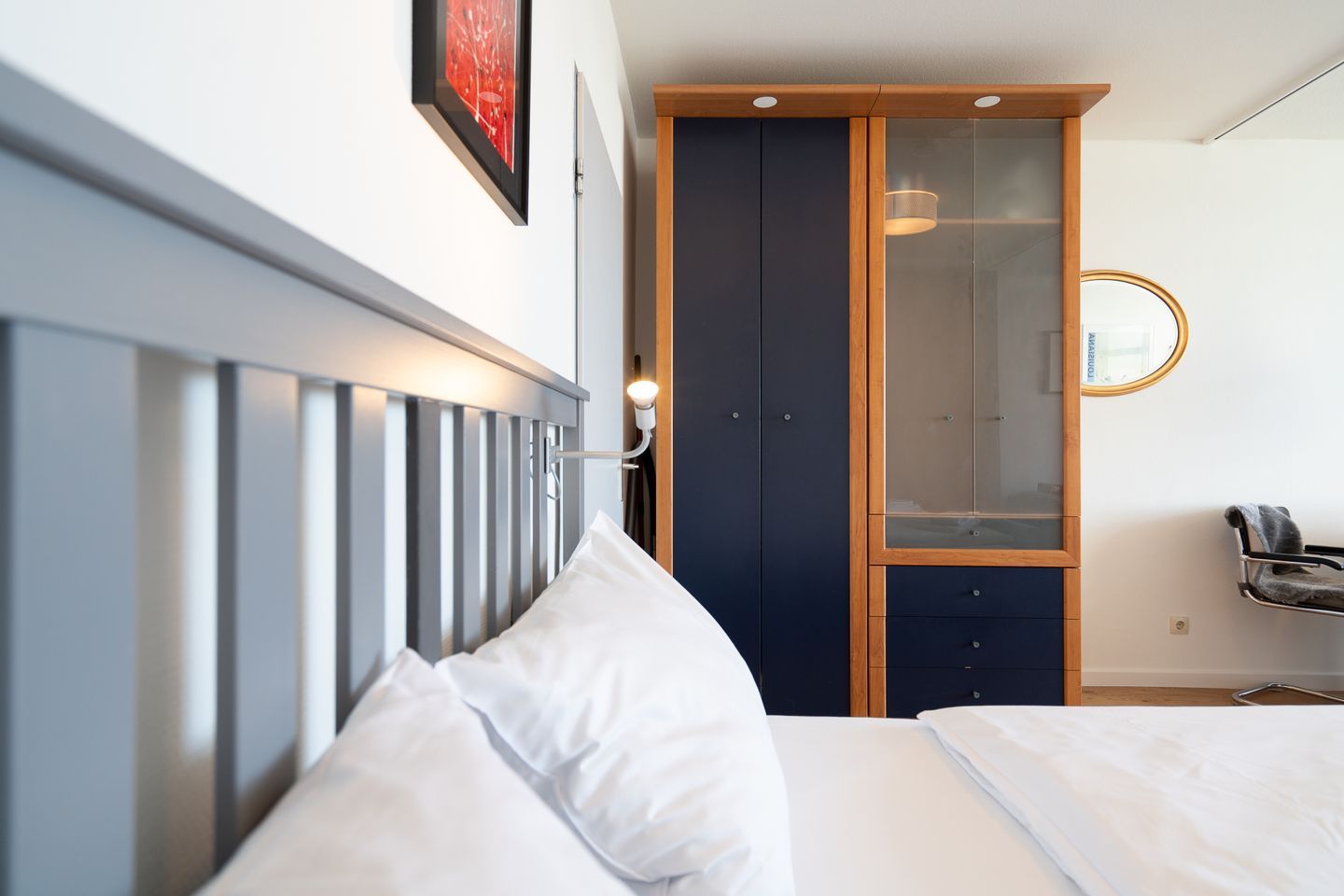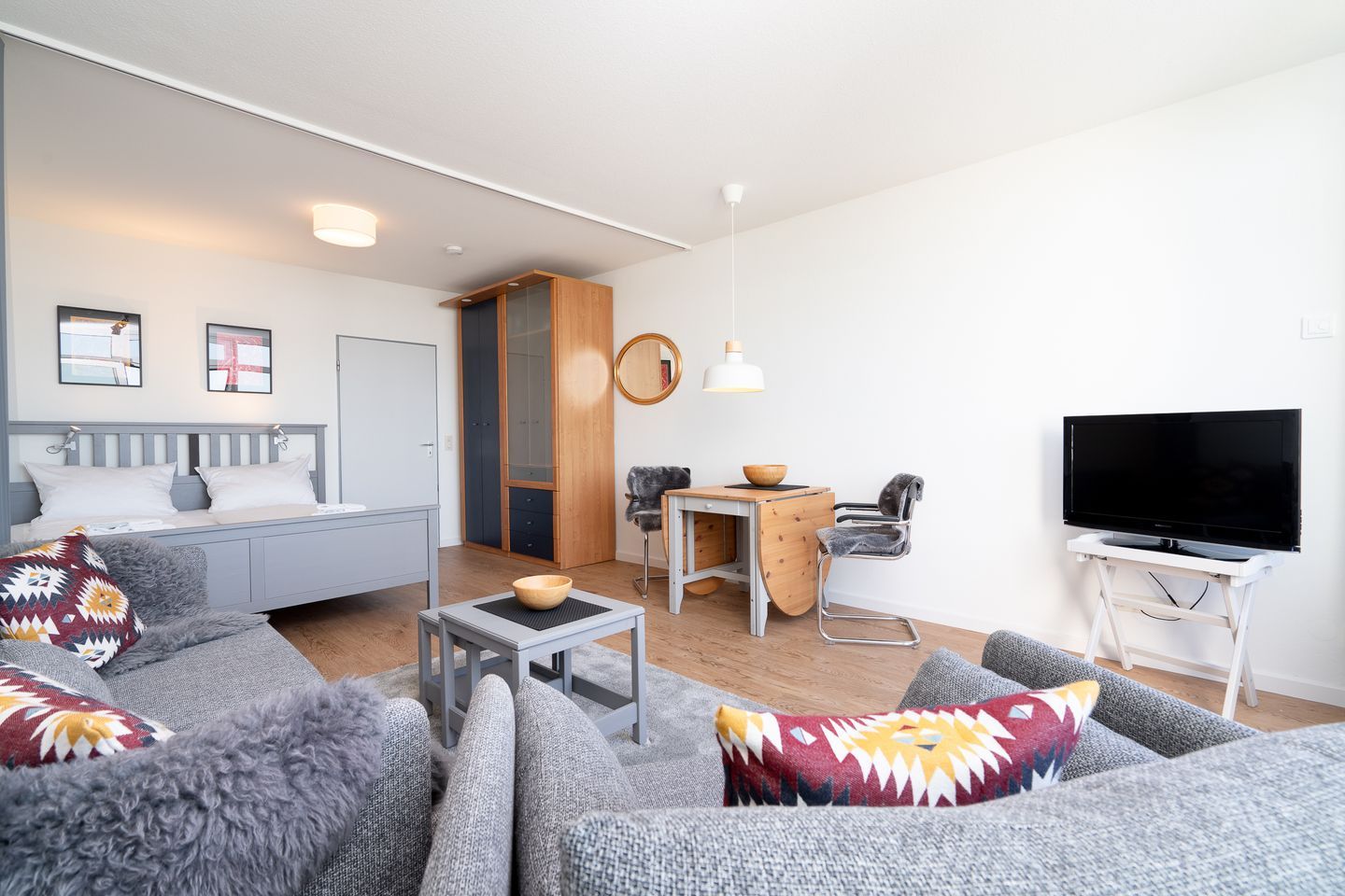 Auf 34 m² bietet die Wohnung Platz für zwei Personen und ist damit ideal für Paare oder Alleinreisende, die Ruhe, Meerblick und Komfort zu schätzen wissen. Der moderne Wohn- und Schlafraum vereint Gemütlichkeit und Funktionalität: mit einem bequemen Doppelbett, einem hellen Essbereich und einer stilvollen Einrichtung, die sofort Urlaubsstimmung aufkommen lässt.