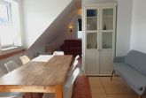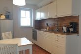 Die Küchen sind mit allem Notwendigem ausgestattet, wie Kühlschrank, Kochmöglichkeit, Wasserkocher, Toaster u.a. Im Wohn-/ Essbereich steht Ihnen in der oberen Wohnung ein großer Esstisch für 8 Personen zur Verfügung. Hier ist die Küche auch mit Backofen und Spülmaschine ausgestattet. Die Wohnungen im Erdgeschoss verfügen über eine nach Süden ausgerichtete Terrasse, die im Obergeschoss über einen Balkon mit Westausrichtung. Auch ein Grill ist nutzbar. Wir bitten jedoch diesen nach Gebrauch wieder zu reinigen. Die folgenden Mieter werden es Ihnen danken.