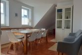 Die Wohnung im OG ist mit einem großen Esstisch für bis zu 8 Personen, einer modernen Küchenzeile mit einer Kühl-Gefrierkombination, einem Herd wie auch einem Geschirrspüler ausgestattet. Hier finden Sie auch 2 Bäder, einmal mit einer Dusche, einmal mit einer Badewanne.